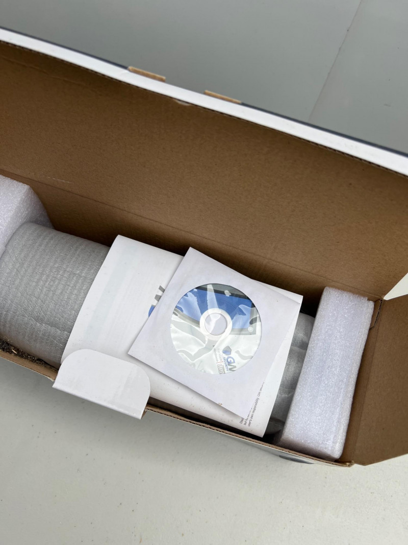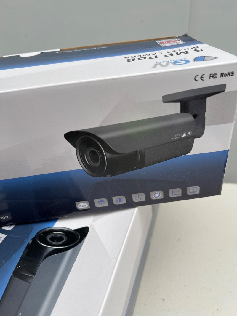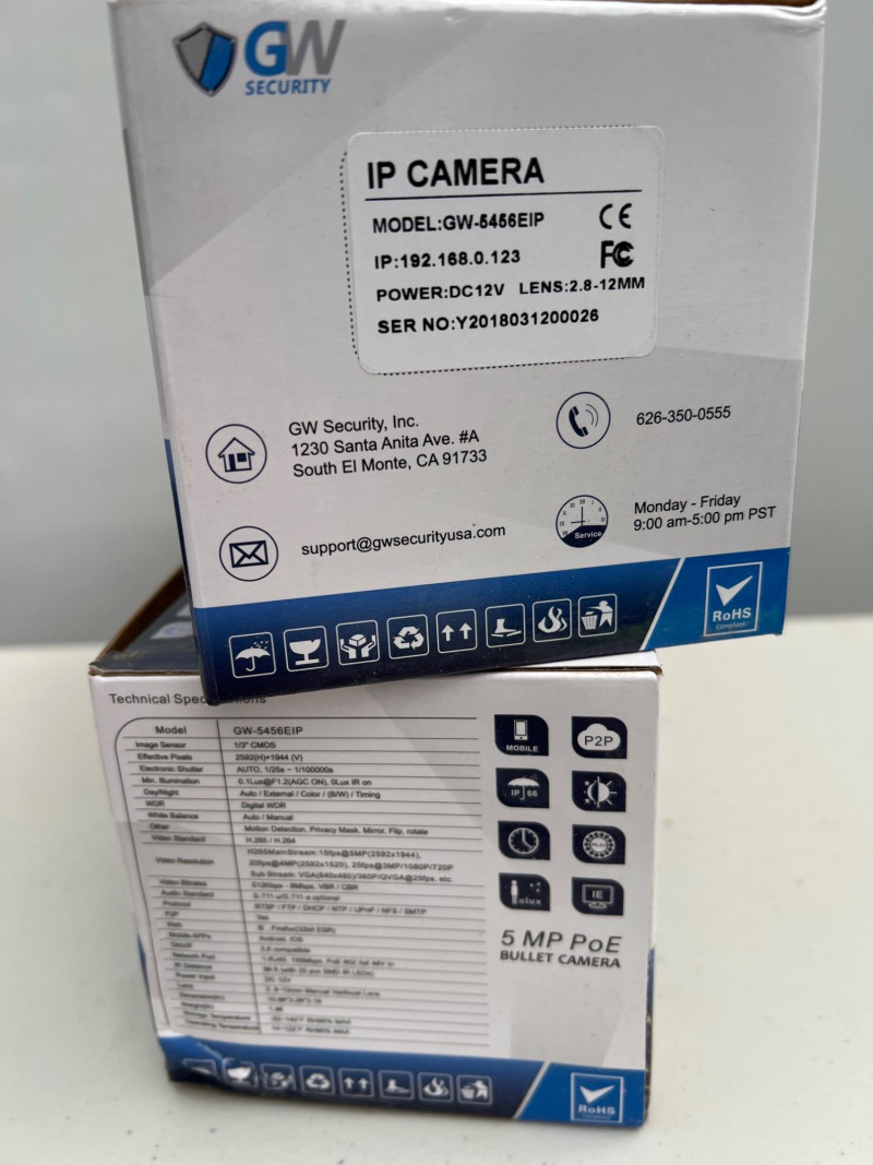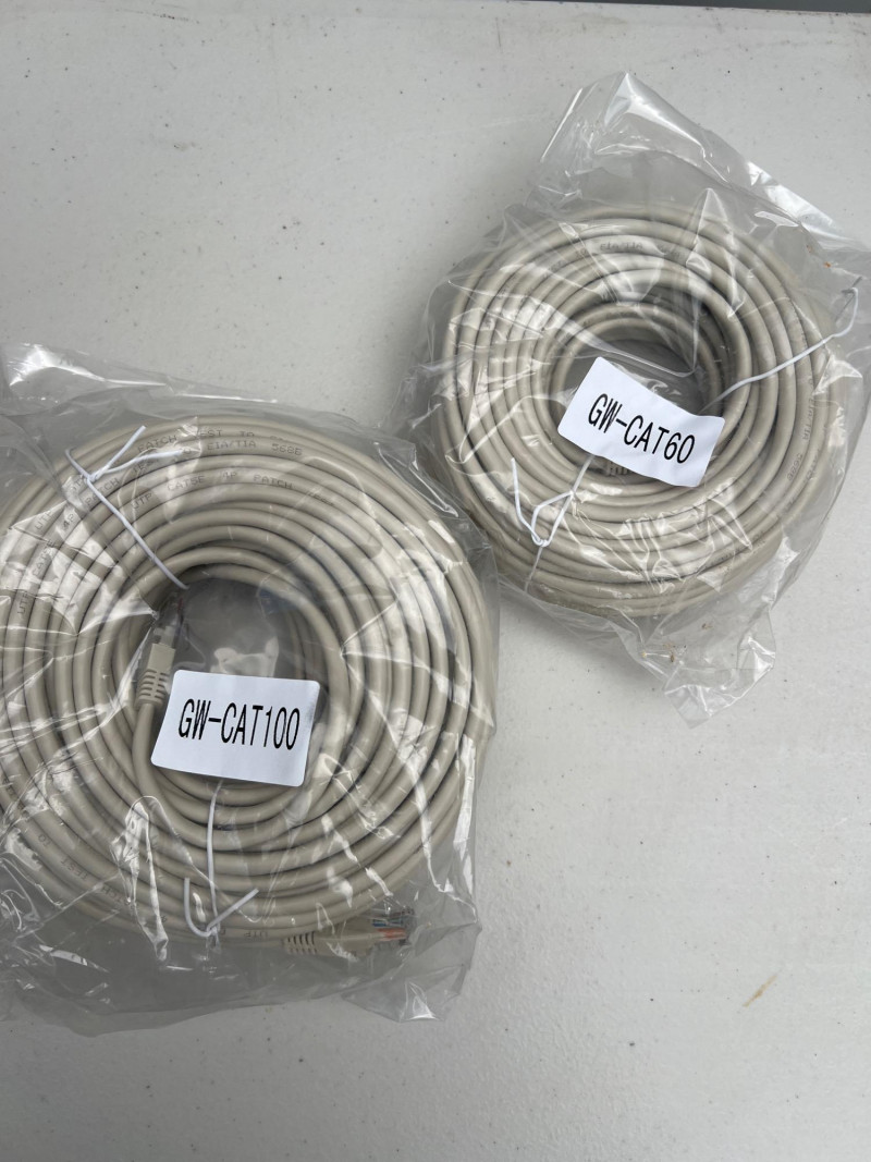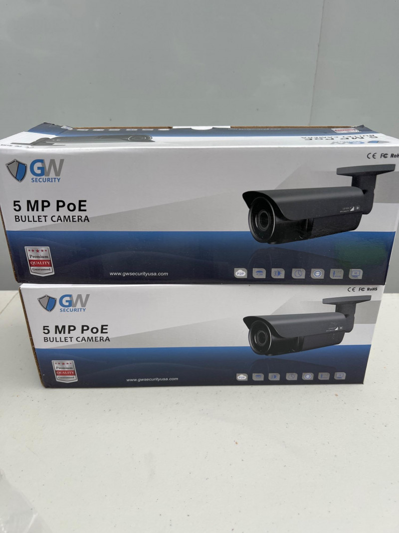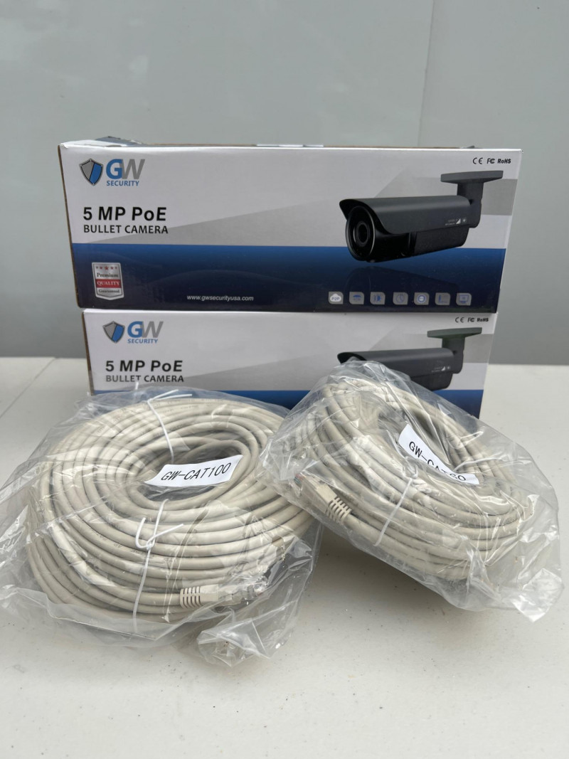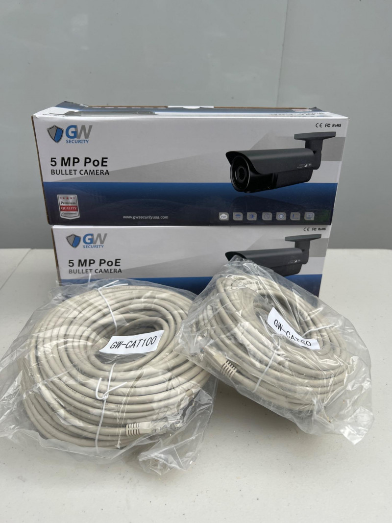 Set of GW Security bullet-style IP cameras, designed for wired installation. Includes approximately 100- and 60-foot CAT5e Ethernet cables, compatible with PoE (Power over Ethernet) systems. Cameras appear unused.