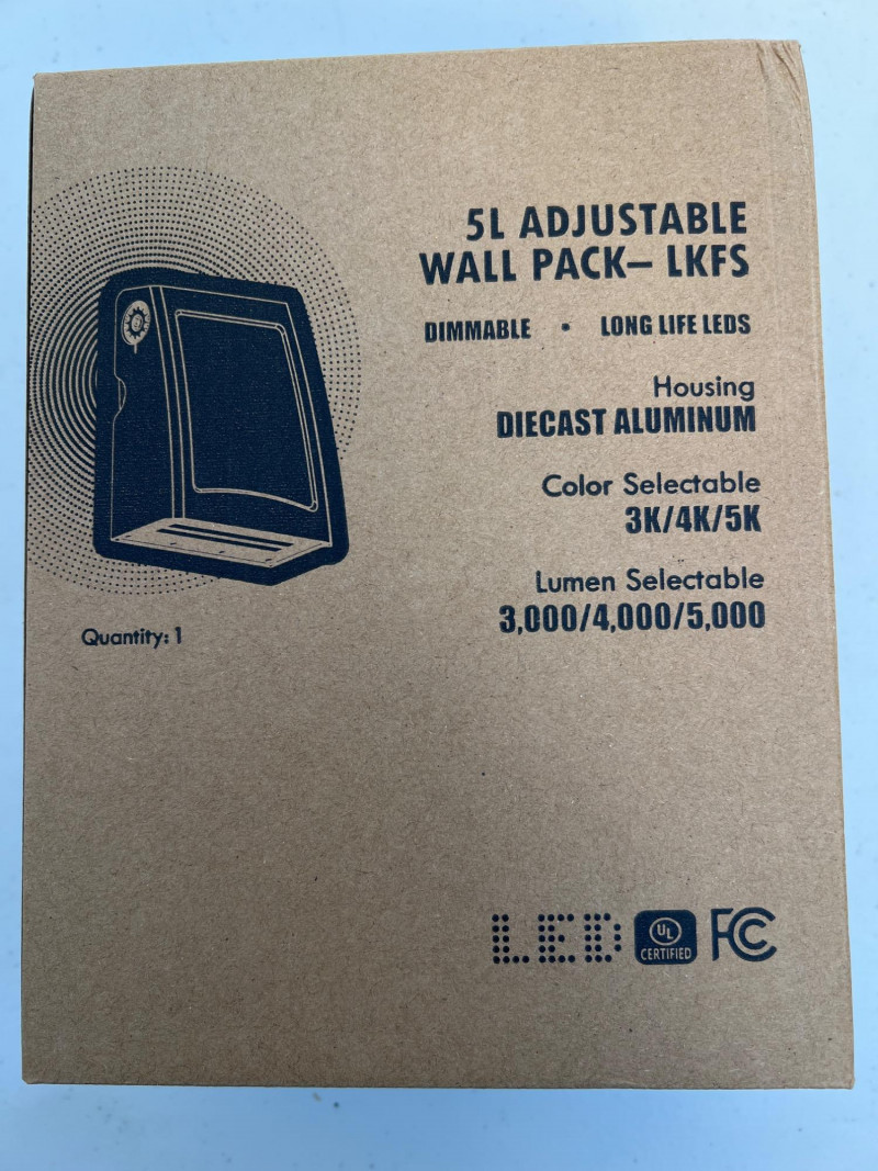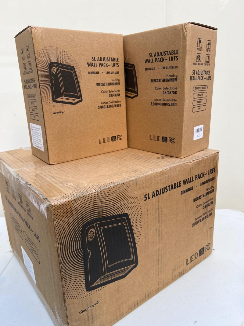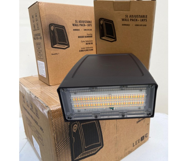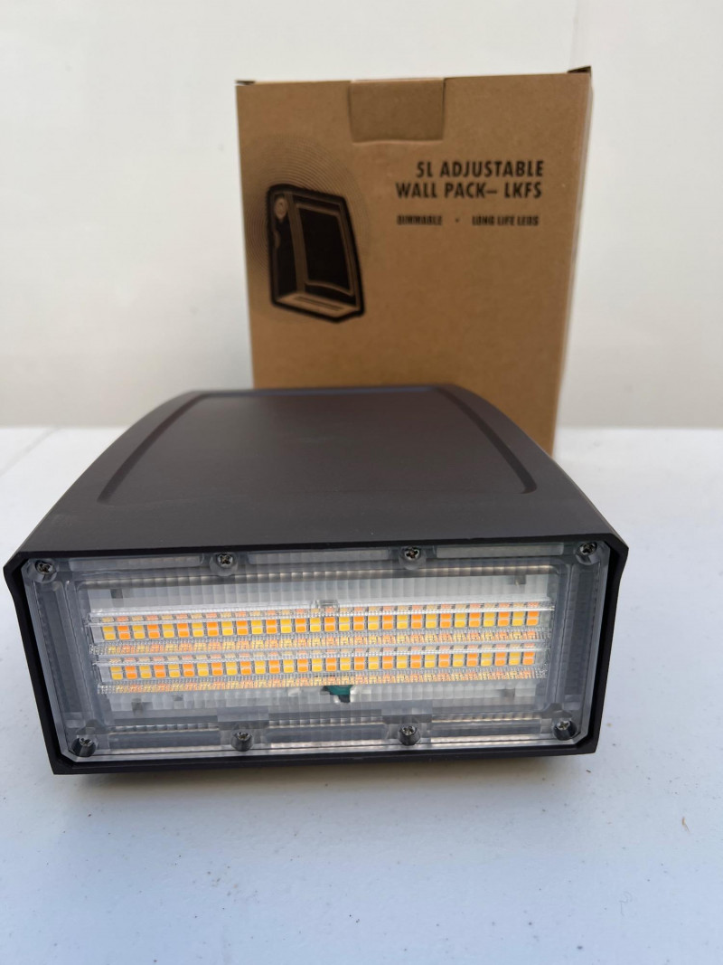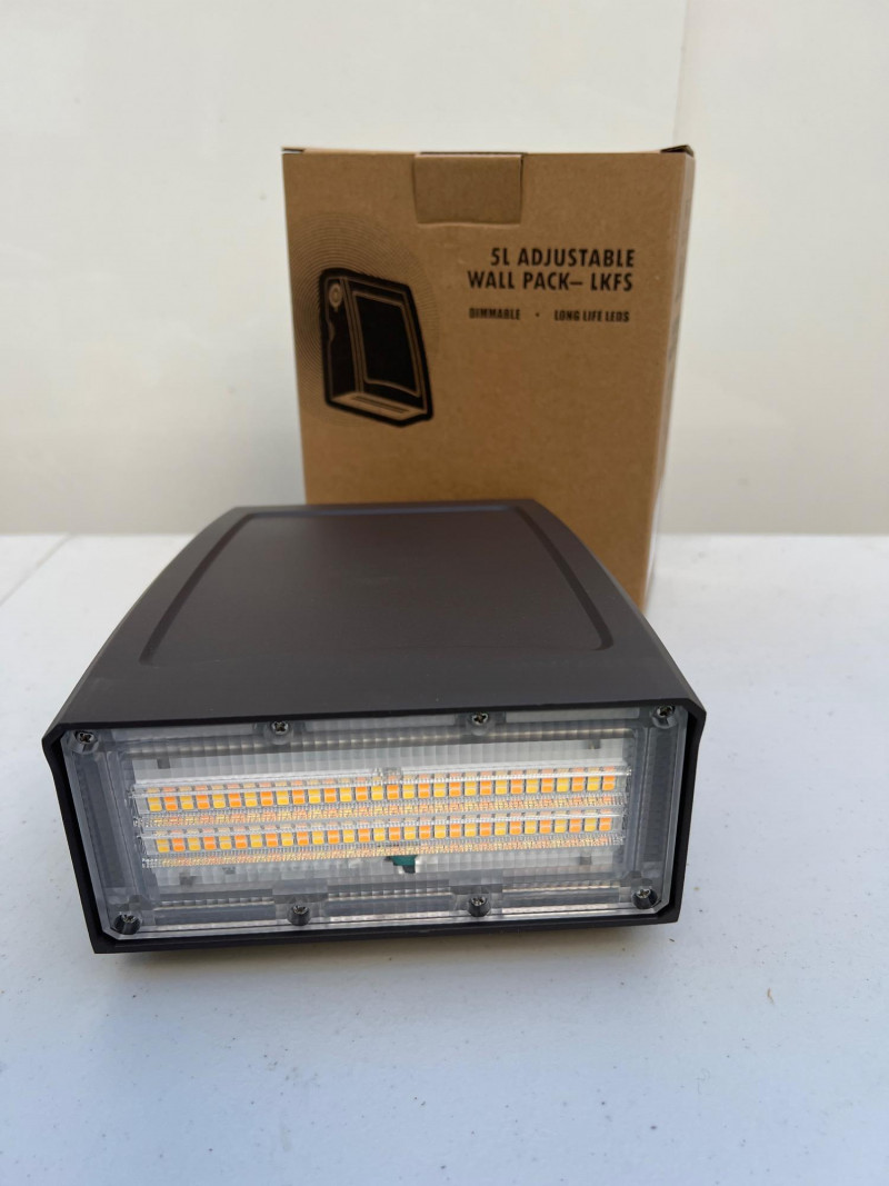 Eight adjustable wall pack lights, 5L model. Made of Diecast Aluminum and dimmable with 3 intensity choices. Designed for exterior lighting with durable housing and directional flexibility. Ideal for contractors or property managers.