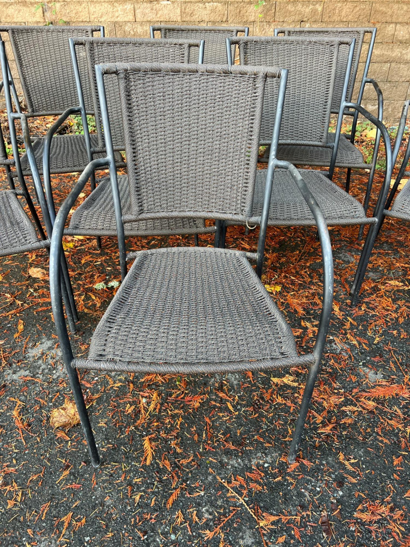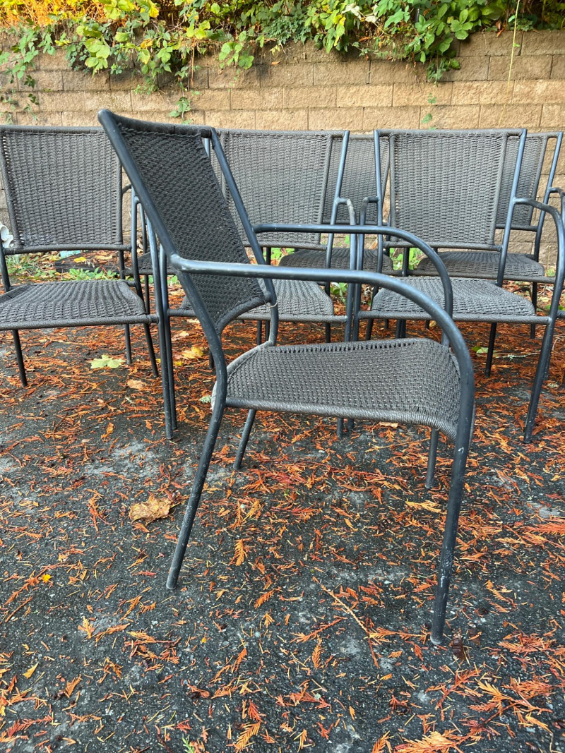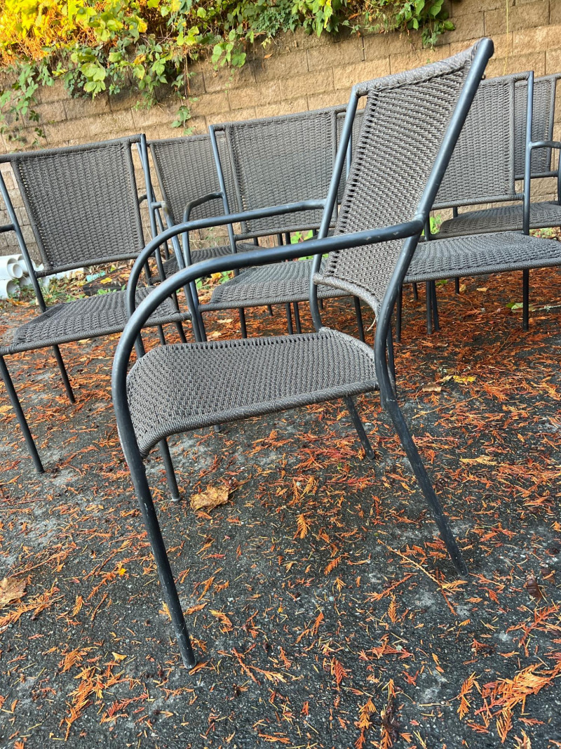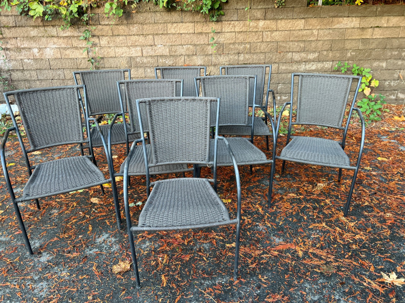 Eight matching outdoor patio chairs, all constructed with durable metal frames and a tightly woven mesh material. Designed for all-weather use, these chairs are lightweight, washable, and ideal for garden seating, shop break areas, or event setups. Their uniform design makes them perfect for coordinated outdoor arrangements. Quantity: 8 matching chairs Material: Metal frame with woven mesh Features: All-weather, washable, stackable Condition: Usable
