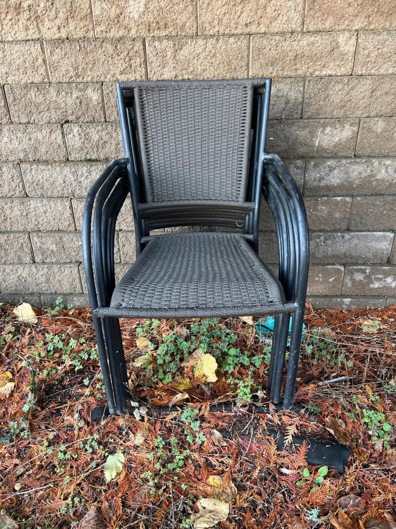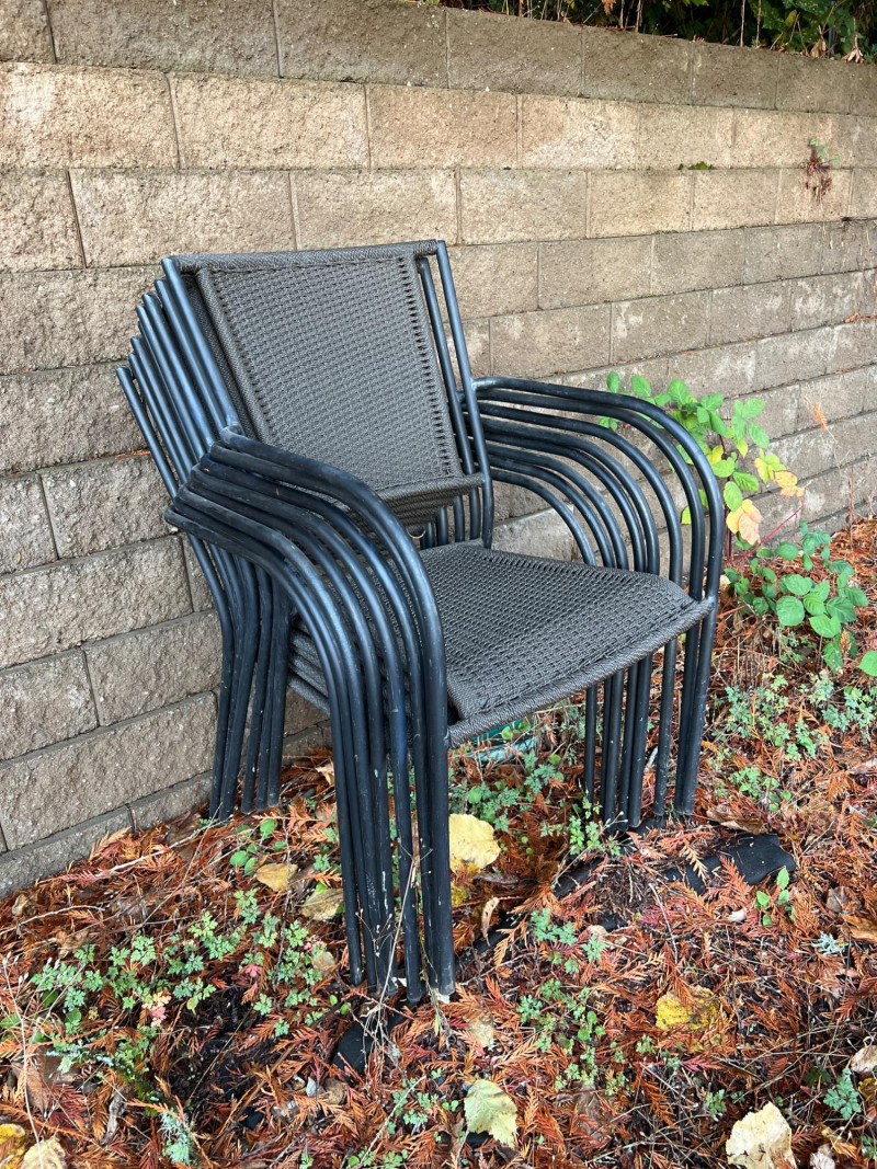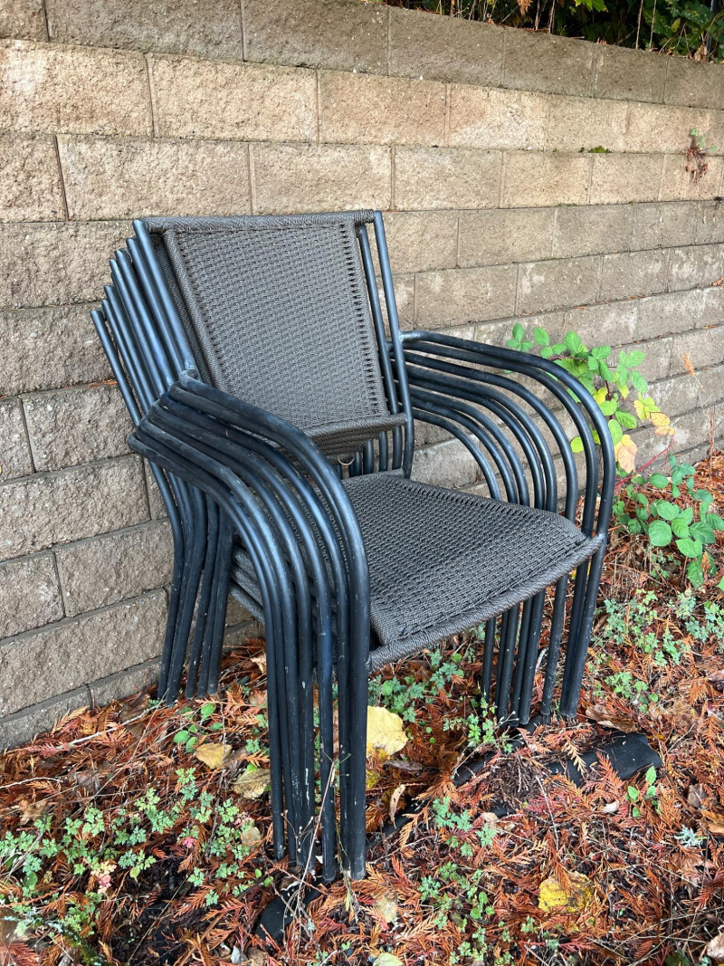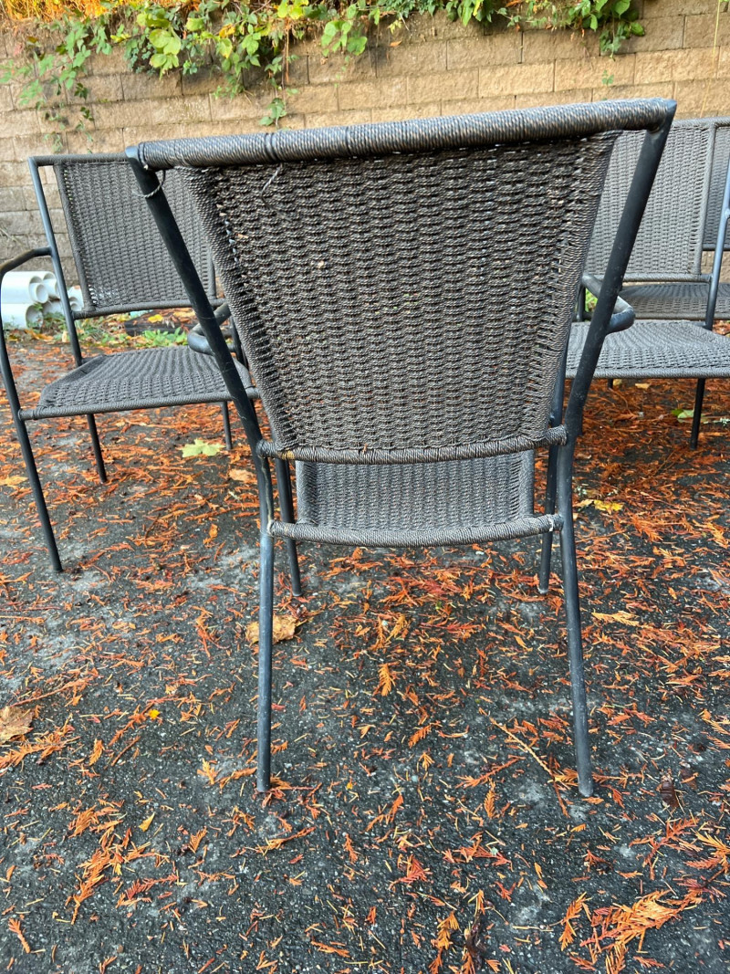 Eight matching outdoor patio chairs, all constructed with durable metal frames and a tightly woven mesh material. Designed for all-weather use, these chairs are lightweight, washable, and ideal for garden seating, shop break areas, or event setups. Their uniform design makes them perfect for coordinated outdoor arrangements. Quantity: 8 matching chairs Material: Metal frame with woven mesh Features: All-weather, washable, stackable Condition: Usable