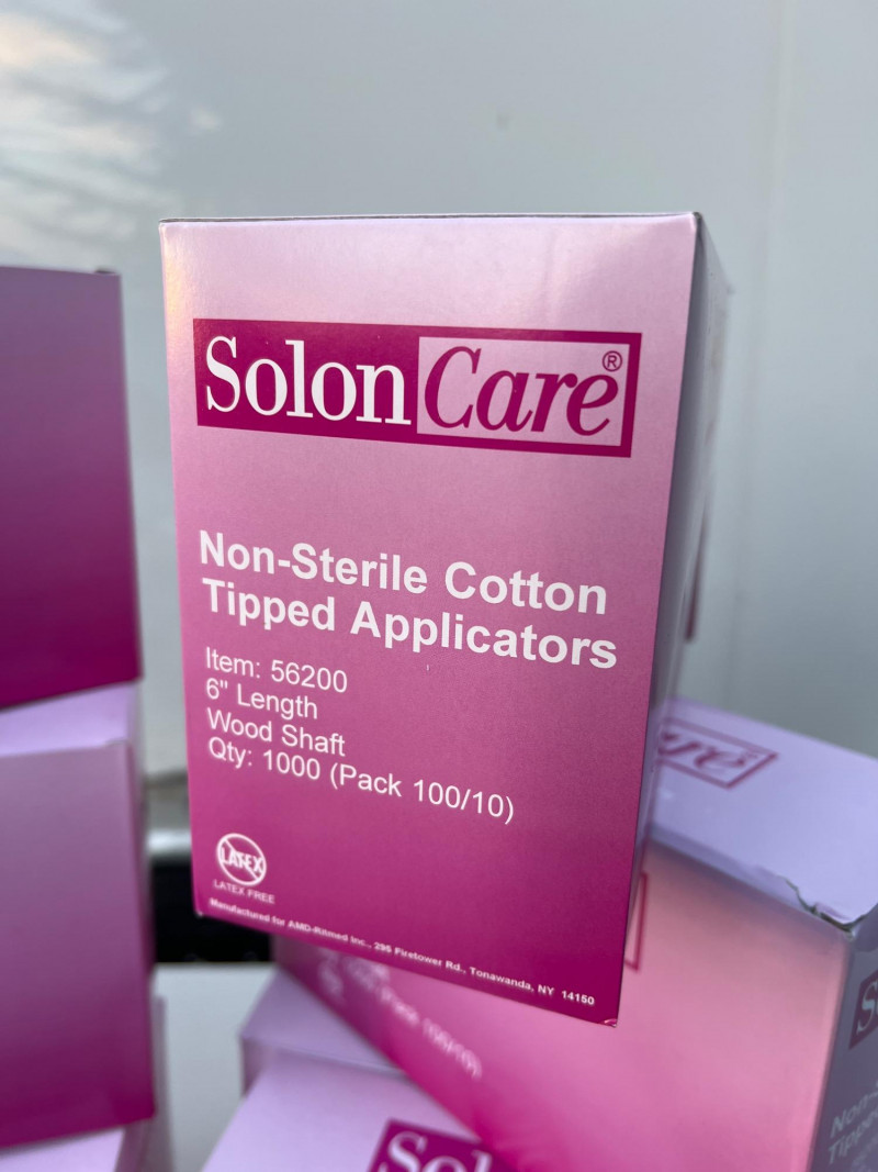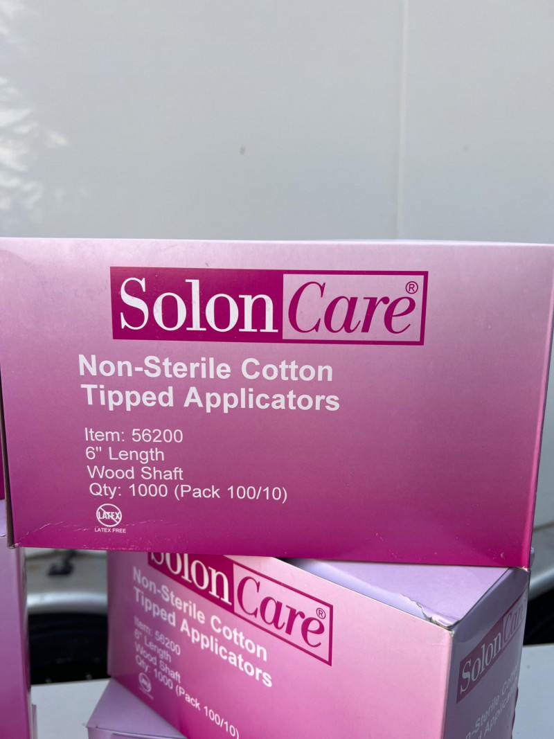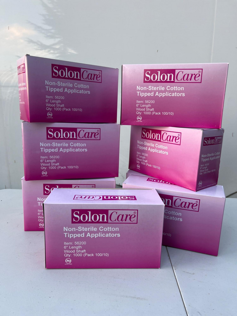 Eight boxes of Solon Care non-sterile tipped applicators. Ideal for shop, cleaning, or general-purpose use. 1,000 applicators in each box in ten - 100 quantity packages for a total of 8,000 applicators. Cleaning Delicate Equipment or Components