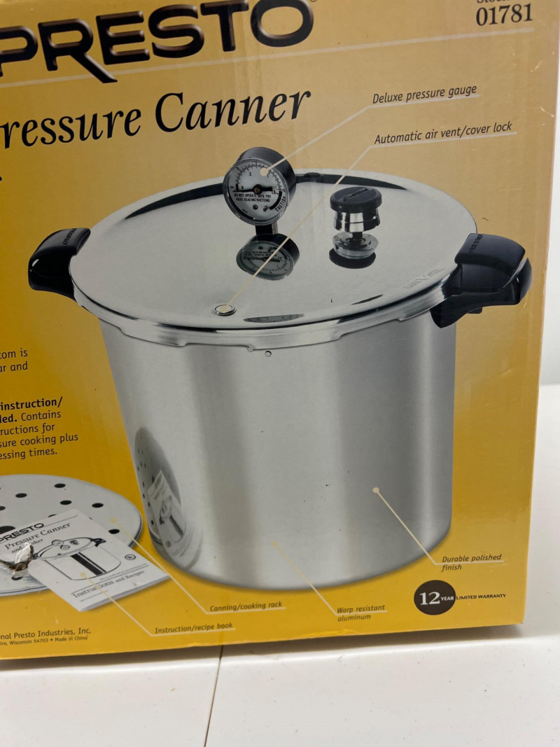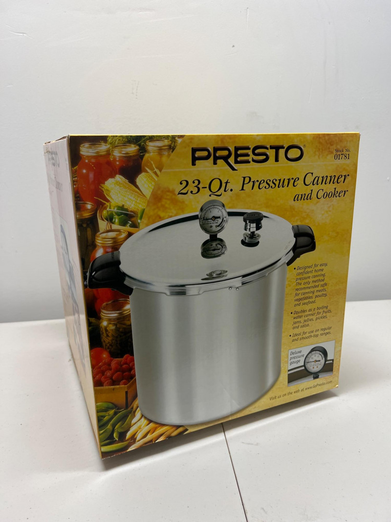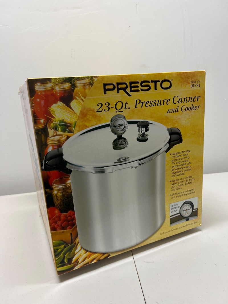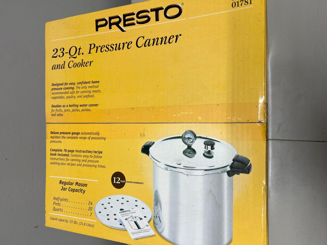 Presto 23-quart pressure canner and cooker, paired with 15 cases of glass canning jars in assorted sizes. The canner is ideal for preserving vegetables, meats, and fruits using pressure or water bath methods. Jar sizes include quart, half-gallon, pint, and specialty fruit jars—perfect for seasonal harvests, pantry stocking, or small-batch production. A complete setup for home canning enthusiasts, food preservationists, or anyone preparing for winter storage. Canner: Presto 23-quart pressure canner and cooker Jars: 15 cases total Sizes: Quart, Half-Gallon, Pint, Fruit Jars Condition: New and usable