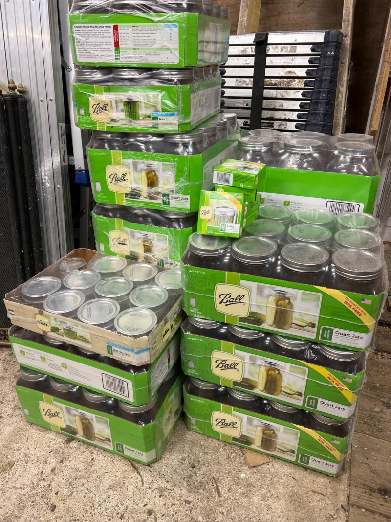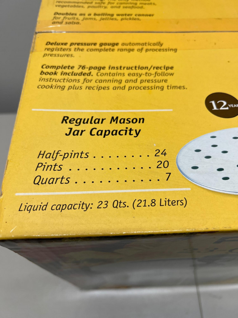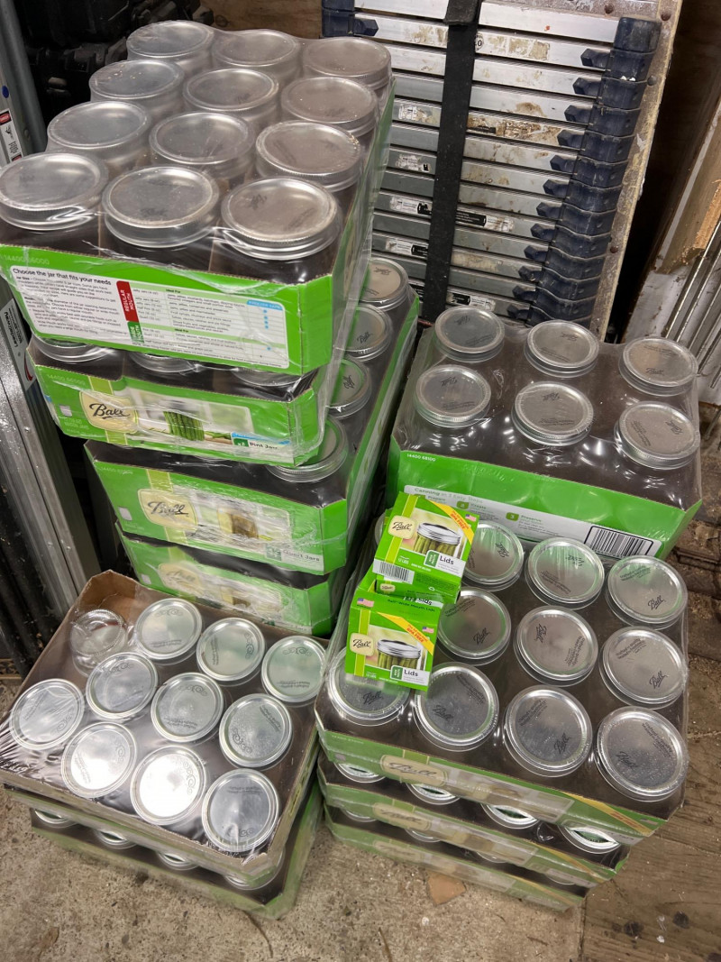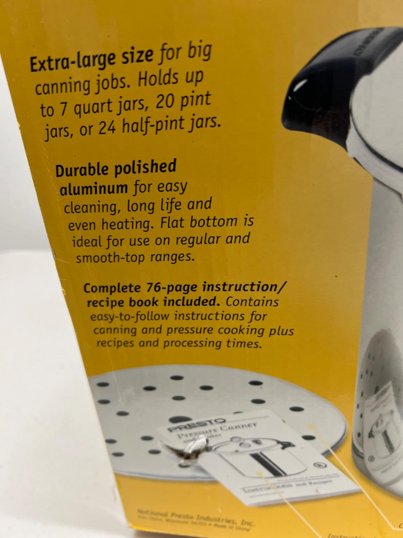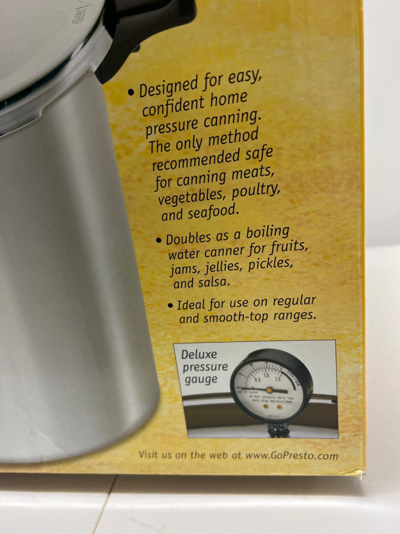 Presto 23-quart pressure canner and cooker, paired with 15 cases of glass canning jars in assorted sizes. The canner is ideal for preserving vegetables, meats, and fruits using pressure or water bath methods. Jar sizes include quart, half-gallon, pint, and specialty fruit jars—perfect for seasonal harvests, pantry stocking, or small-batch production. A complete setup for home canning enthusiasts, food preservationists, or anyone preparing for winter storage. Canner: Presto 23-quart pressure canner and cooker Jars: 15 cases total Sizes: Quart, Half-Gallon, Pint, Fruit Jars Condition: New and usable