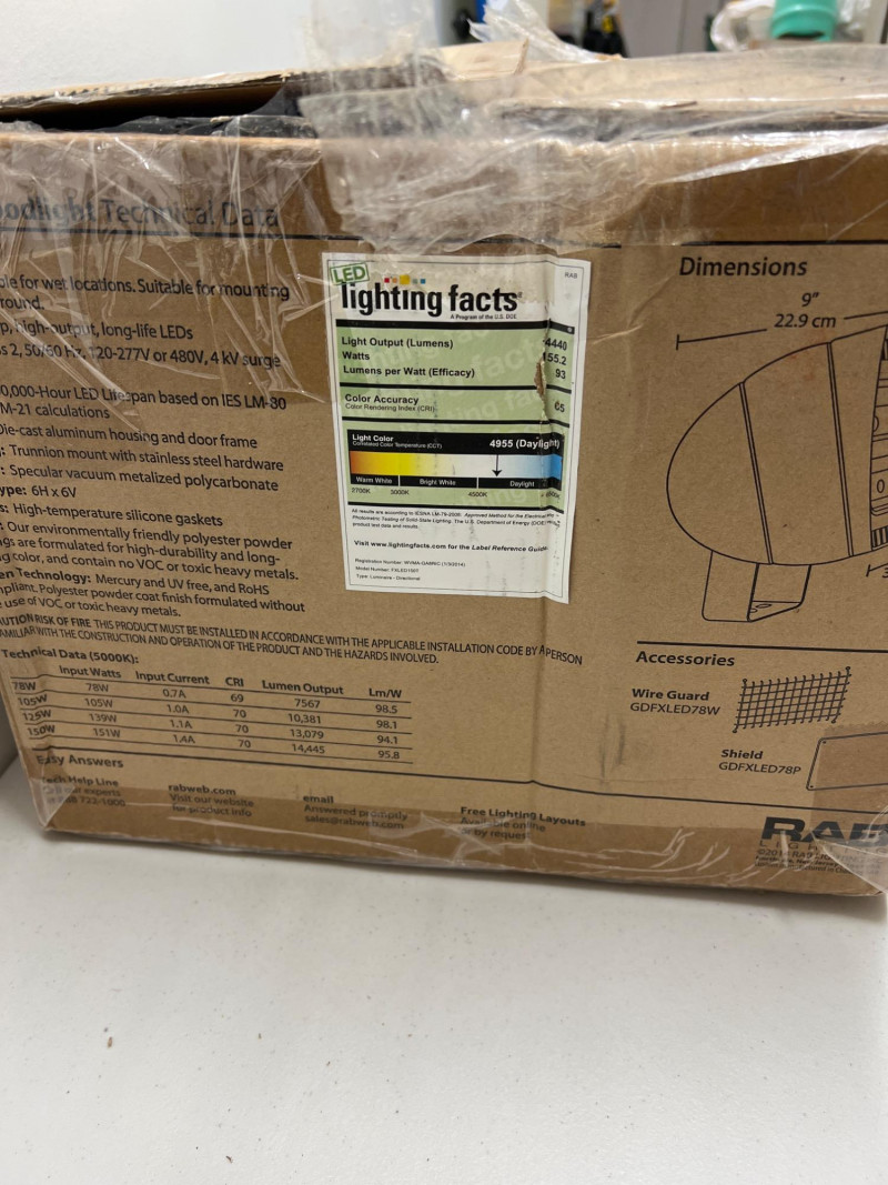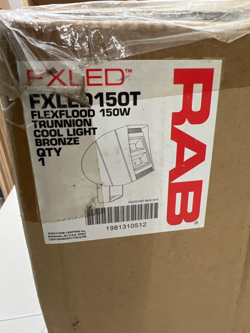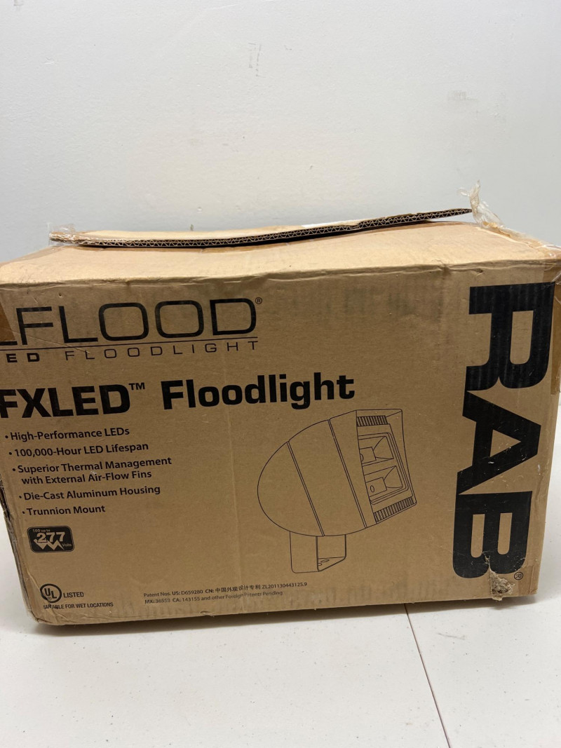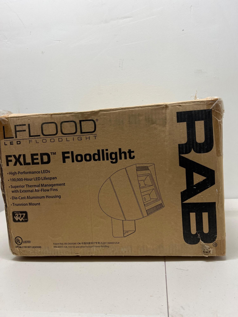 RAB LFlood FXLED150T floodlight, new in box. This high-output LED fixture is designed for outdoor commercial or industrial use, offering energy-efficient performance and long-lasting durability. Ideal for contractors, property managers, or shop installations requiring reliable exterior lighting. This model is known for: 21,000+ lumens of output; IP66-rated enclosure for wet locations; 100,000-hour lifespan; Wide beam spread (NEMA 6H x 6V or 7H x 6V depending on variant); Energy savings up to 66% vs HID fixtures Model: RAB LFlood FXLED150T Type: LED floodlight Condition: New in box Use: Outdoor commercial or industrial lighting Mounting: Adjustable bracket