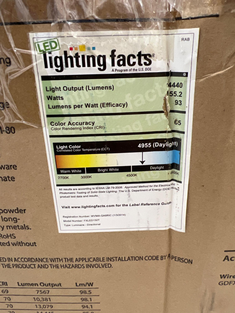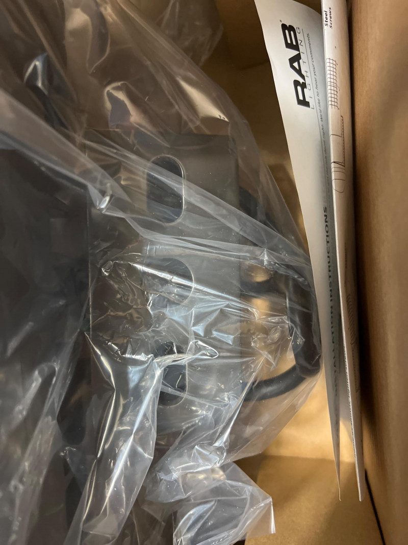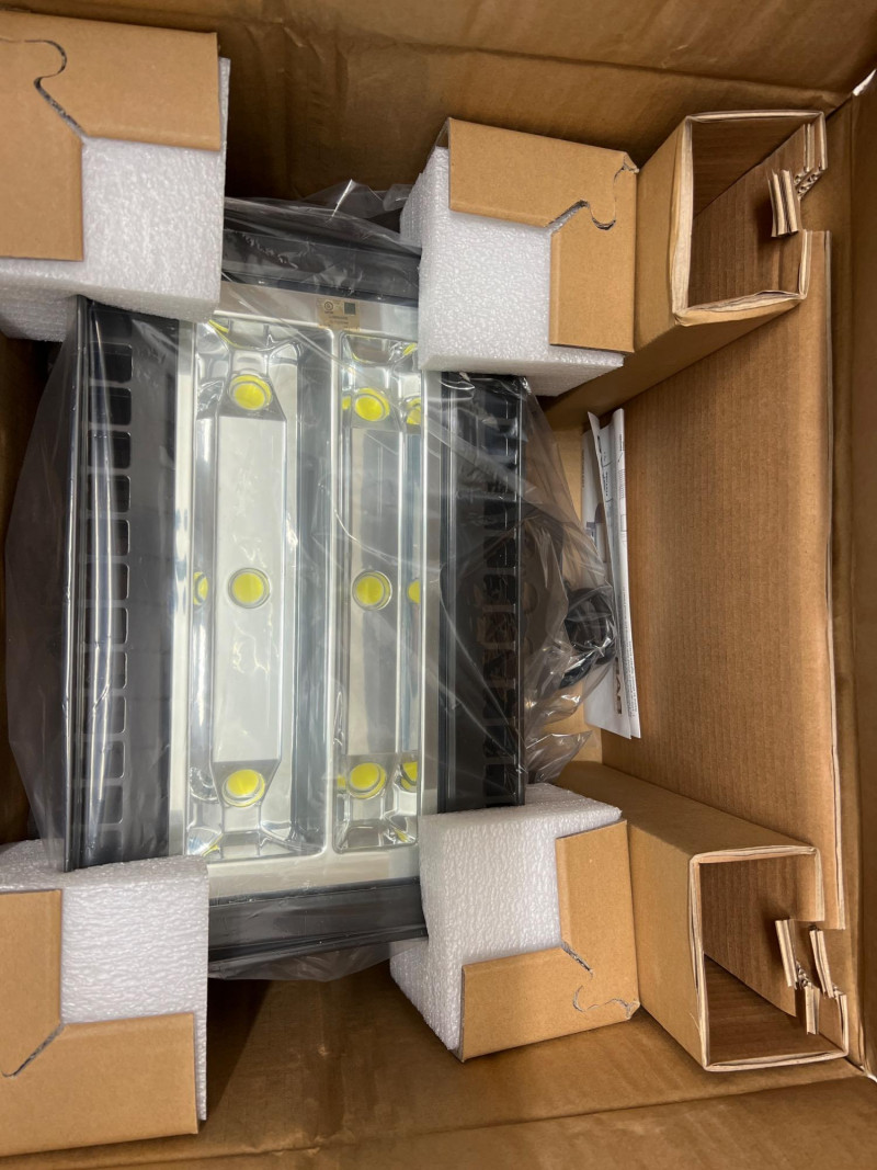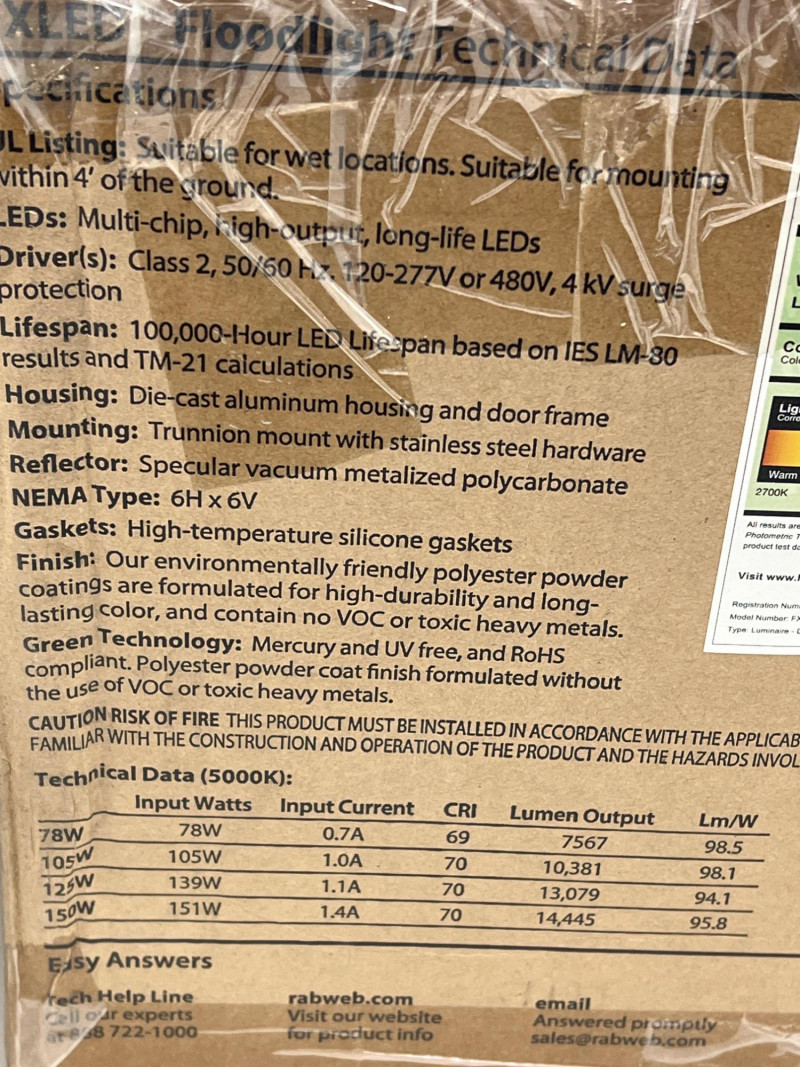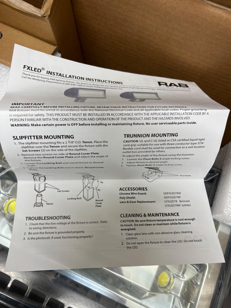 RAB LFlood FXLED150T floodlight, new in box. This high-output LED fixture is designed for outdoor commercial or industrial use, offering energy-efficient performance and long-lasting durability. Ideal for contractors, property managers, or shop installations requiring reliable exterior lighting. This model is known for: 21,000+ lumens of output; IP66-rated enclosure for wet locations; 100,000-hour lifespan; Wide beam spread (NEMA 6H x 6V or 7H x 6V depending on variant); Energy savings up to 66% vs HID fixtures Model: RAB LFlood FXLED150T Type: LED floodlight Condition: New in box Use: Outdoor commercial or industrial lighting Mounting: Adjustable bracket