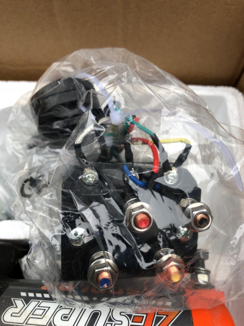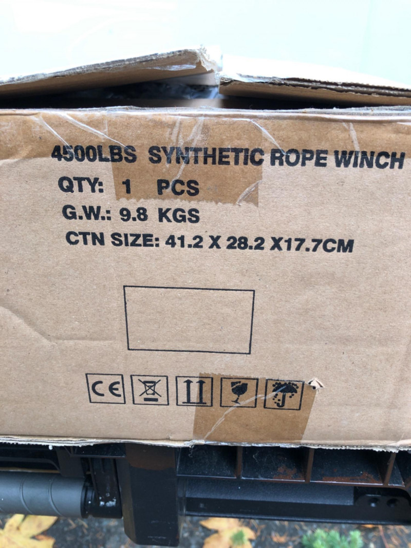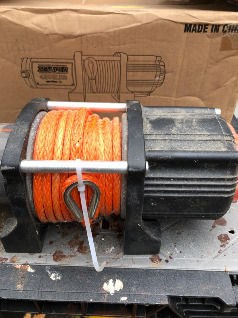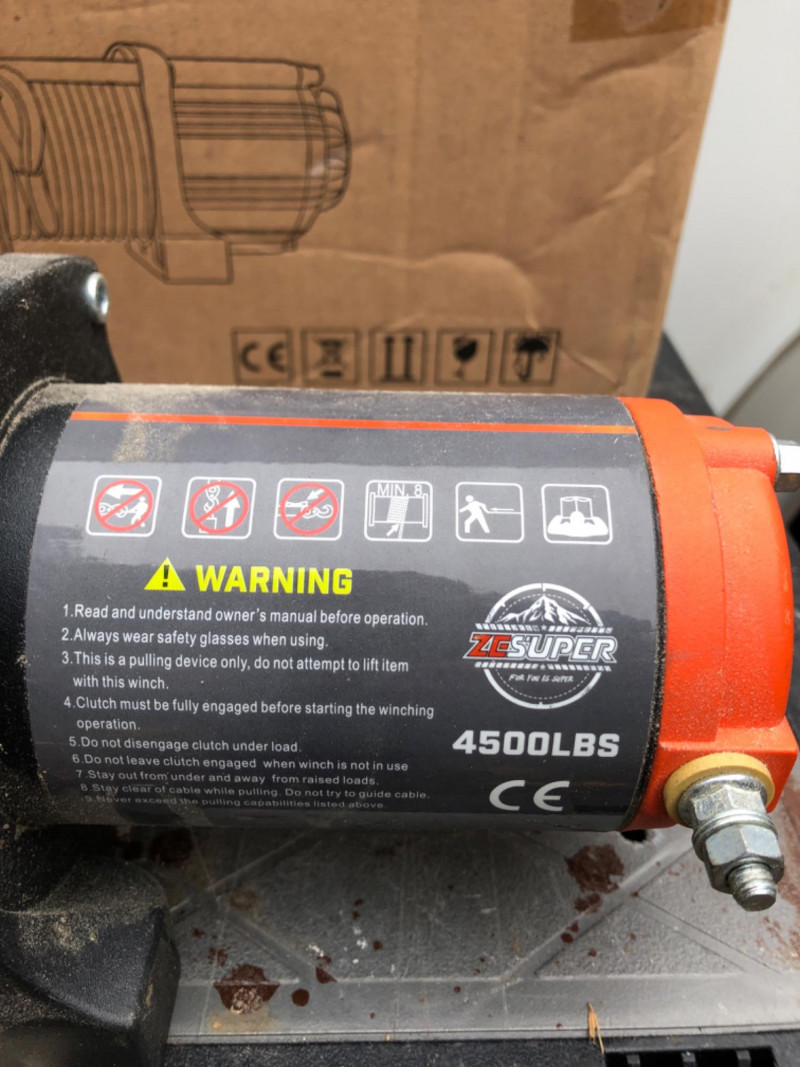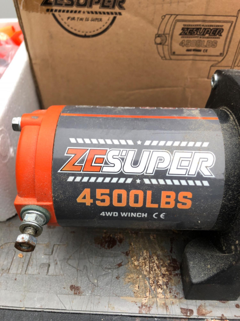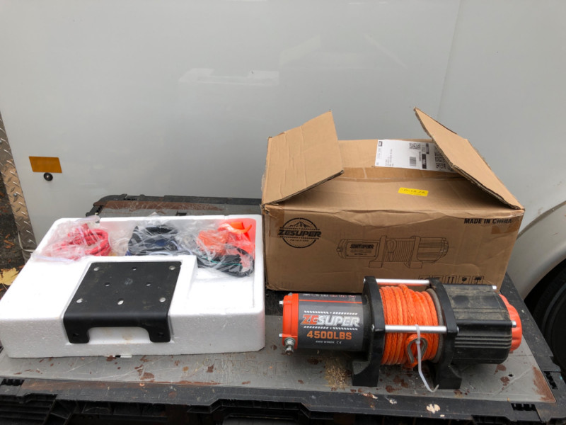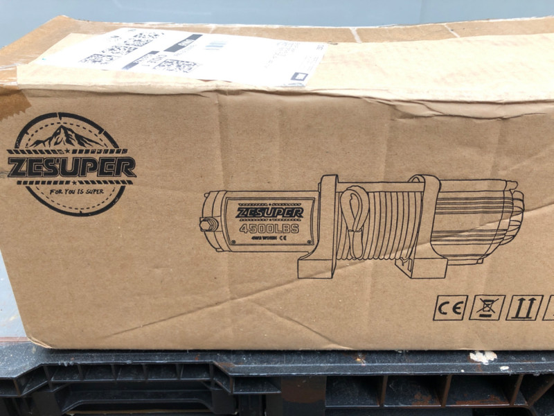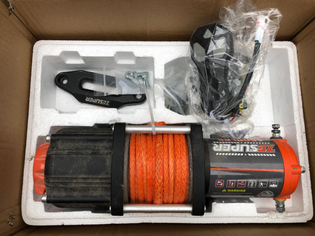 ZESUPER 4500 lb winch with synthetic rope, new in box. Compact yet powerful, this winch is ideal for ATV recovery, trailer mounting, or contractor rigs. Includes remote control and mounting hardware. Lightweight synthetic rope offers safety and ease of handling.