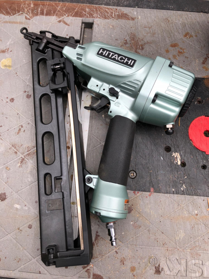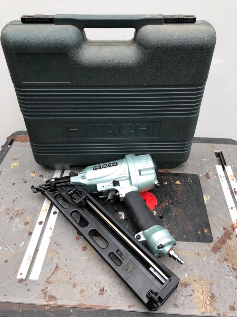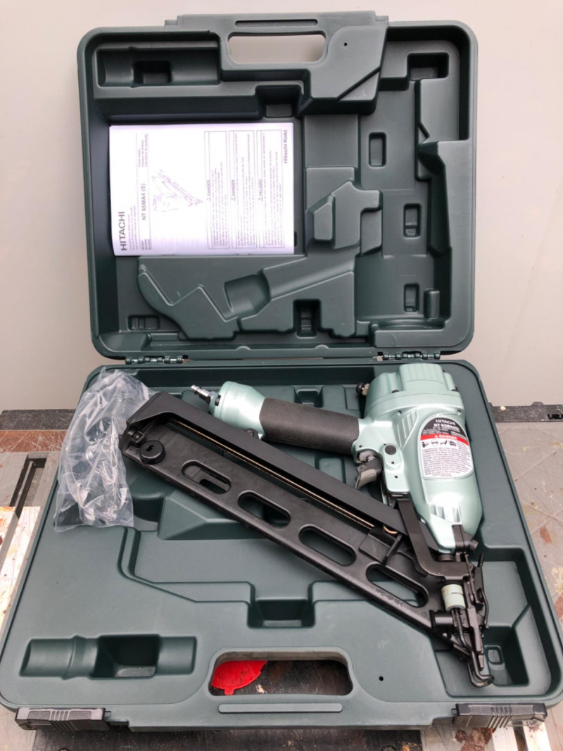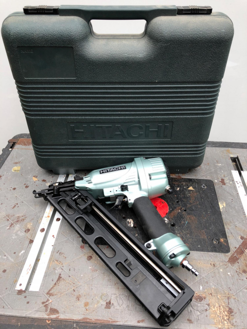 Hitachi pneumatic finish nailer, 2½" capacity. Tested and working. Ideal for trim, cabinetry, or finish carpentry. Includes hard case.