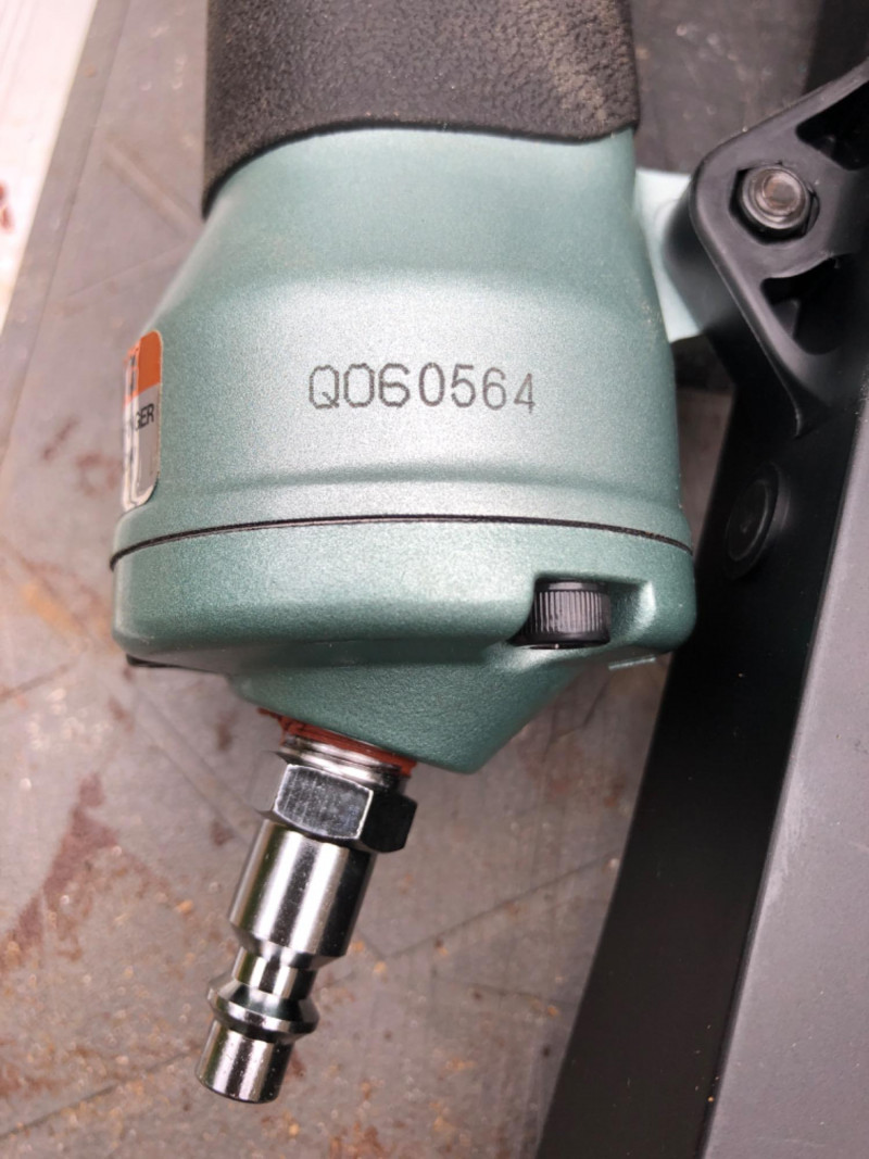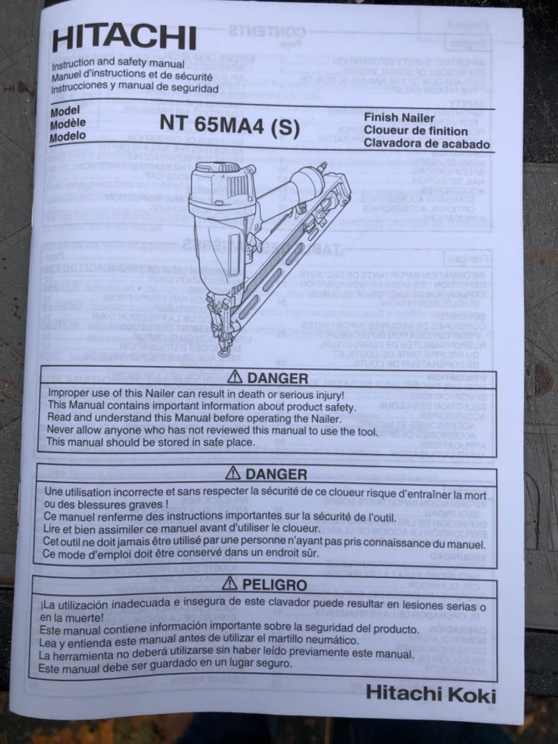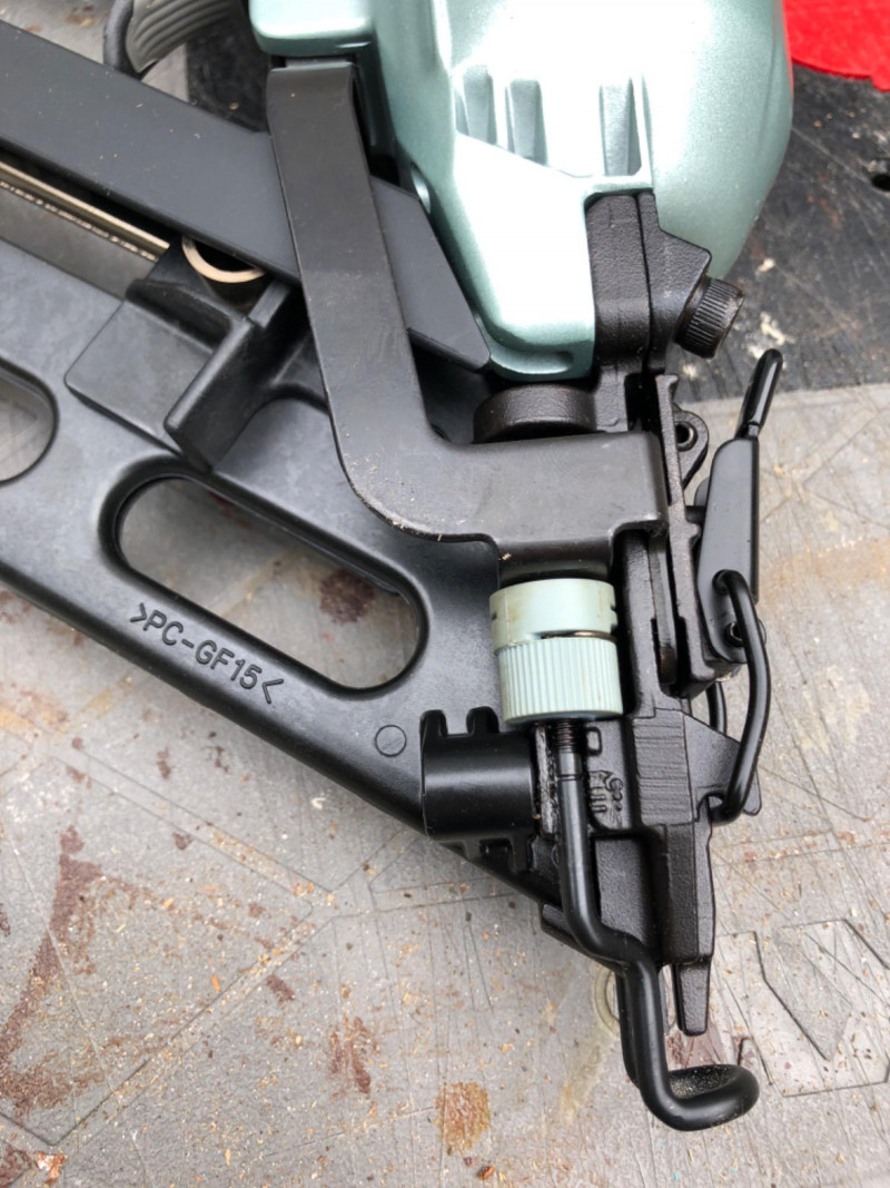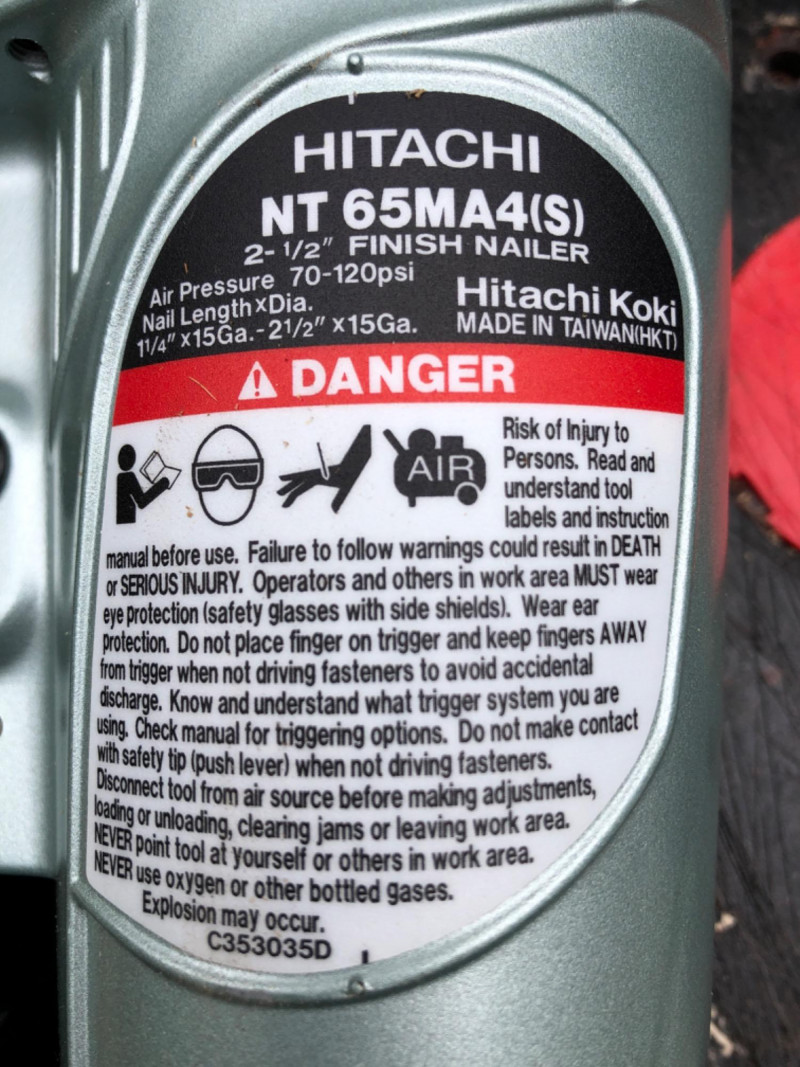 Hitachi pneumatic finish nailer, 2½" capacity. Tested and working. Ideal for trim, cabinetry, or finish carpentry. Includes hard case.