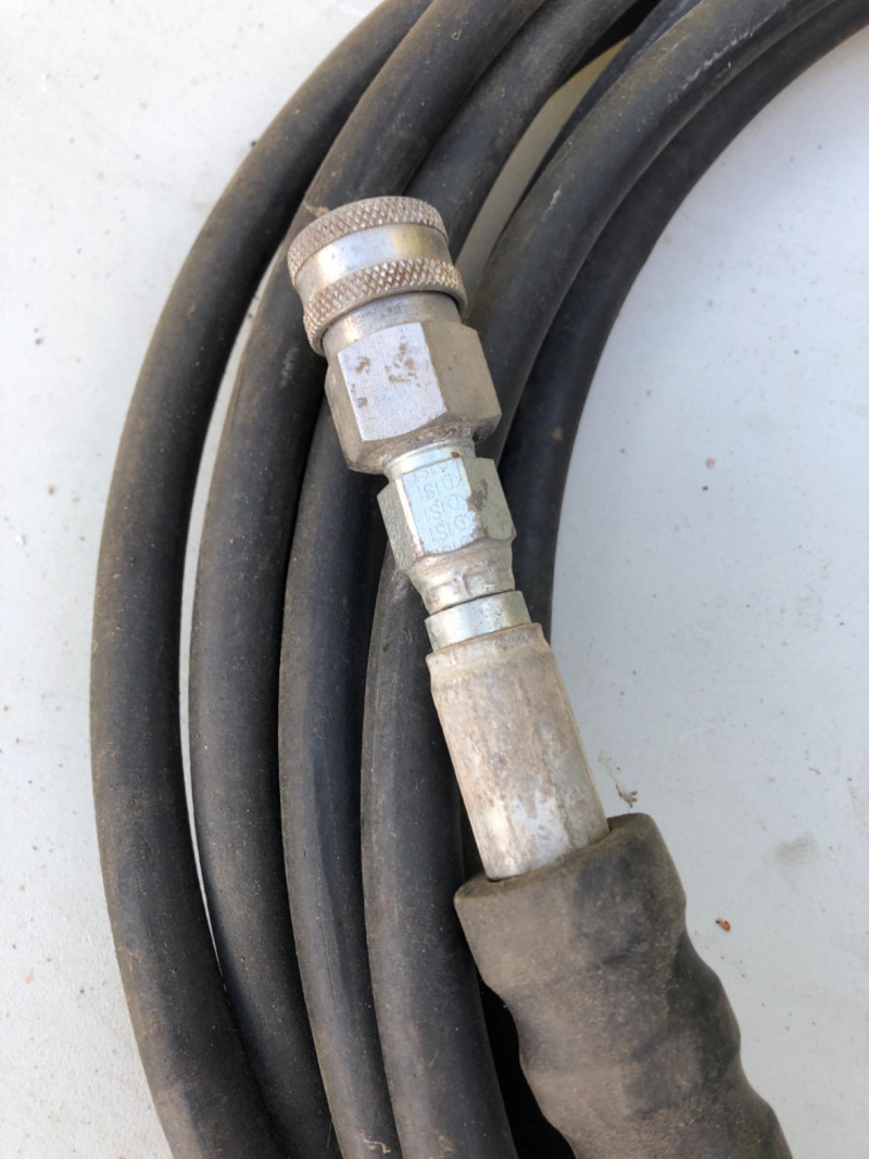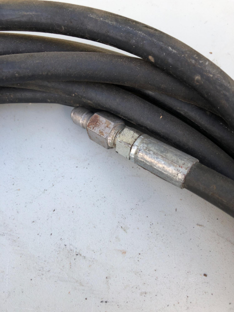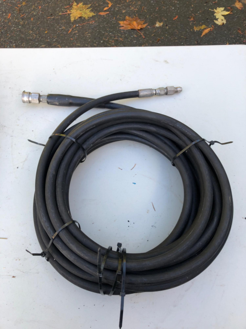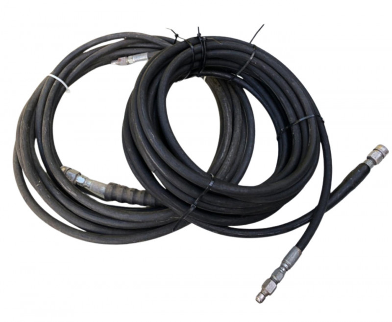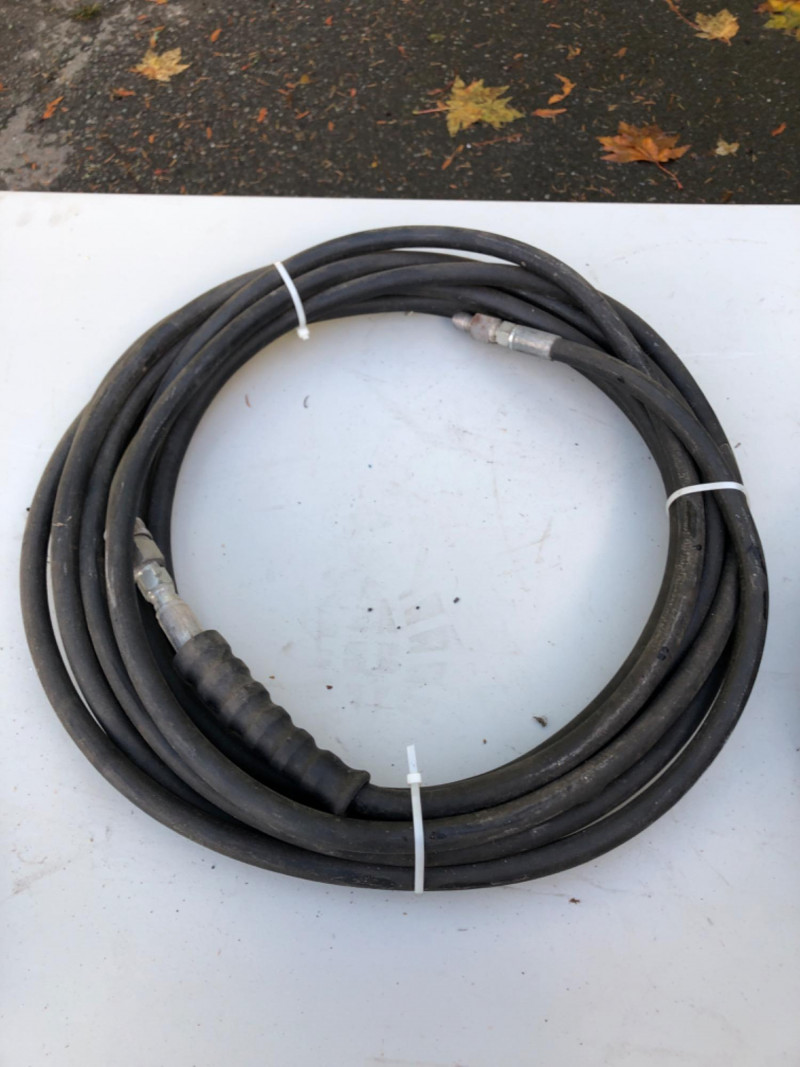 Two 50-foot pressure washer hoses with a ⅜" diameter, built for high-pressure systems and demanding jobsite use. These flexible, contractor-grade hoses are ideal for exterior cleaning, fleet maintenance, shop setups, or mobile wash rigs. Durable construction resists abrasion and kinking, while the length provides extended reach for large surfaces or remote access points. Compatible with most commercial pressure washer units. Quantity: 2 hoses Length: 50 feet each Diameter: ⅜ inch Use: Pressure washing, contractor rigs, shop cleaning Condition: Usable