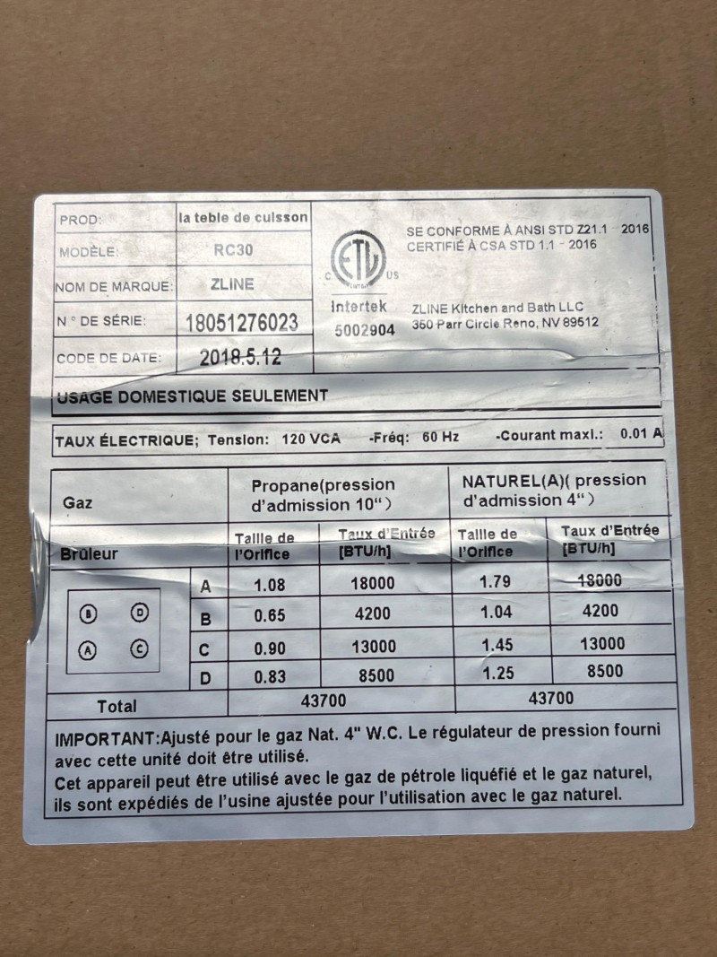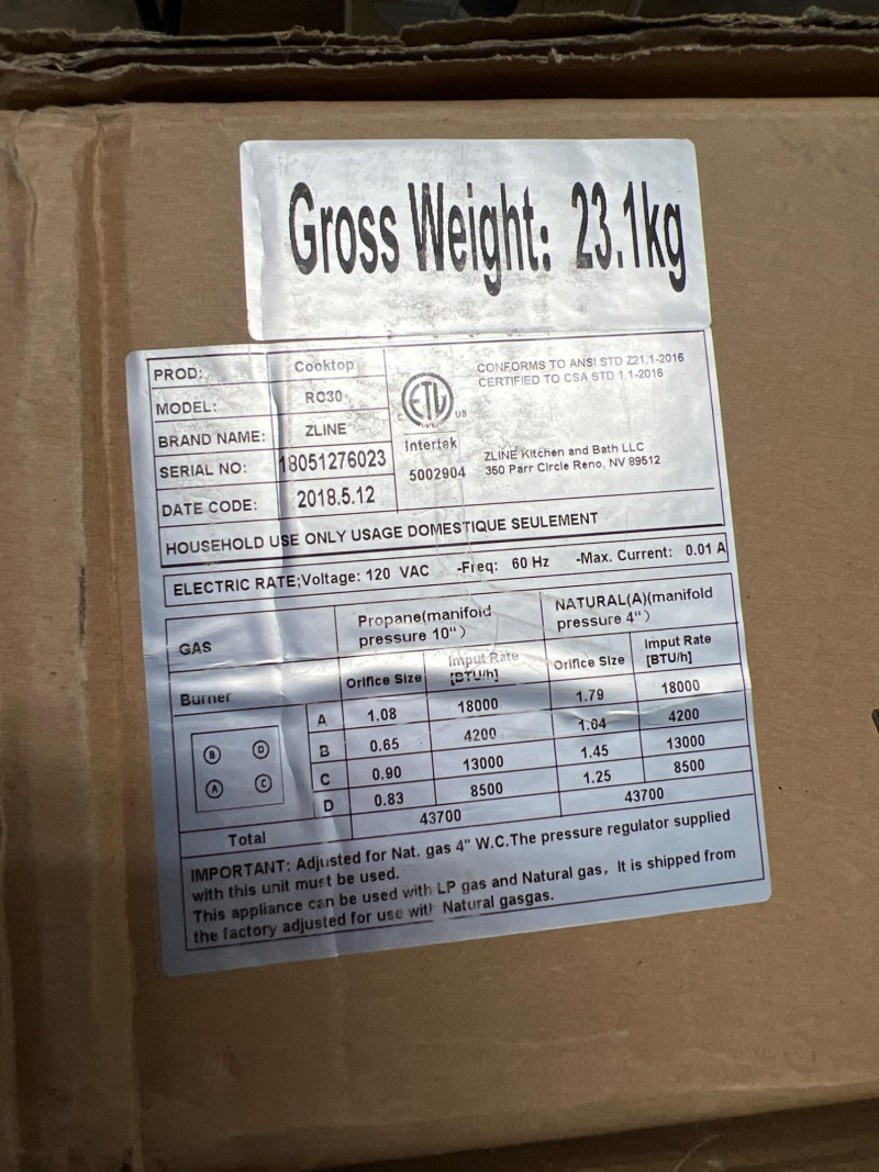 ZLINE RC30 30" drop-in range top, compatible with both gas and propane setups. This unit is brand new in its original unopened box, making it ideal for kitchen remodels, contractor inventory, or appliance resellers. The RC30 model includes four high-performance burners and a sleek black porcelain cooktop surface. Known for its durability and modern styling, ZLINE appliances are a favorite among designers and builders. Brand: ZLINE Model: RC30 Type: 30" drop-in range top Fuel: Gas or propane Color: Undetermined from product information on outside of box. Zline typically manufacturers cooktops in black, stainless, or bronze. Burners: 4 Condition: New in unopened box