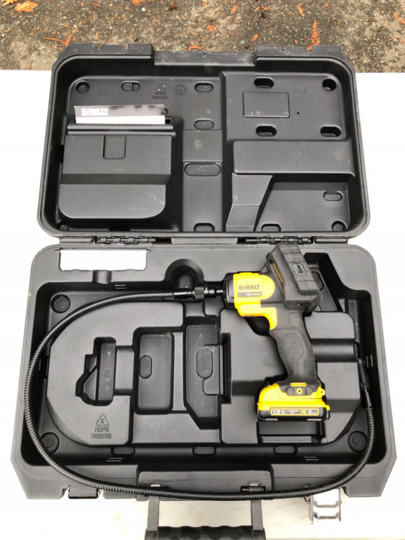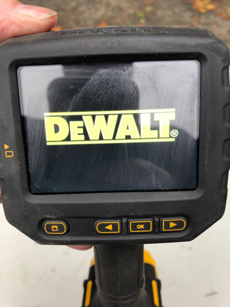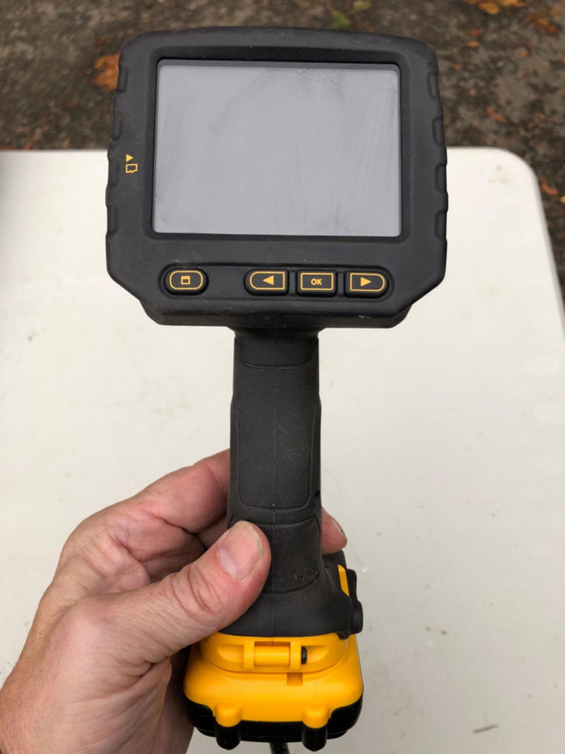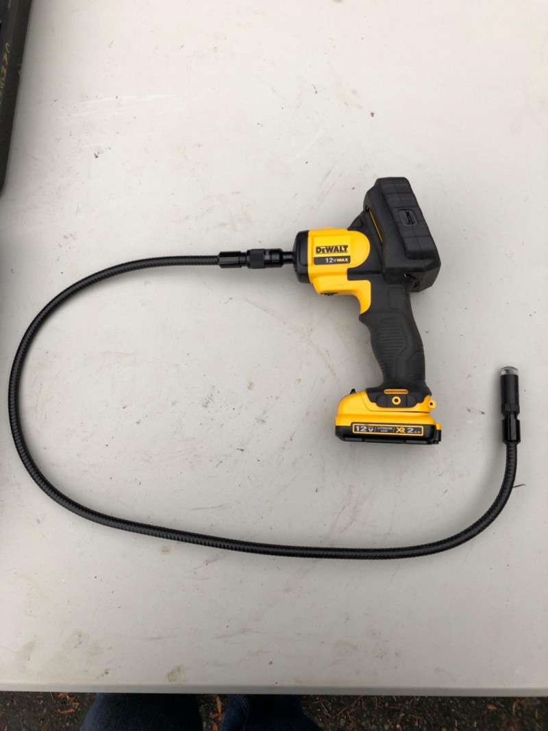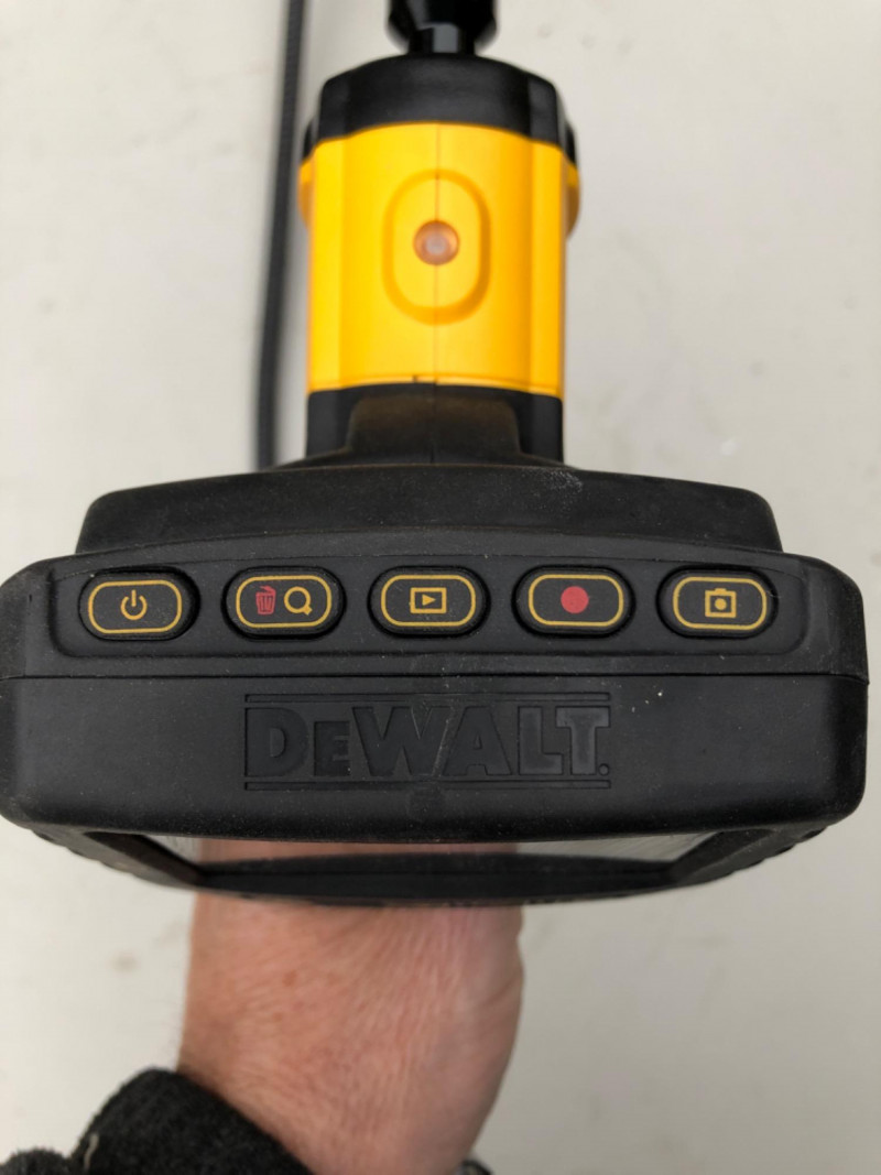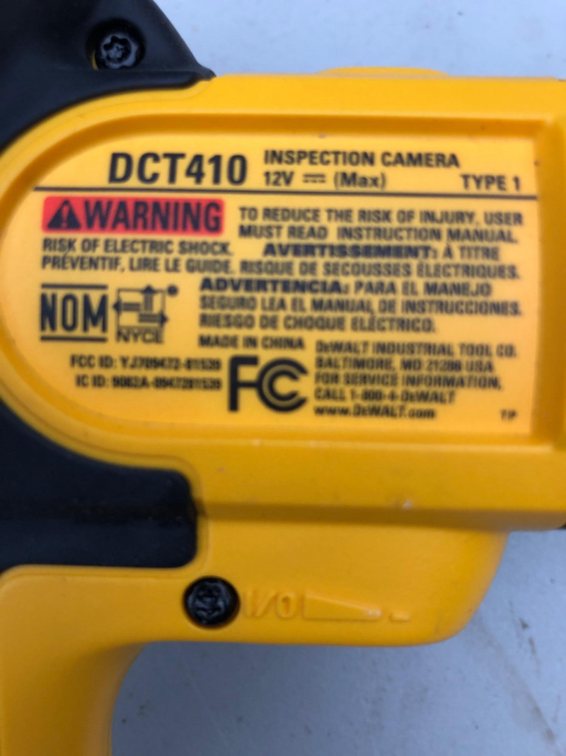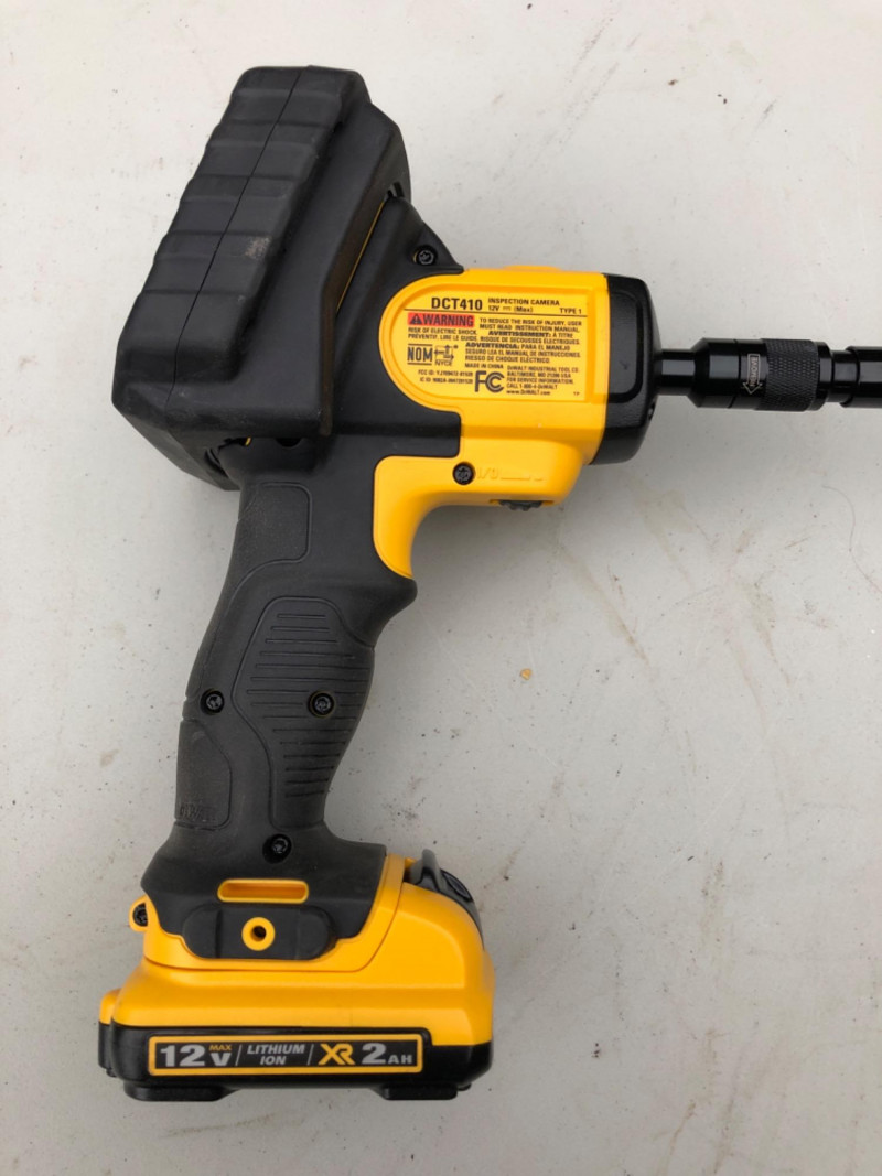 DeWalt DCT410 inspection camera with display screen, flexible cable, and storage case. Ideal for inspecting pipes, walls, crawlspaces, or tight-access areas. A must-have for contractors, plumbers, or home inspectors. Brand: DeWalt Model: DCT410 Includes: Display unit, cable, case (battery not included) Use: Visual inspection, diagnostics Condition: Usable - display turns on; but not fully tested