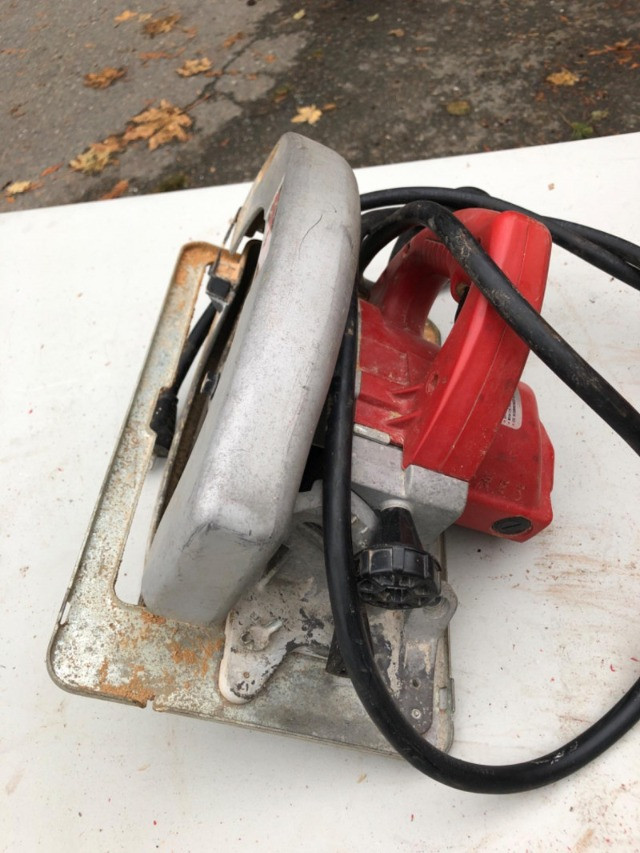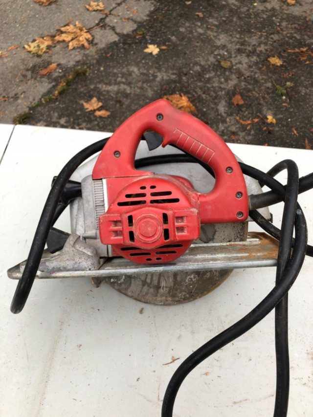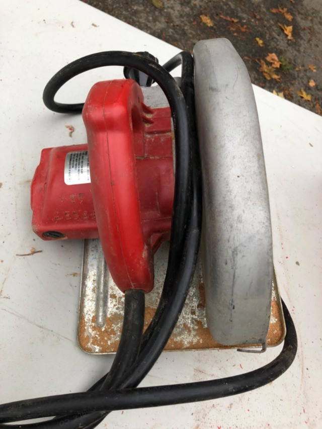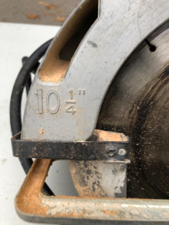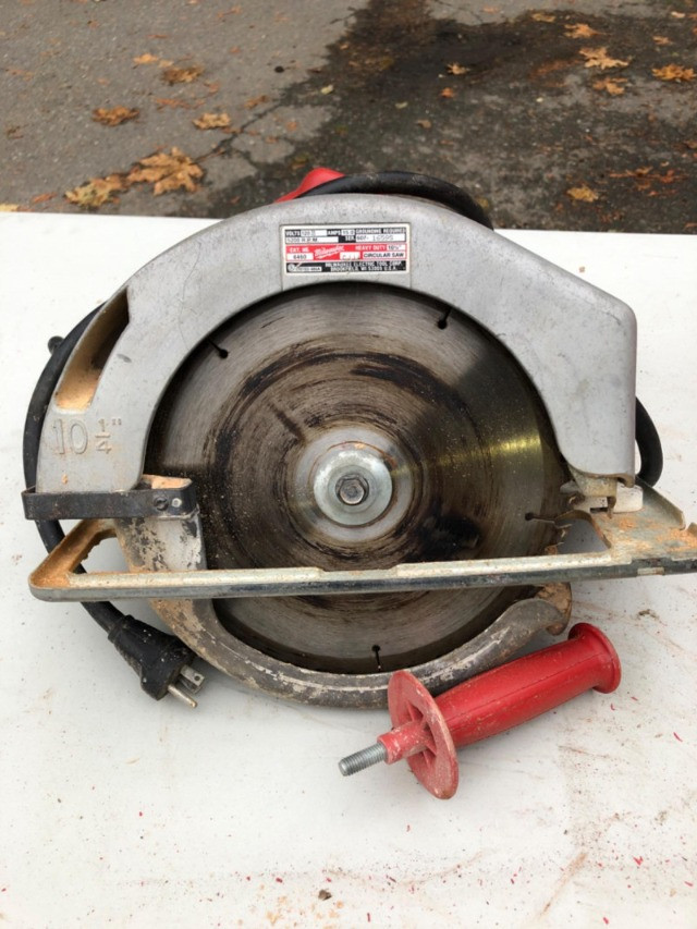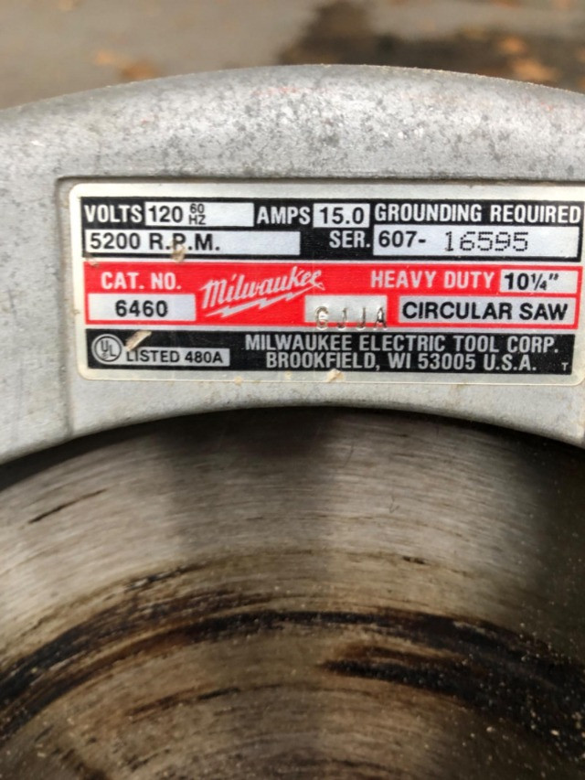 Milwaukee 10-1/4" heavy-duty circular saw housed in its original metal case. Cat No. 6460, Listed 480A. Built for deep cuts and framing applications, this saw features a powerful motor and rugged construction suited for professional jobsite use. Ideal for timber framing, beam work, and large dimensional lumber. Includes blade guard, handle grip, and corded power. Working condition.
