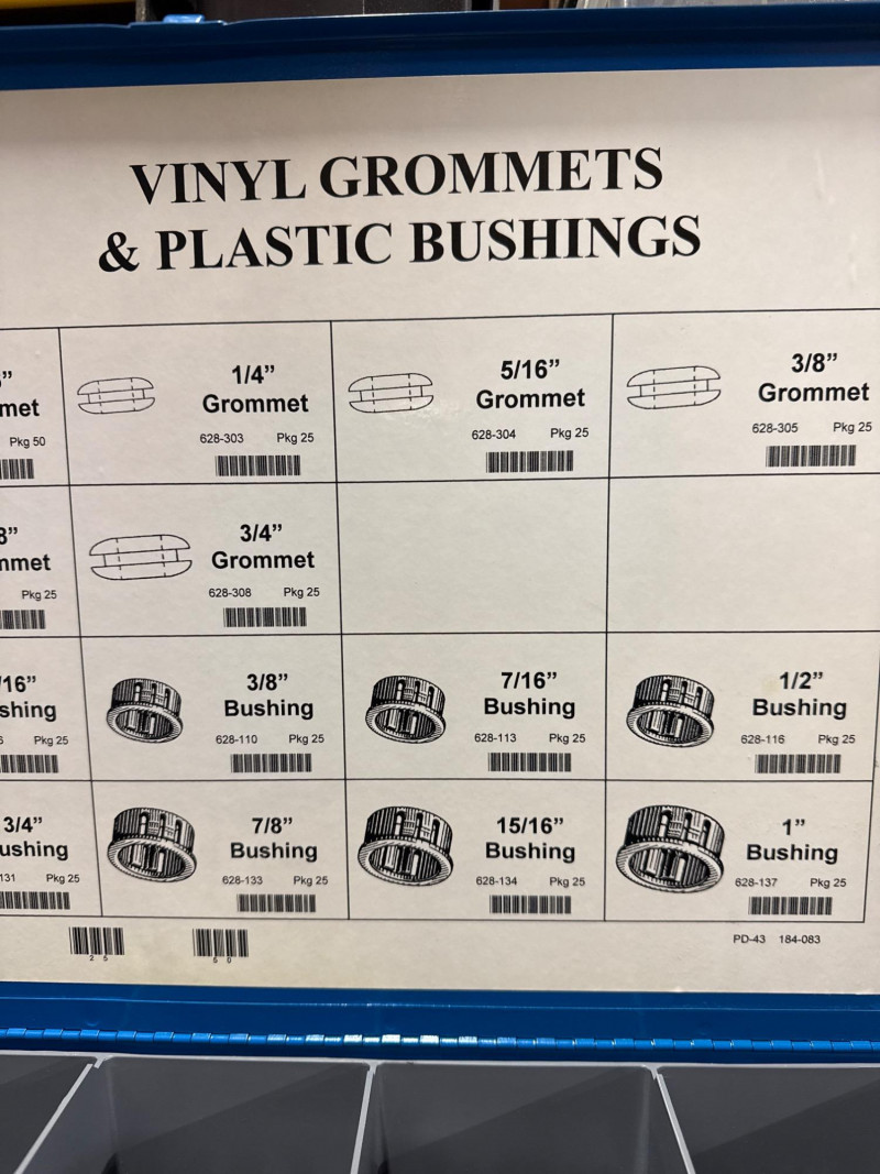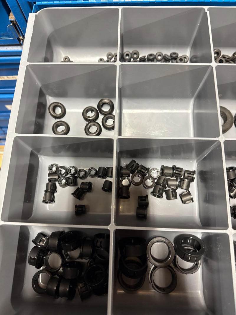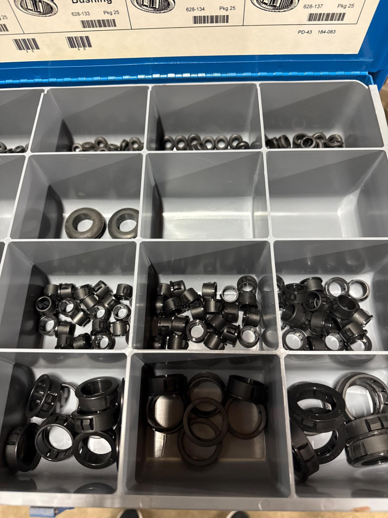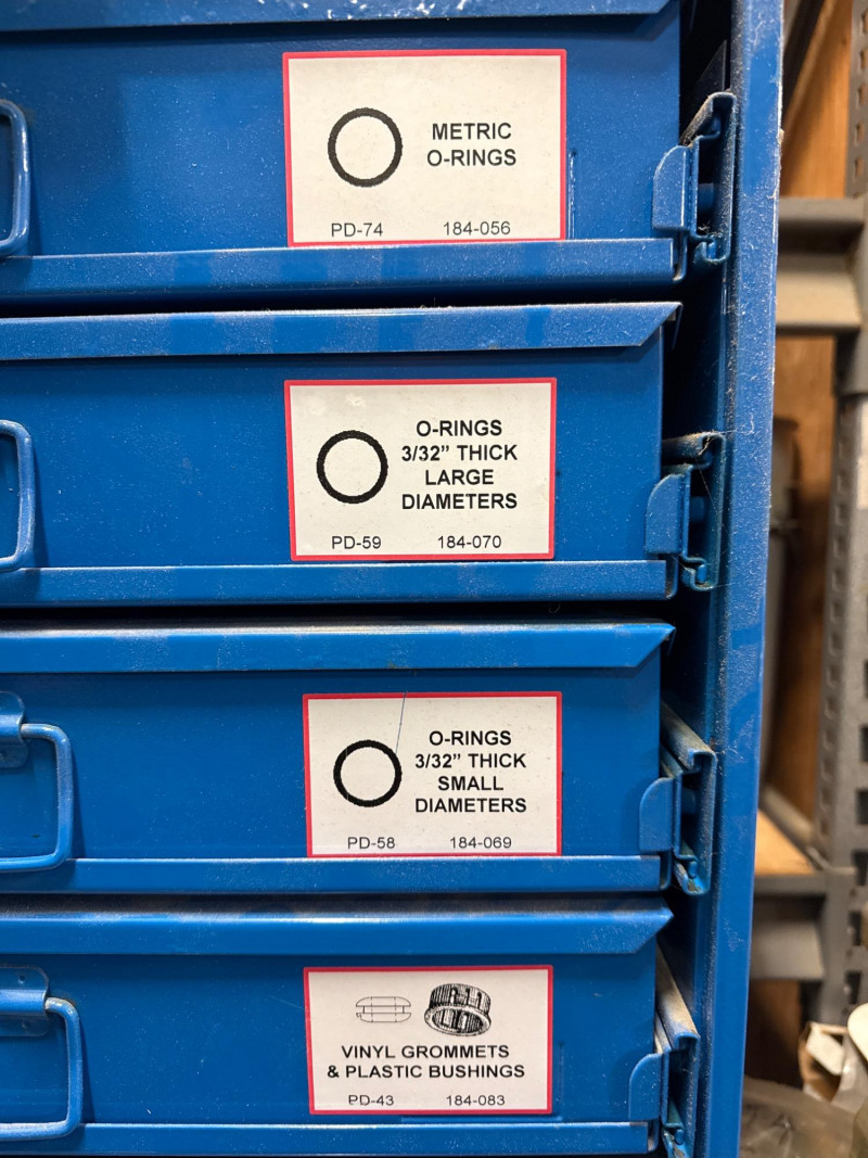 Well-organized assortment of small hardware components, including o-rings, plastic bushings, and rubber grommets in various sizes and styles. These items are essential for sealing, spacing, and protecting wiring or mechanical connections across a wide range of applications. Perfect for contractors, mechanics, electricians, or anyone maintaining equipment, this lot provides a versatile mix of parts commonly used in plumbing, automotive, electrical, and shop repair work. Components are stored in labeled drawers and bins for easy access and inventory management. Includes all hardware inside drawers as photographed, organizer frame and drawers. Single, detached unit.