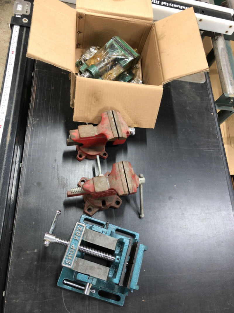Four 4-inch workbench vices from respected brands: Grizzly G1064, Shop Fox D2033, and (2) Home 203-1/2. These heavy-duty vices are ideal for woodworking, metalworking, and general shop use, offering secure clamping for cutting, drilling, shaping, and assembly tasks. Each vice features a robust cast iron body, precision-machined jaws, and a smooth screw mechanism for reliable grip and control. The largest vice offers a 6-inch jaw opening, while the other two provide 3.5-inch openings—perfect for varied project sizes and materials. Whether you're outfitting a contractor bench, garage workstation, or school shop, this lot delivers dependable performance and brand-name quality.