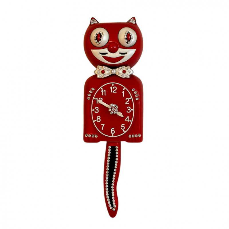 Classic vintage Kit Kat Clock from the California Clock Company! This is the gussied up version - with sparkles like our clients loved - in red, white, black, and silver. Its eyes move as does its tail when plugged in (2-prong plug). Measures approx. 15" H. We found only one of the particular model for sale on the internet for $105 and it wasn't running & was missing a hand - we think this jeweled one was a special production line.