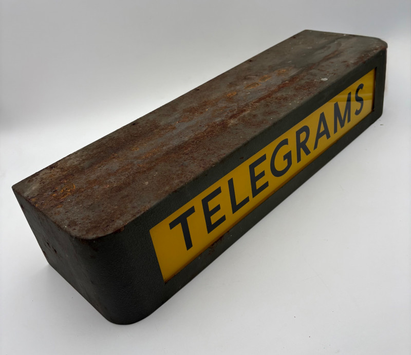 Terrific heavy sheet metal sign advertising a telegram office - we are guessing it was mounted above a door and lit up given that there is glass where the "Telegram" letters are printed and there is also a glass panel underneath which would light the doorway below. The section with the letters (they measure 2" H) is in excellent condition for its age, but the rest of the sign proudly wears its years in the dappled/scaley finish. We did not clean this - just a quick wipe-down - we think a good scrub will make it really appealing, Works great as a shelf display without lighting, but we've installed a light strip into a similar sign we own and love the effect hanging on the wall. Measures 5" H x 24" W x 7" D.