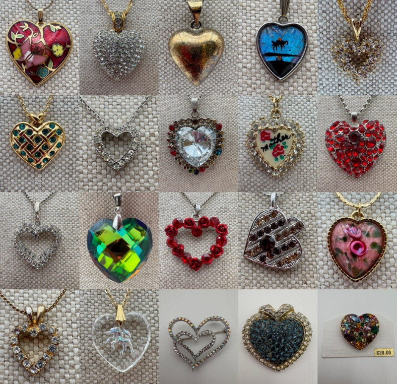 Whether you are a smooth Casanova, conniving Lothario, or a besotted Romeo, here are a lot of Valentine's Day pieces for you to give to your multitudes or shower on your one special person. Note - some of the chains on these do not look like they are original to the necklace - for example: pendant is sterling while the chain is not (e.g. plain heart). Longest chain (green faceted heart) measures approx. 35" from clasp to end. Please look closely at photos.
