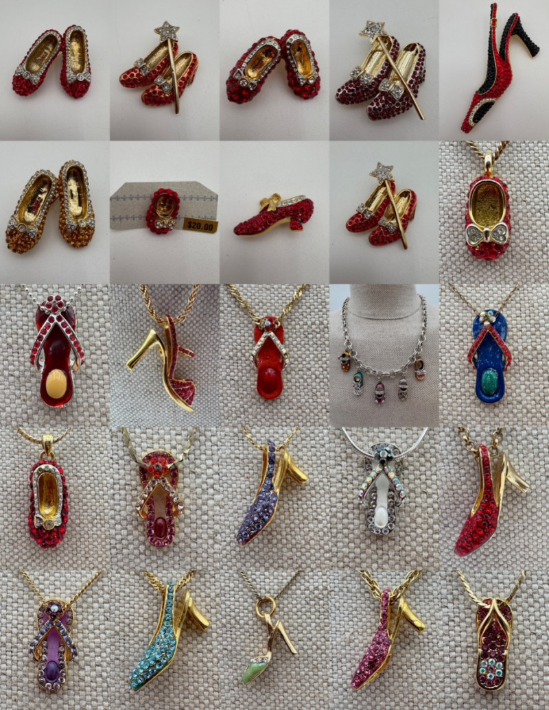 You only have 2 feet, but you can wear more than a single pair of shoes if you own this lot of jewelry. And if you must wear shoes, make them sparkle - Dorothy had the right idea! All jewelry - some vintage & some not -in this lot are foot/shoe-themed! Super large sling-back measures 4" W.