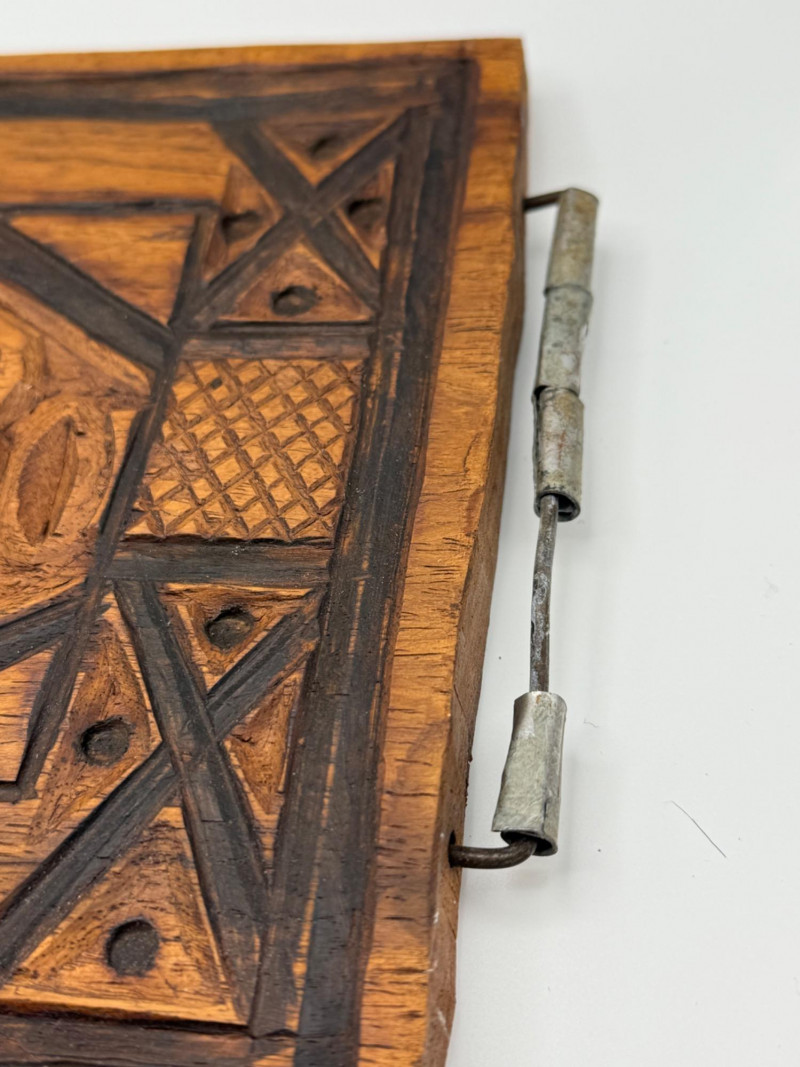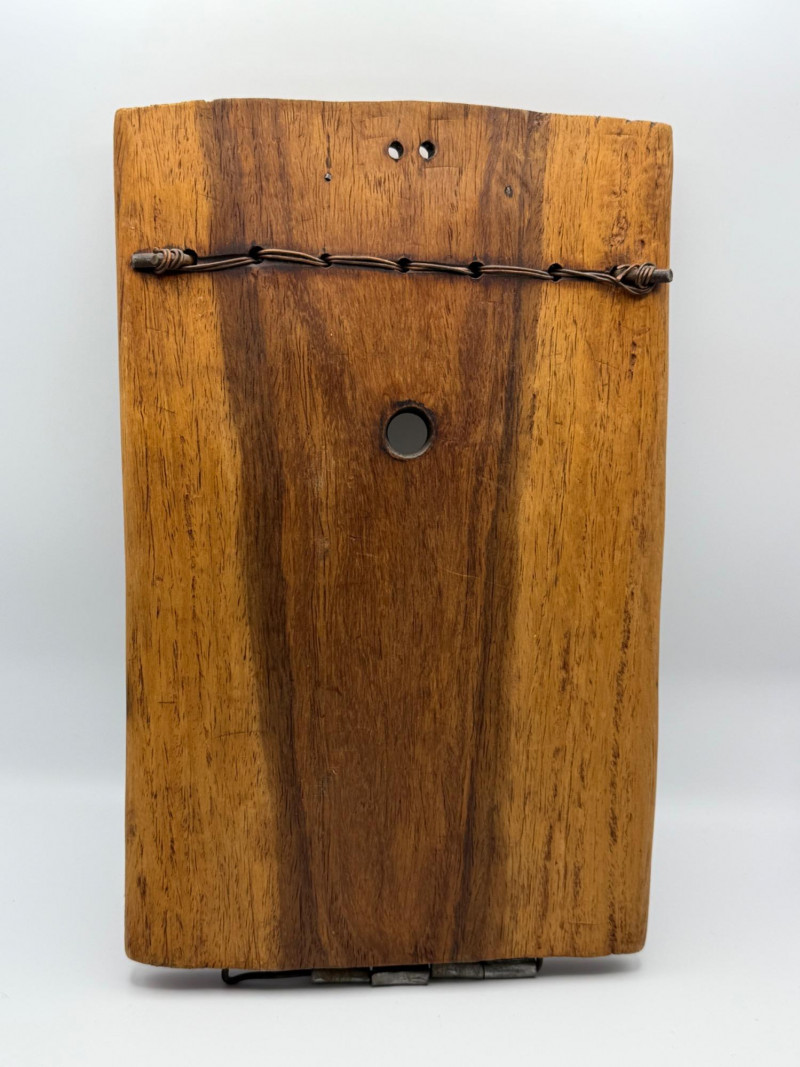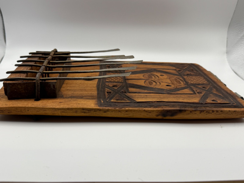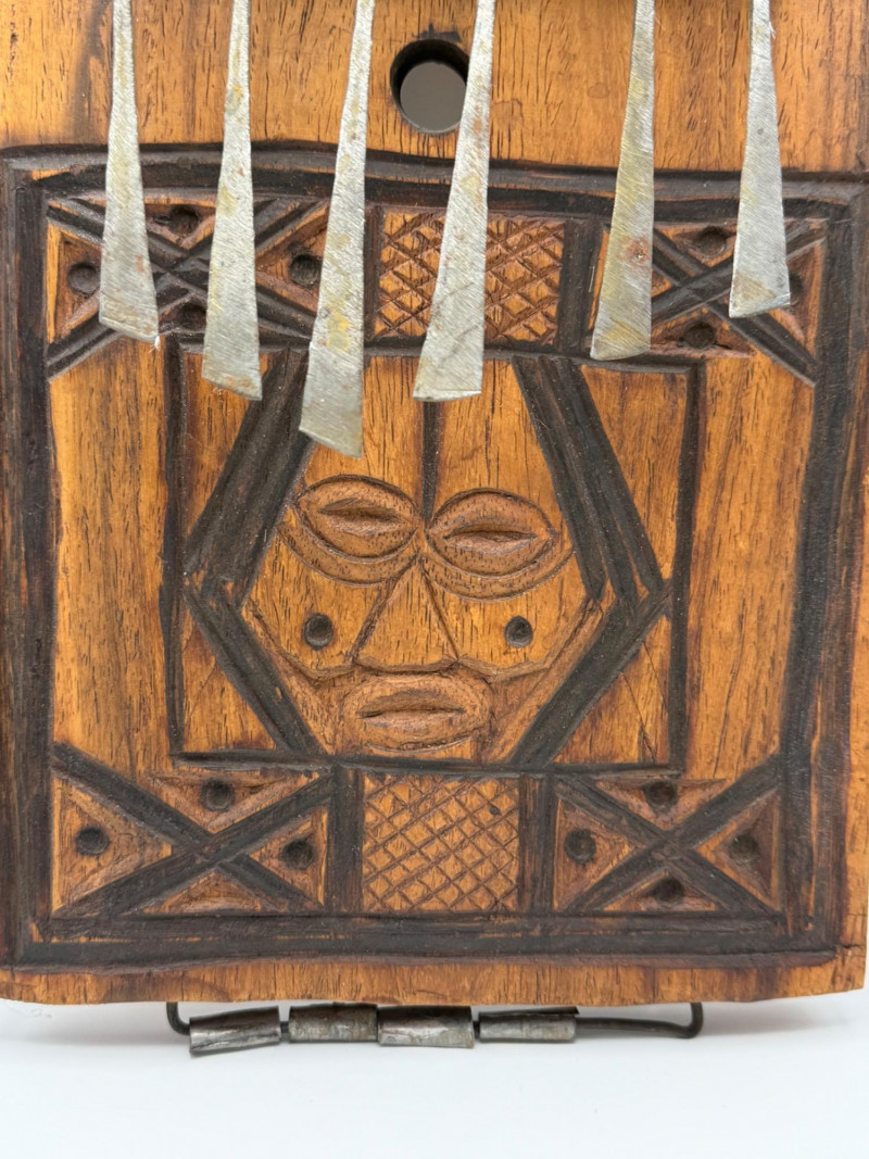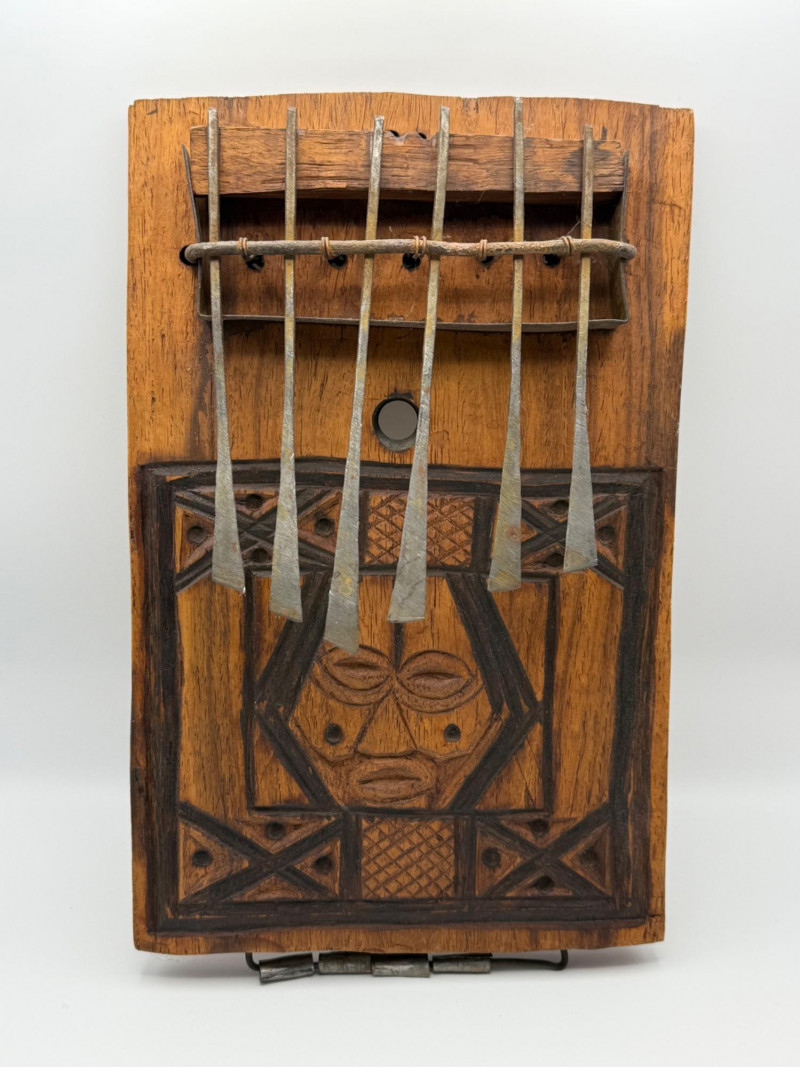 This is an African lamellophone, also commonly known as a thumb piano, kalimba, or mbira. Traditionally crafted from a wooden soundboard with attached metal keys (lamellae), the instrument is played by plucking the tines with thumbs or forefingers. This example features carved tribal or Chokwe iconography on the soundboard, adding cultural depth and visual interest. Tuning and construction vary widely across regions and makers, with names such as sanza, likembe, and okeme used throughout Africa. Important Details: Material: Carved wood with metal tines Design Features: Circular sound hole for resonance Stylized face and geometric carvings Mounted metal keys of varying lengths Dimensions: Approx. 7" L × 11" W Condition: Excellent vintage condition with signs of age and use