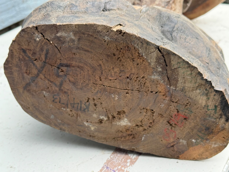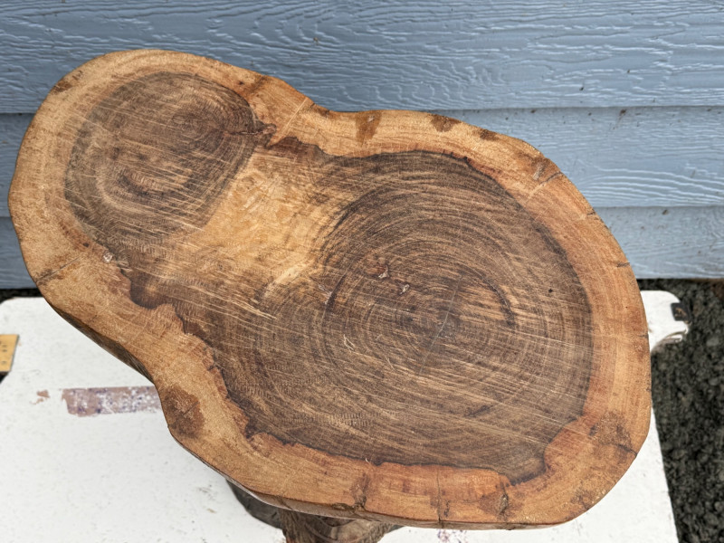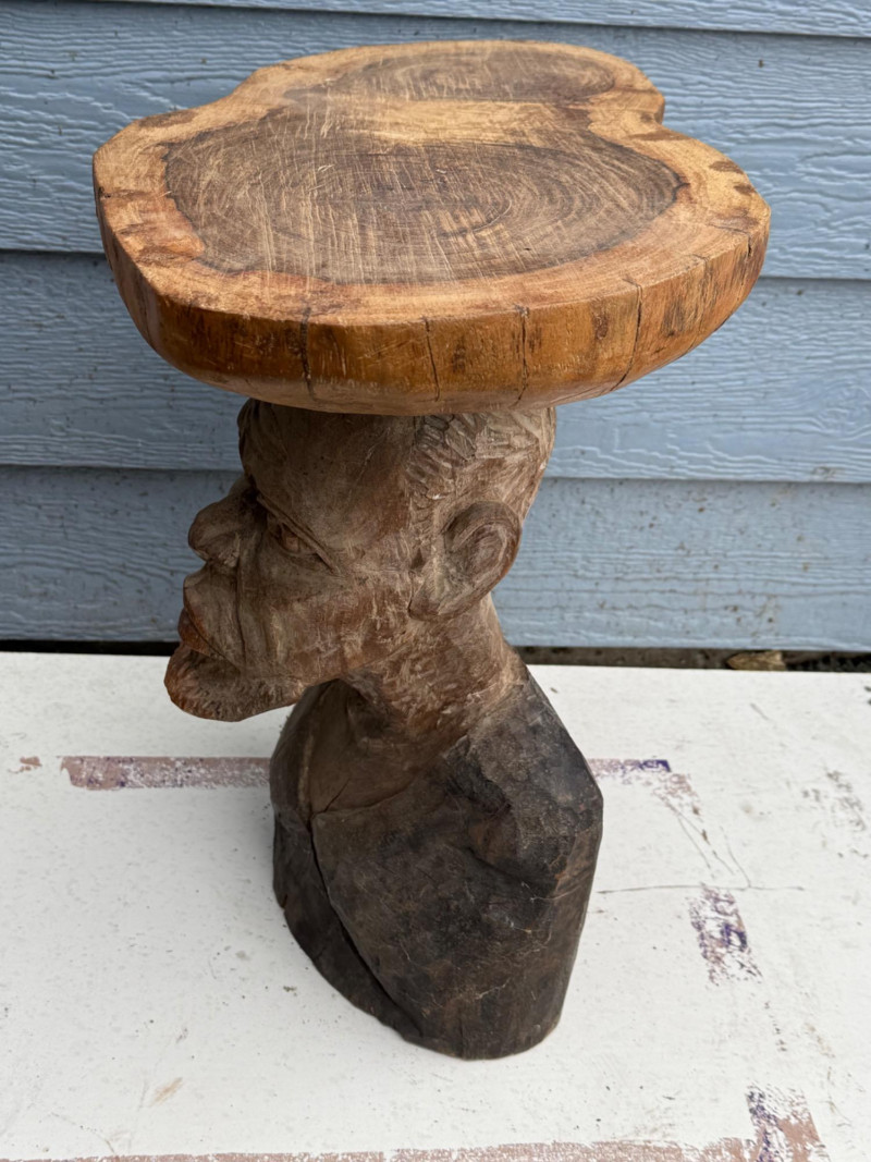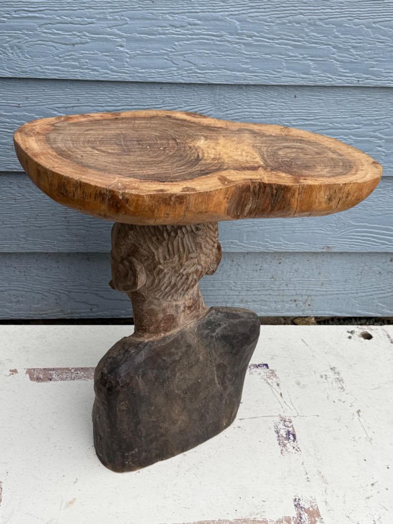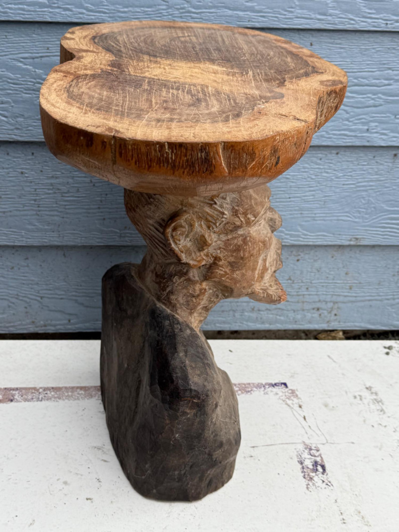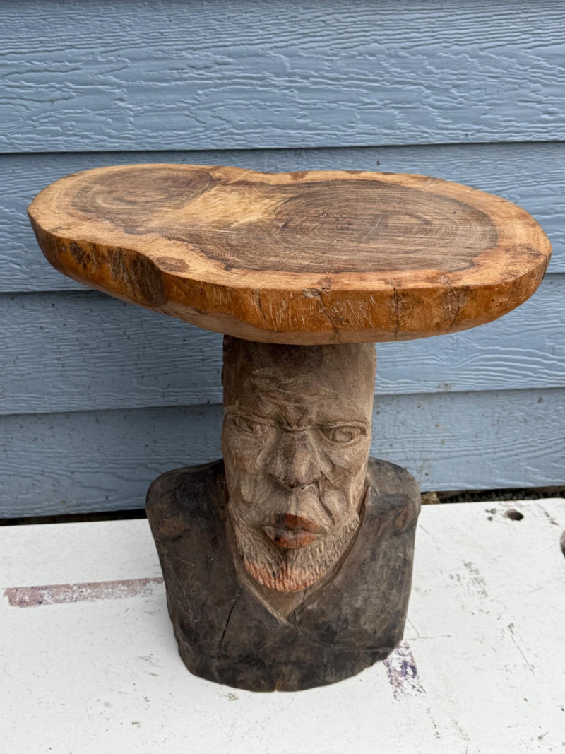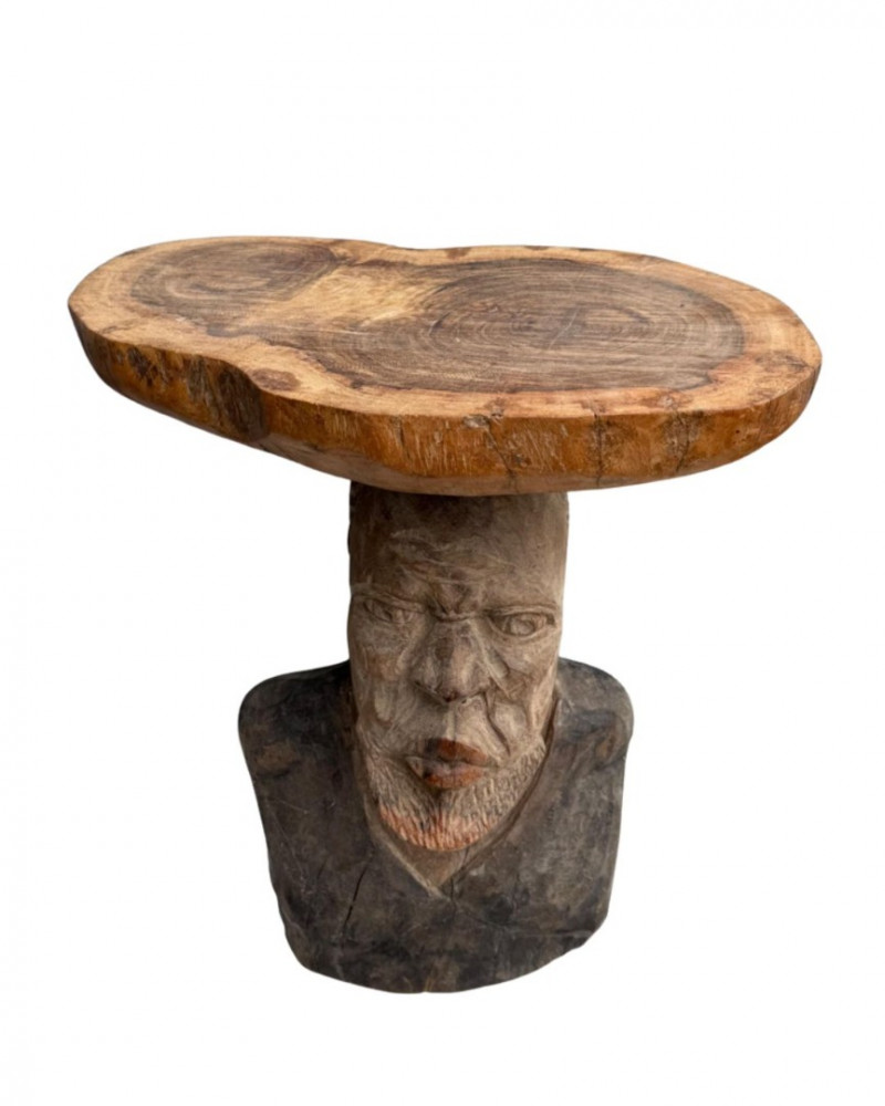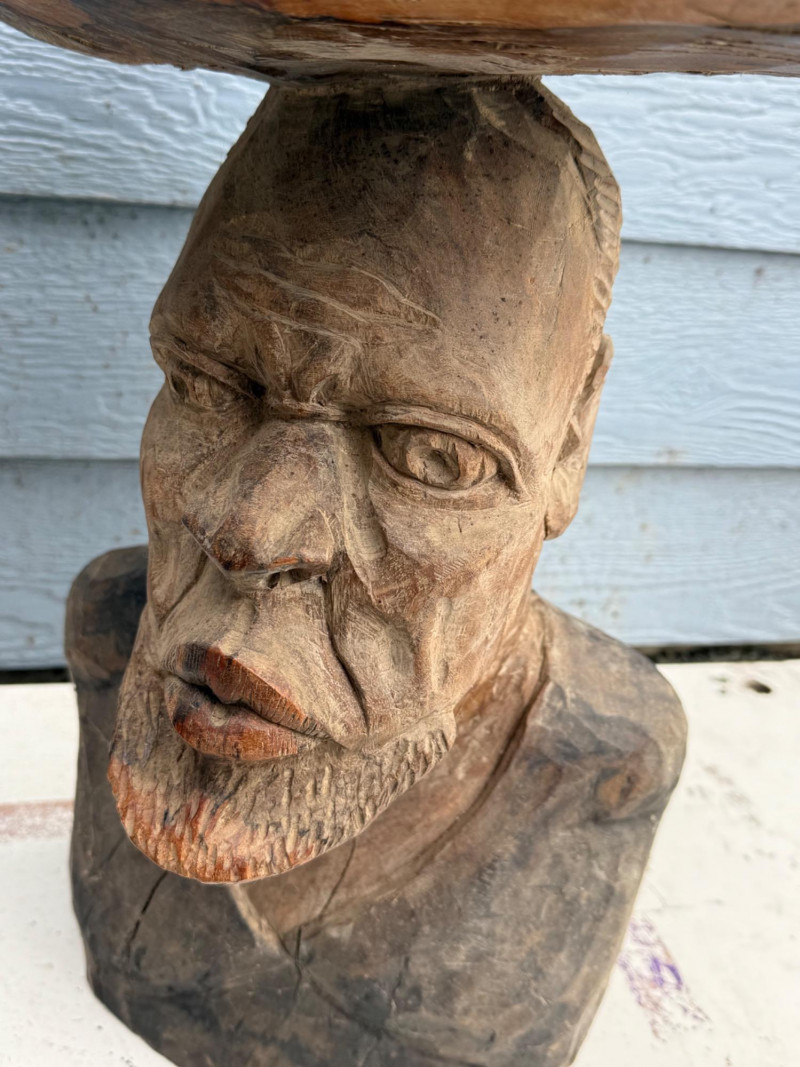 Functional Folk Art / Tribal Decor A handcrafted wooden table or stand featuring a sculptural base carved in the form of a male bust. The figure is rendered with expressive detail, including a furrowed brow, deep-set eyes, prominent nose, and full beard. The shoulders and upper chest form the support for a natural, unfinished wood slab tabletop, which retains its organic shape and visible growth rings. The piece blends rustic utility with artistic craftsmanship. Material: Solid carved hardwood base; natural wood slab top Finish: Base: Matte with visible grain and tool marks Top: Unfinished slab with bark edge and growth rings Design Features: Bust includes carved facial features: furrowed brow, deep eyes, defined nose, and beard Shoulders and chest form a stable platform for the tabletop Top is a cross-cut slab with irregular edge and natural texture Very heavy Details