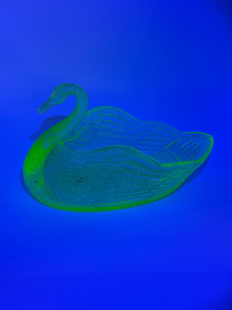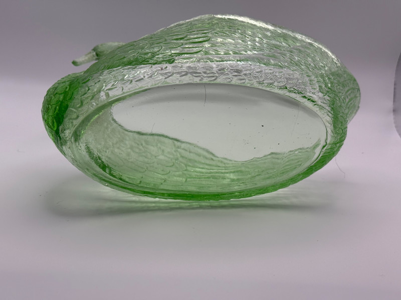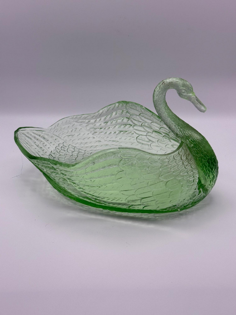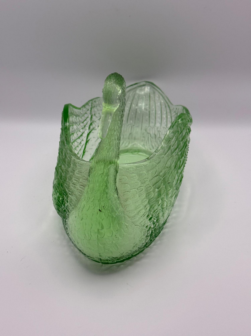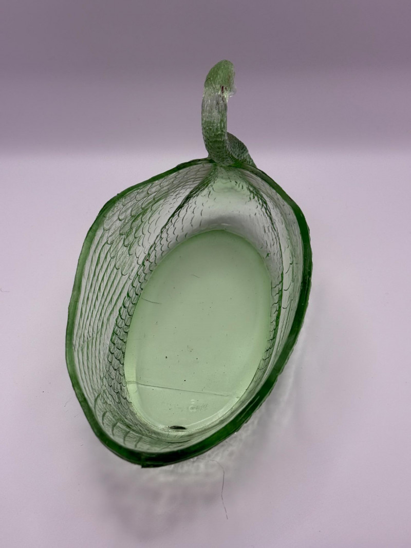 A molded green Vaseline glass dish in the form of a swan, measuring 8.5" long by 5.5" wide. The swan’s arched neck and head form the front of the piece, while the wings and body create a shallow bowl suitable for wrapped candies, trinkets, or display. The glass is textured to mimic feathering, with molded detail along the wings, tail, and base. The piece is pressed rather than blown, with a flat base and defined mold lines. Glass Type: Uranium-infused Vaseline glass (glows under UV light) Color: Translucent yellow-green Finish: Glossy with molded feather texture Construction: Pressed glass with visible mold seams Base: Flat, unmarkedMaterial & Features