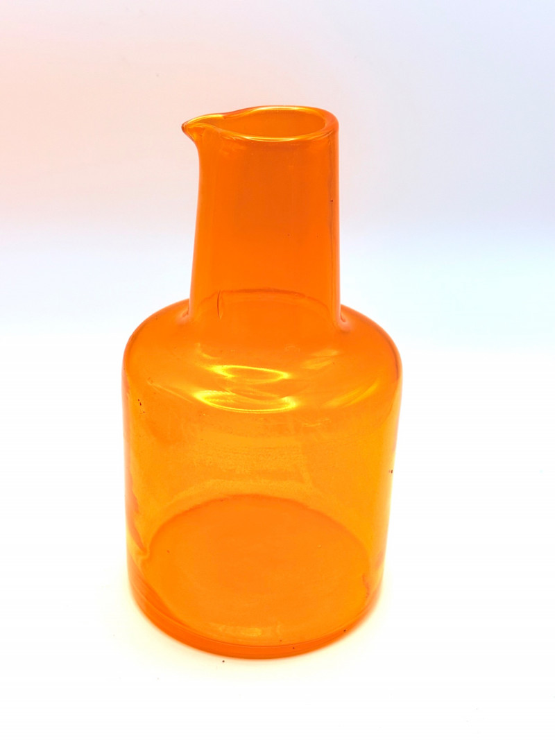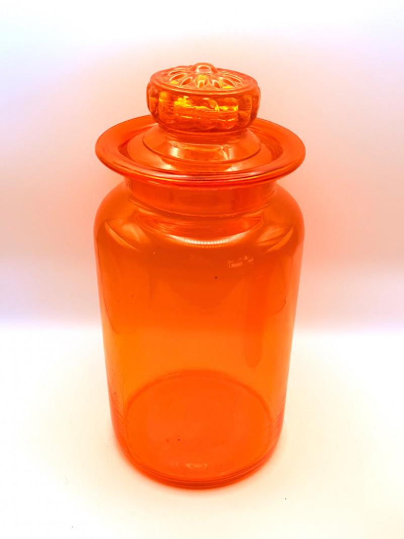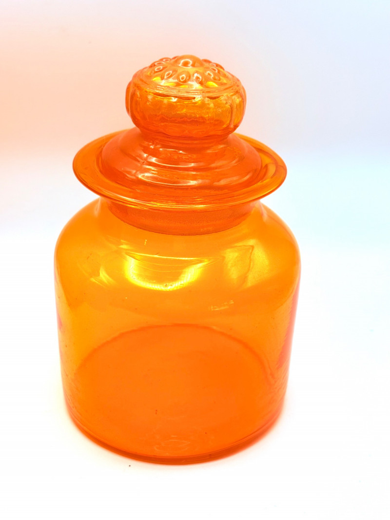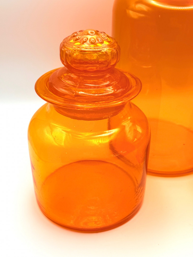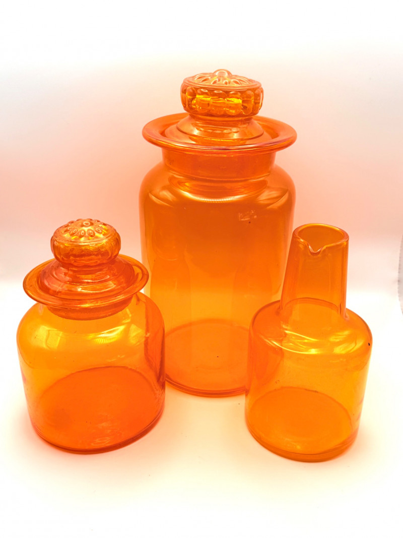 A striking set of three vintage orange glass vessels, each with distinct form and function, unified by their vibrant translucent hue and molded detail. These pieces blend decorative appeal with utilitarian roots, evoking mid-century apothecary and laboratory aesthetics. Tall Jar (Center): Height: Approx. 9.5" Design: Wide base tapering to a flared neck Lid: Molded dome lid with knob finial Function: Decorative storage or candy jar Short Jar (Left): Height: Approx. 7" Design: Compact form with rounded shoulders Lid: Matching knobbed lid Function: Small apothecary-style container Spouted Vessel (Right): Height: Approx. 6" Design: Cylindrical body with open spout Lid: None Function: pourer or carafeSet Includes