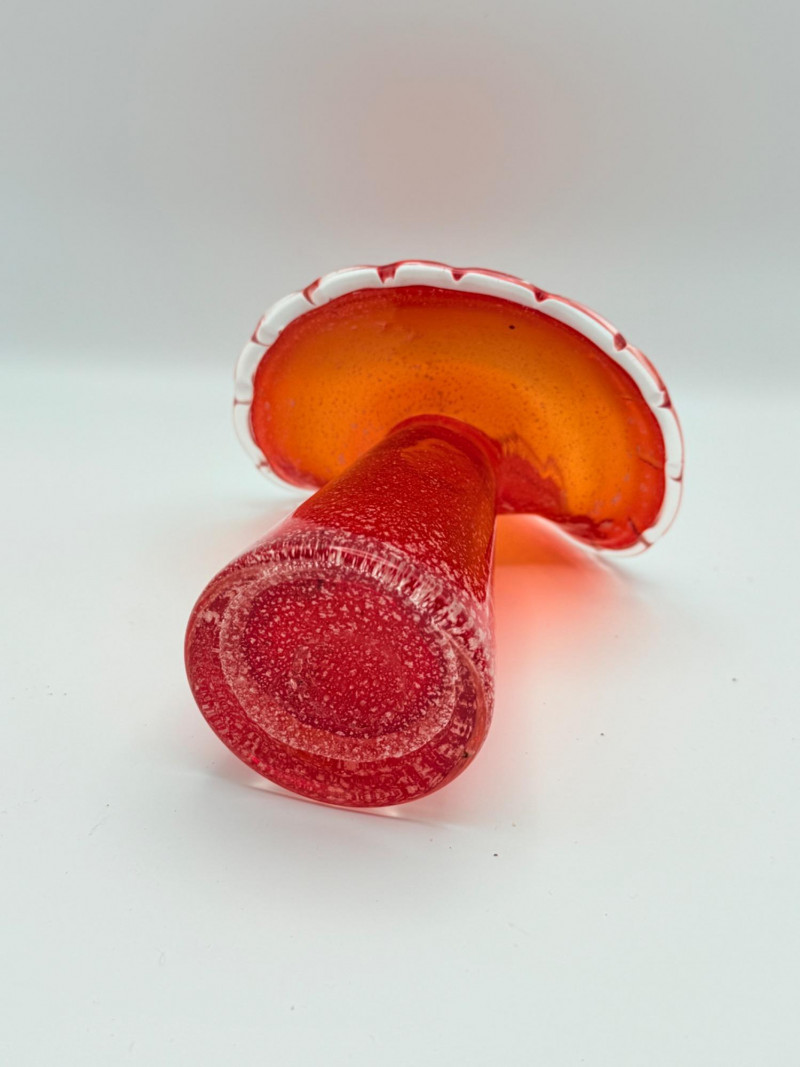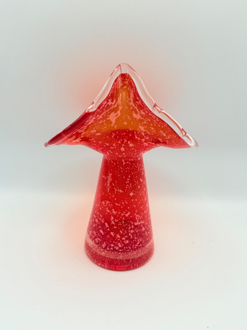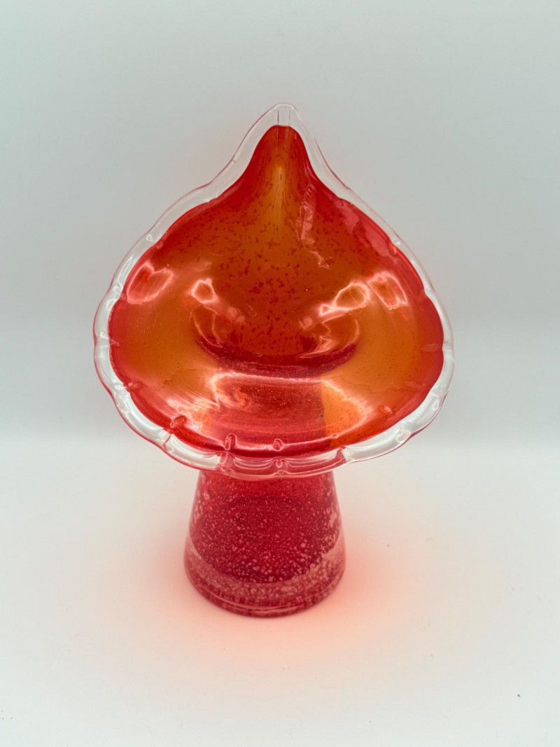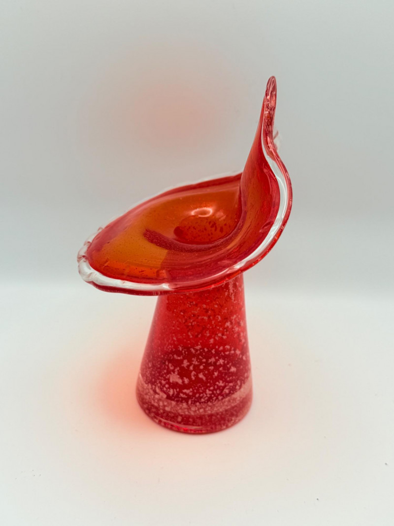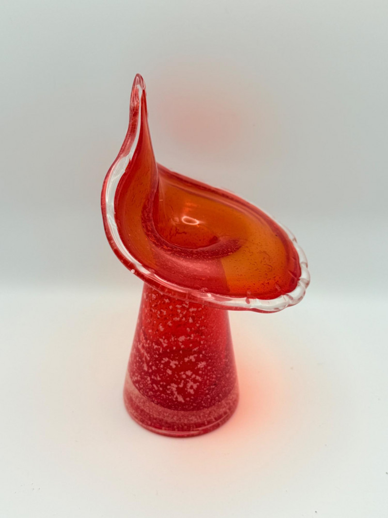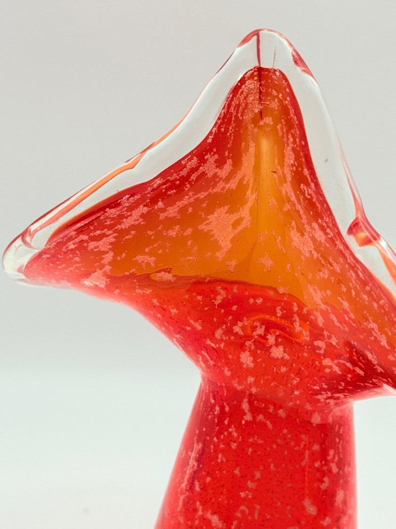 A stylized blown glass sculpture in the form of a flame or teardrop, crafted in layered red and orange glass with a clear outer casing. The piece features a glossy, translucent surface with embedded bubbles and specks throughout, giving it depth and texture. The flame tapers to a soft point and is mounted on a cylindrical base of matching red glass. Material: Blown glass with clear casing and colored core Color: Red-orange inner coloration with clear outer layer Finish: Glossy, with visible air bubbles and speckled inclusionsDetails