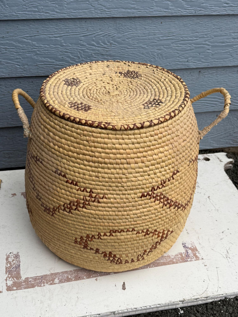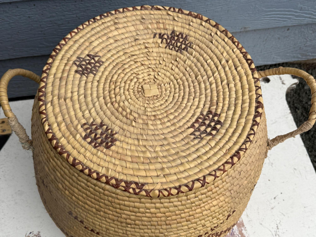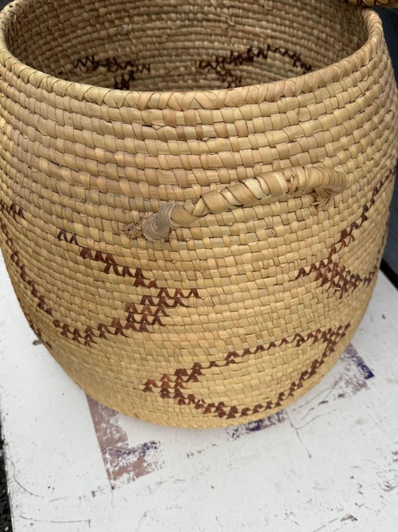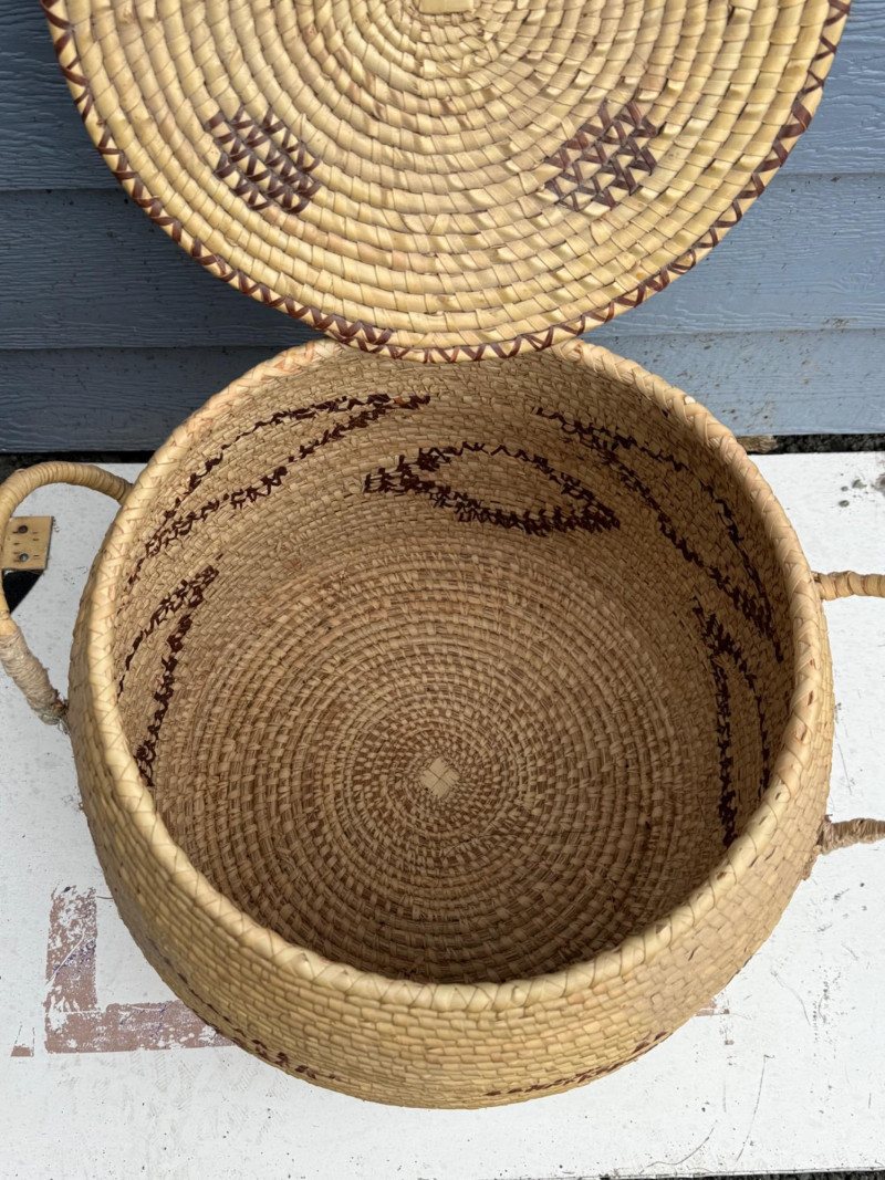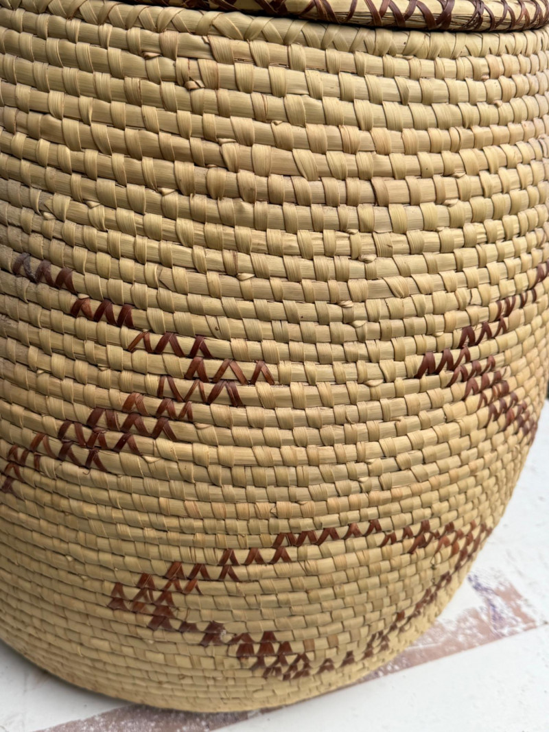 A handwoven lidded basket crafted from natural fibers using a tight coiling technique. The basket features symmetrical geometric patterns in brown against a tan base, woven into both the body and the domed lid. Two looped side handles are integrated into the structure for easy carrying. The lid fits snugly and mirrors the basket’s decorative motif, creating a unified and functional design. Design Features: Coiled construction with tight, uniform stitching Symmetrical geometric motifs woven into body and lid Domed lid with matching pattern and snug fit Two looped side handles for carrying Flat base for stable display