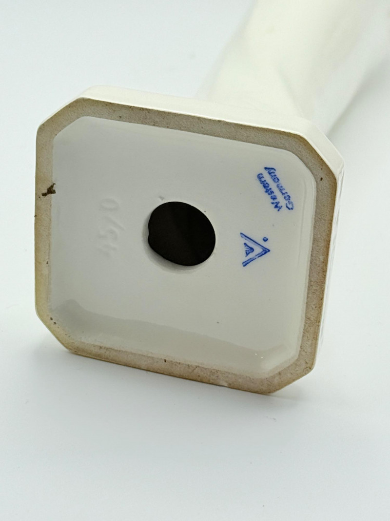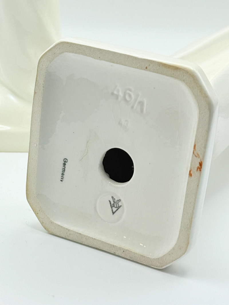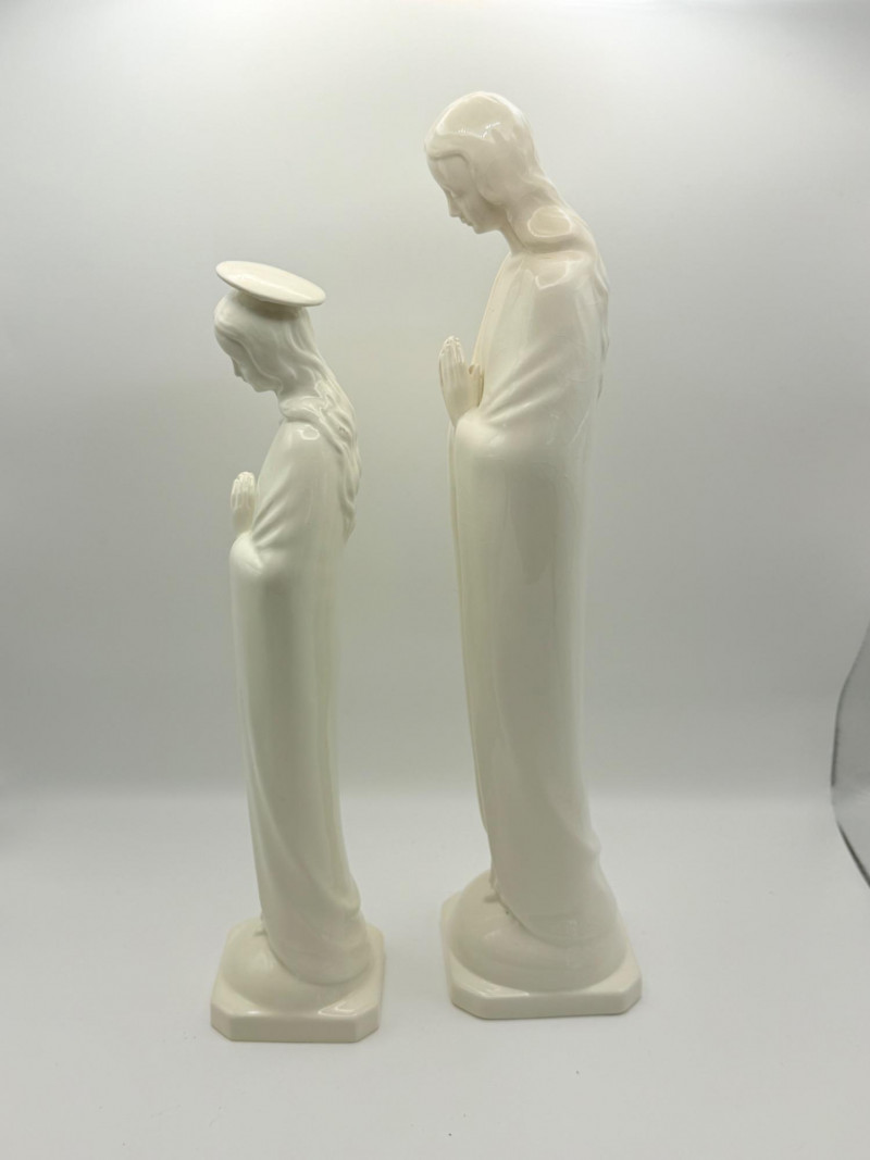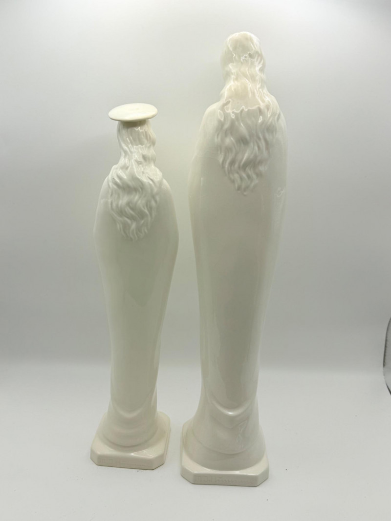 A matched pair of white glazed ceramic figurines by Goebel, depicting religious figures in prayerful poses. Each figure stands with hands pressed together and head gently bowed. The shorter figure features a halo and stylized robes, representing an angel or saint. The taller figure, with longer hair and no halo, likely represents the Virgin Mary. Both pieces reflect Goebel’s signature smooth finish and serene styling, with minimalist contours and reverent expression. Maker: Goebel (Germany) Material: Glazed porcelain ceramic Color: Pure white with glossy finish Details