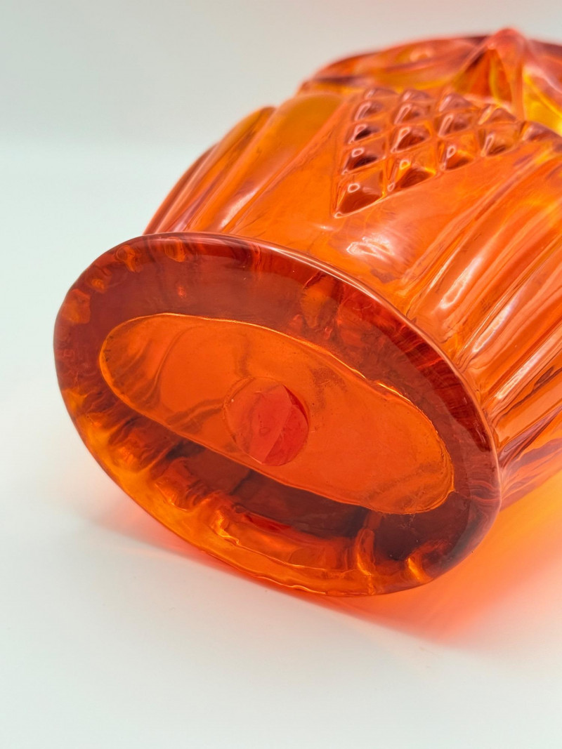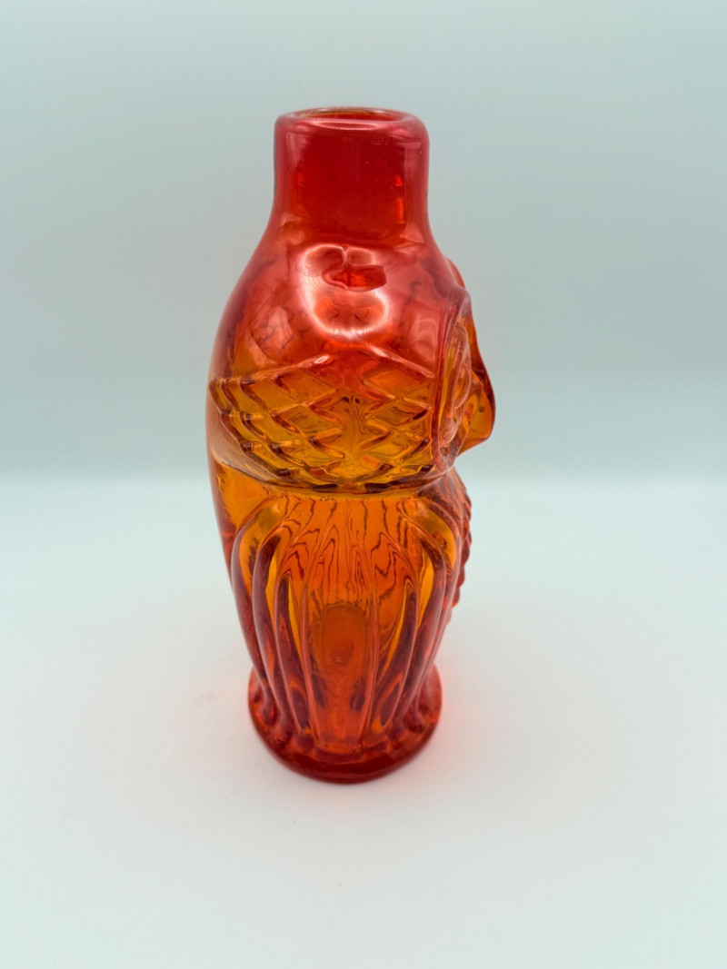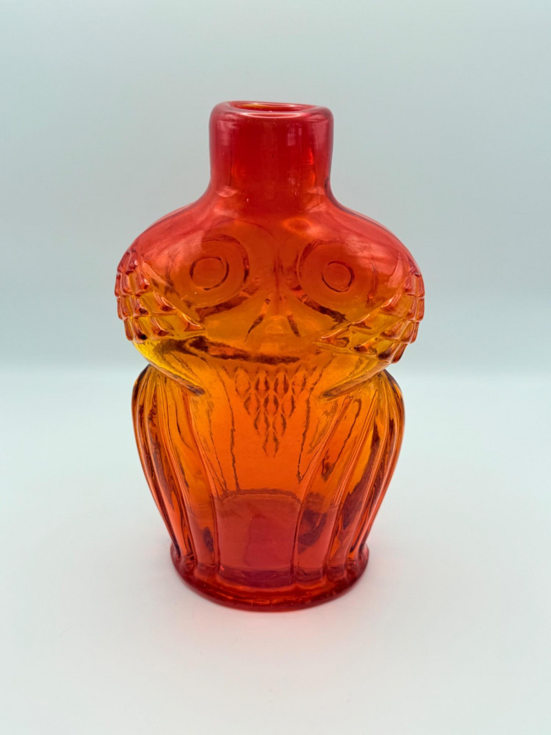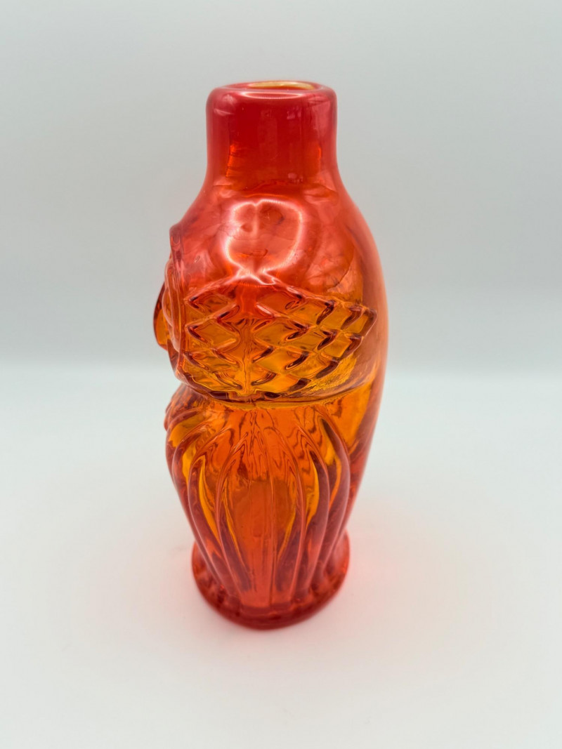 This is a Viking Glass owl vase in vibrant amberina glass, featuring molded concentric eyes, stylized wings, and a ruffled top. The color transitions from deep red to orange, with a translucent finish that catches light beautifully. Produced mid-century, this piece blends figural whimsy with bold glass artistry. A standout for collectors of Viking, animal-themed glass, or retro color palettes. Details: Maker: Viking Glass Era: Mid-20th century Material: Molded amberina glass Design: Owl form with concentric eyes, vertical wing ridges, and ruffled rim Dimensions: Approx. 8.5" H Condition: Excellent; no chips or cracks
