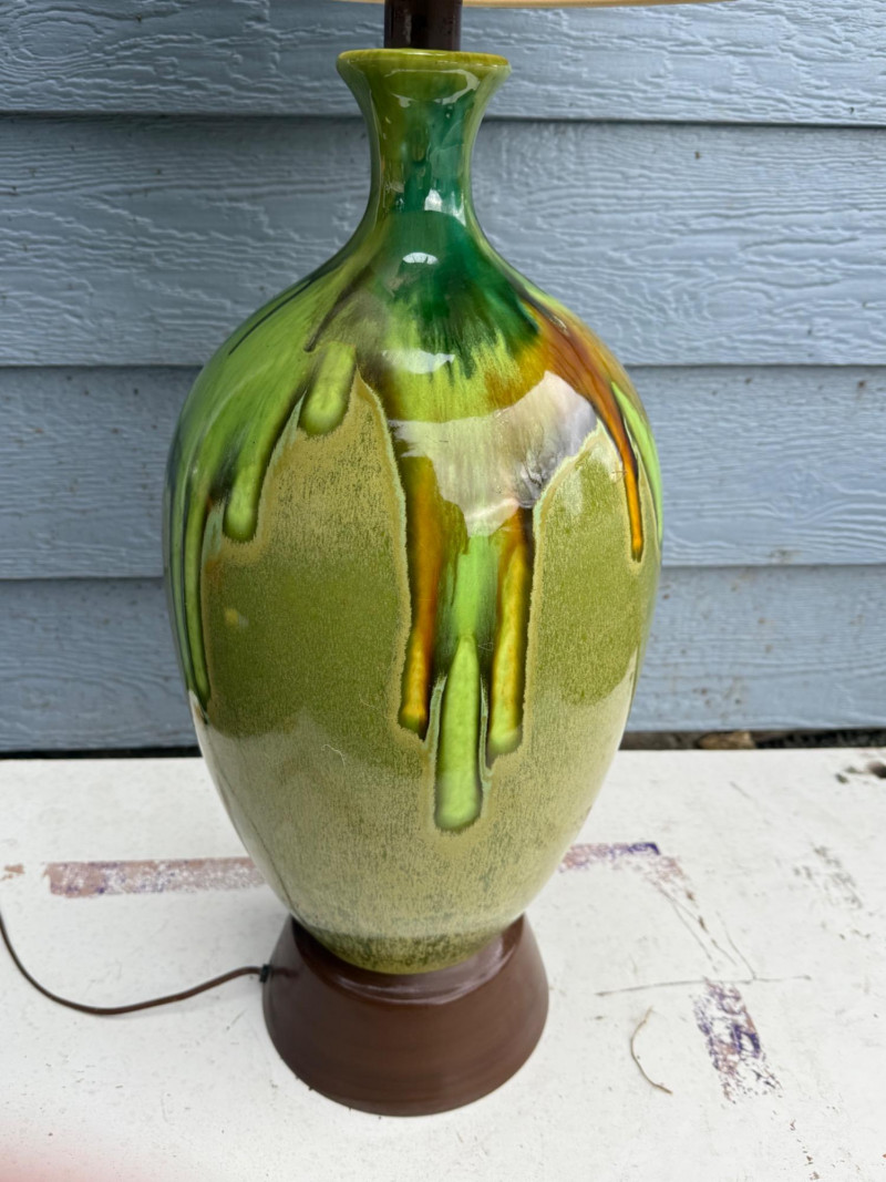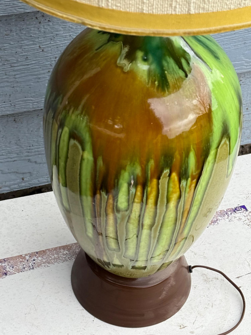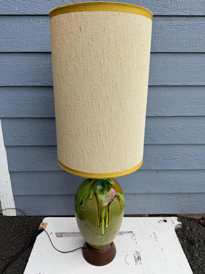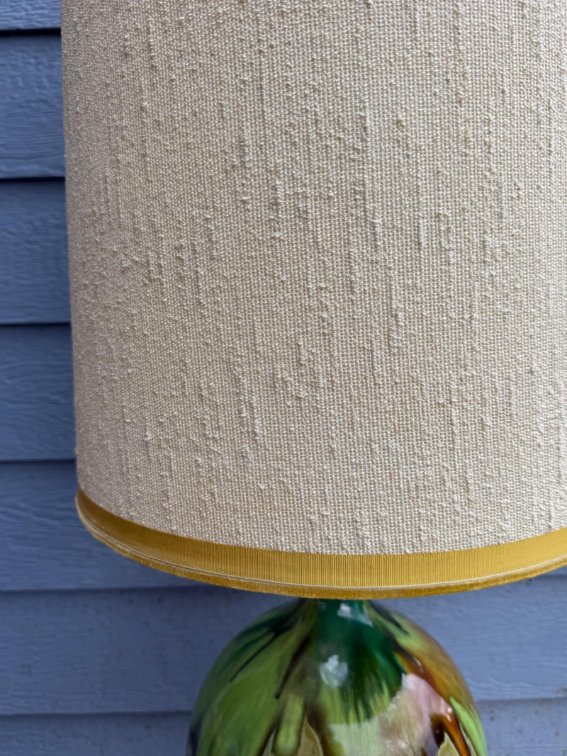 Vintage ceramic lamp attributed to Honi Chilo, featuring a tall cylindrical shade and a glossy drip-glaze base in green and brown tones. The ceramic body sits on a circular wooden stand, and the shade is wrapped in textured beige fabric with yellow trim at the top and bottom. A bold mid-century accent with sculptural presence and collectible appeal. Important Details: Maker: Honi Chilo Material: Ceramic base, wood stand, fabric shade Color: Green and brown glaze; beige shade with yellow trim Dimensions: Approx. 36" H × 16" W Design Features: Glossy drip-glaze ceramic body Tall textured shade with yellow trim Circular wooden base