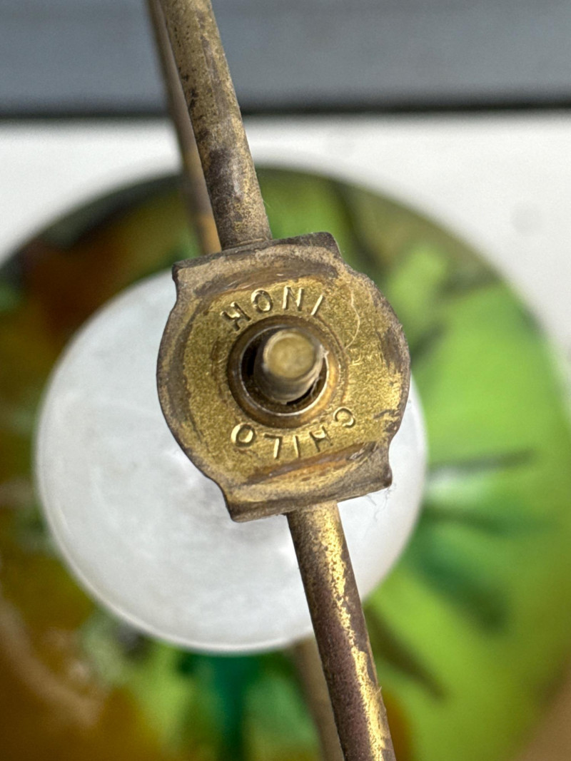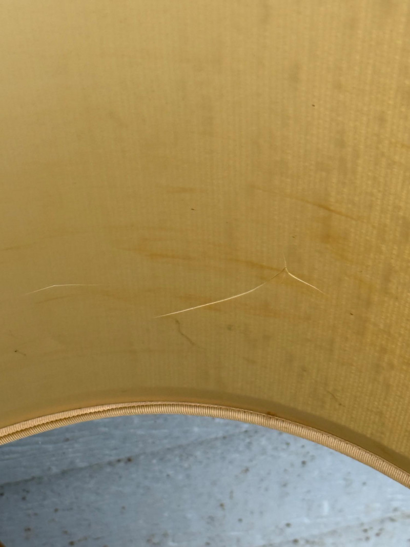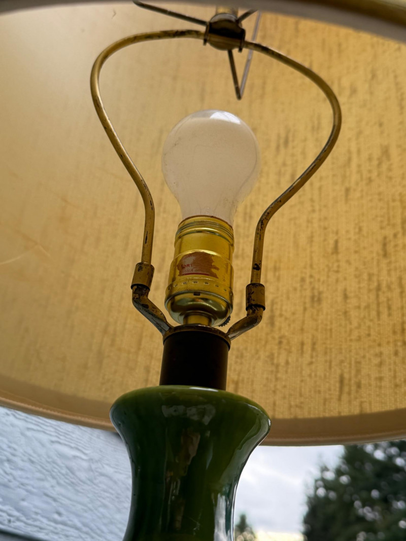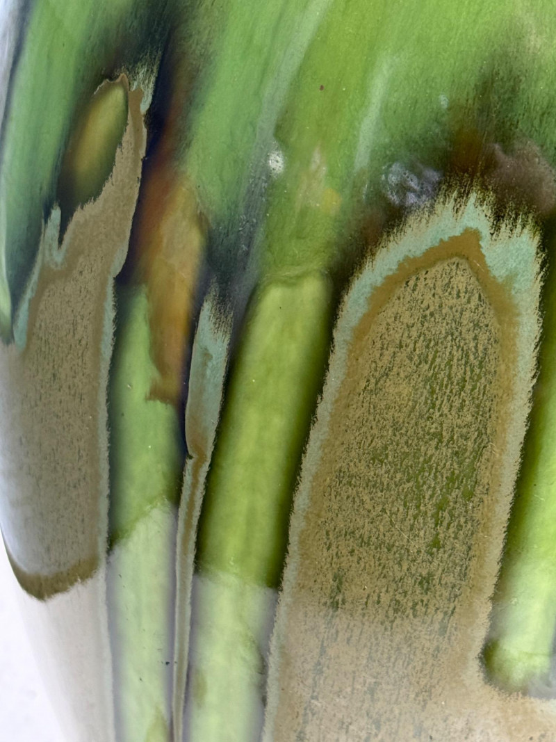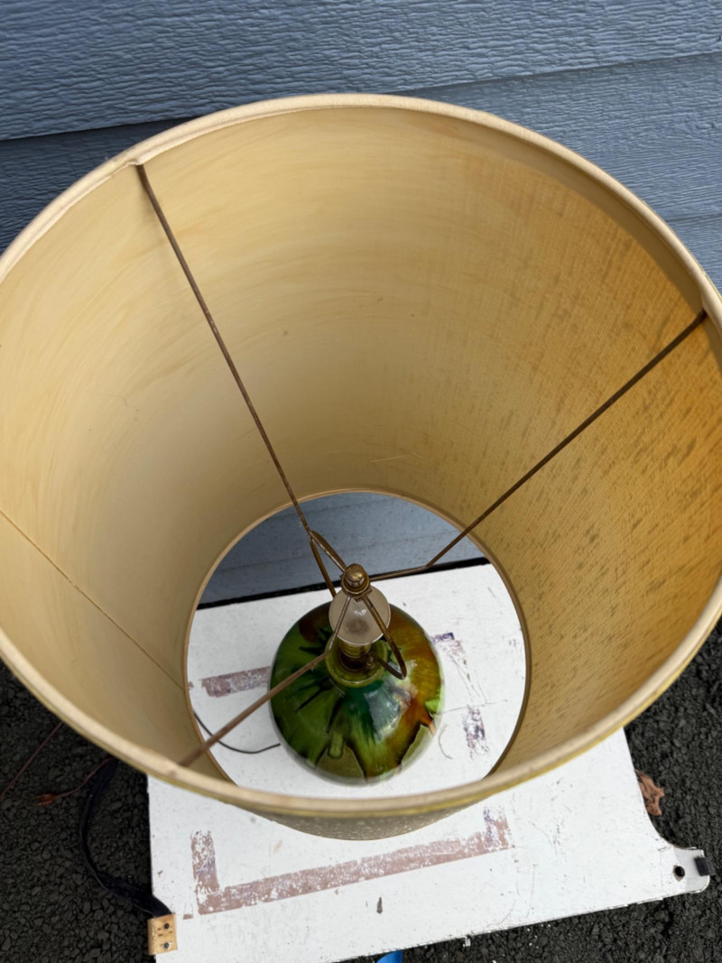 Vintage ceramic lamp attributed to Honi Chilo, featuring a tall cylindrical shade and a glossy drip-glaze base in green and brown tones. The ceramic body sits on a circular wooden stand, and the shade is wrapped in textured beige fabric with yellow trim at the top and bottom. A bold mid-century accent with sculptural presence and collectible appeal. Important Details: Maker: Honi Chilo Material: Ceramic base, wood stand, fabric shade Color: Green and brown glaze; beige shade with yellow trim Dimensions: Approx. 36" H × 16" W Design Features: Glossy drip-glaze ceramic body Tall textured shade with yellow trim Circular wooden base