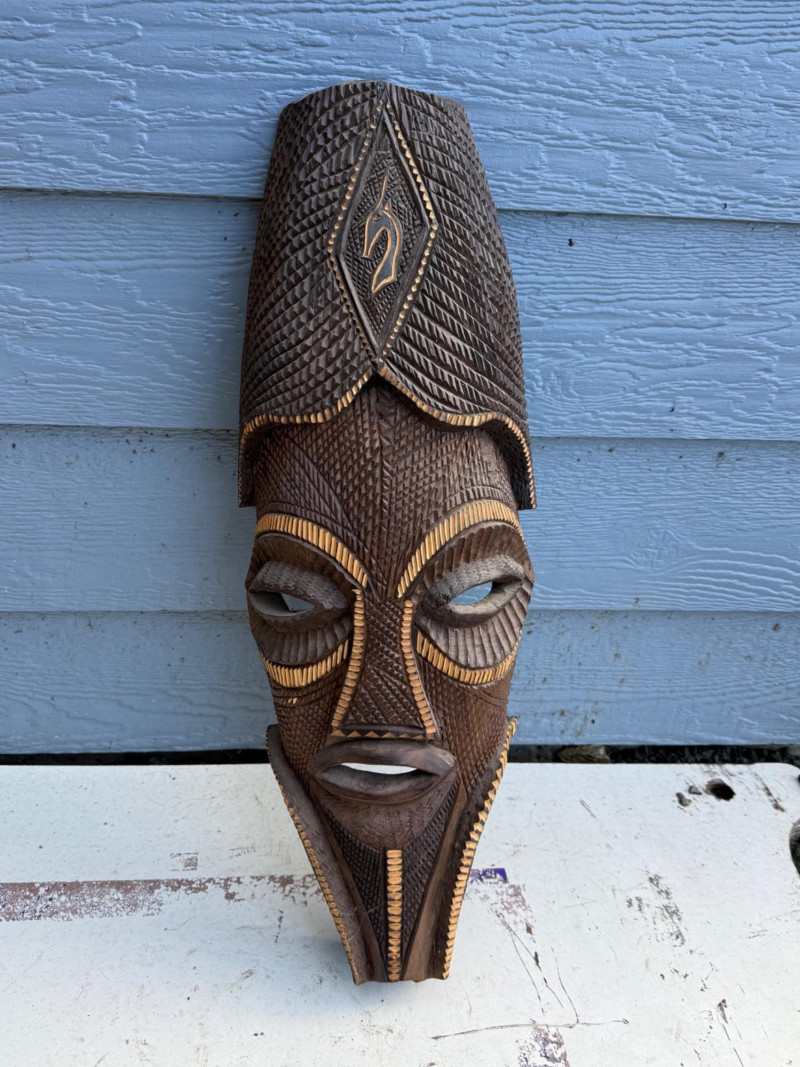 Hand-carved African tribal mask featuring a stylized face with hollowed eyes and mouth, and a prominent diamond-shaped symbol on the forehead. The surface is adorned with geometric carvings and lighter-toned accents that highlight the contours of the face. Traditionally used in ceremonial or decorative contexts, this mask reflects regional craftsmanship and symbolic design. Important Details: Material: Carved wood Design Features: Diamond forehead motif with symbolic marking Hollowed eyes and mouth Geometric and tribal carvings Light-toned accents for contrast Dimensions: Approx. 25" H × 9" W