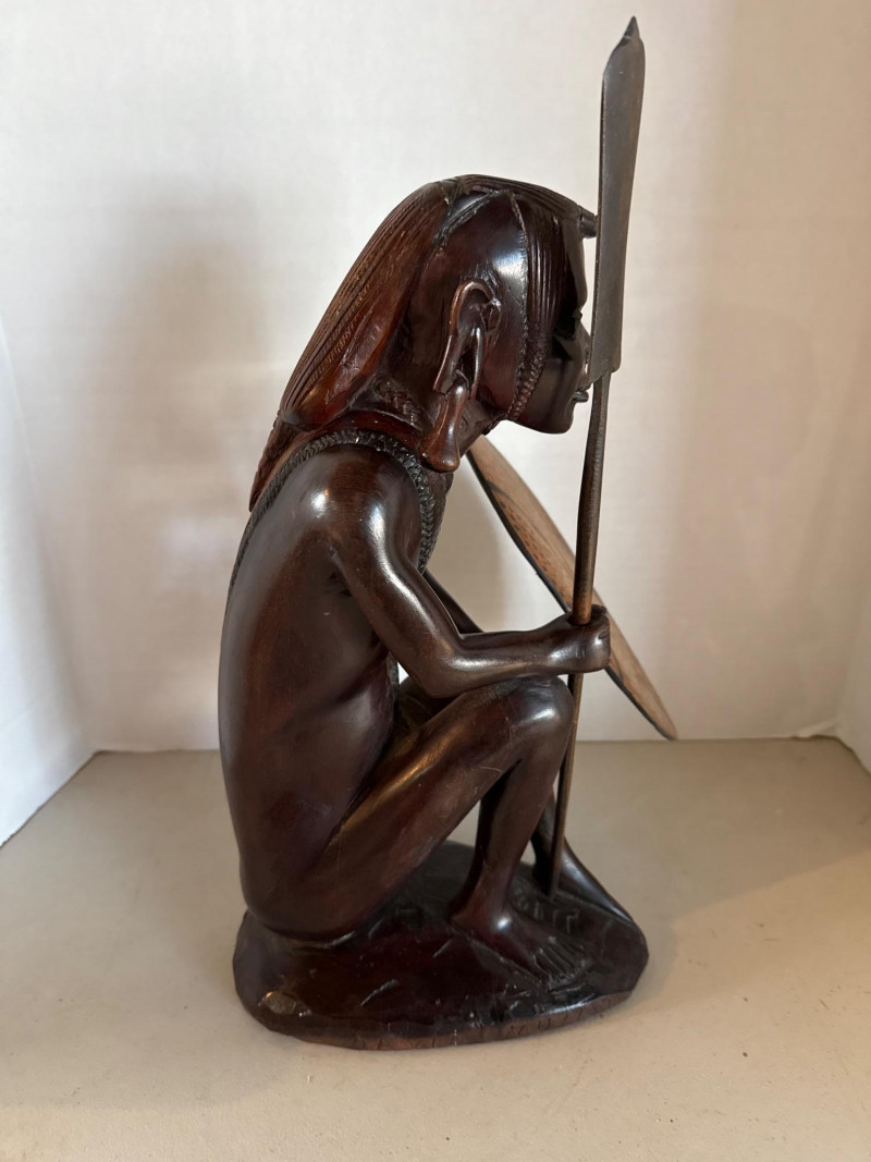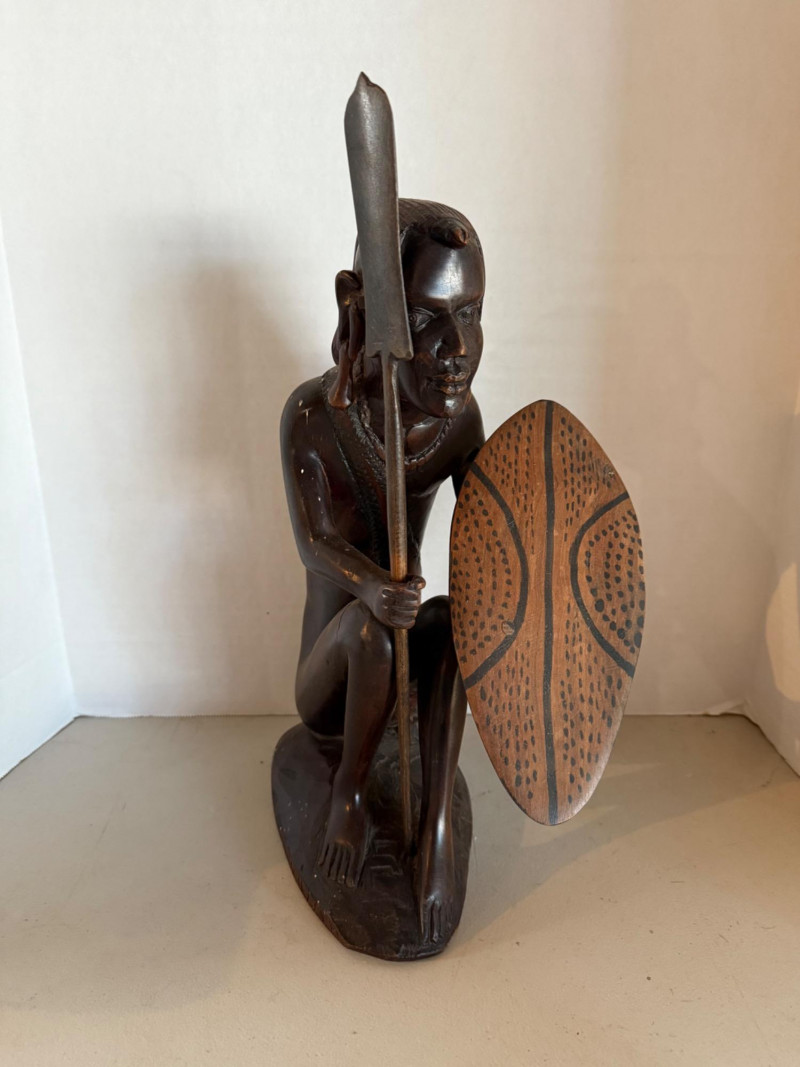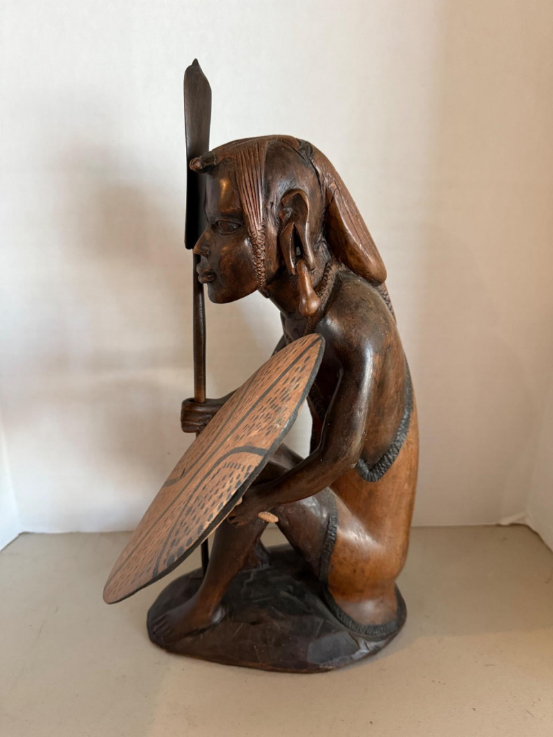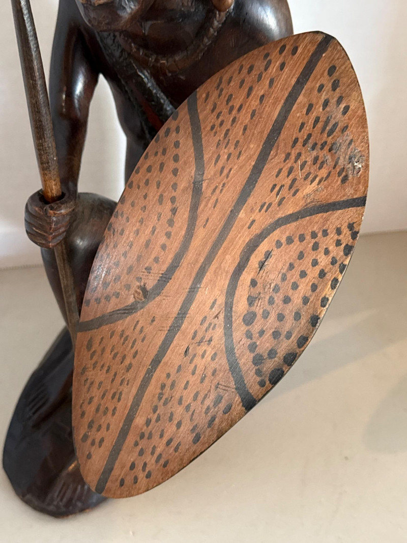 The statue is typically made from carved wood, possibly Jacaranda wood. The figure is shown in a crouching or seated position, holding a long spear and a distinctive oval shield. The shield features a traditional design, often with colors like red, black, or brown, which can indicate the warrior's status or experience.