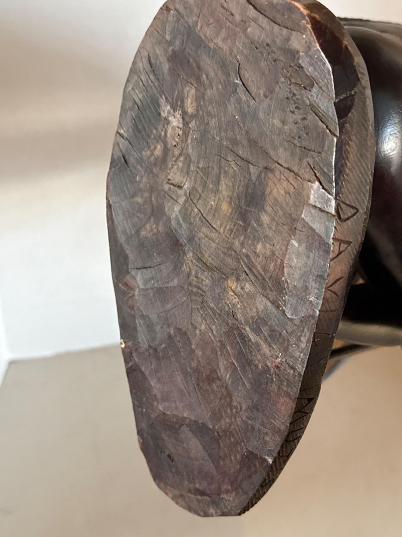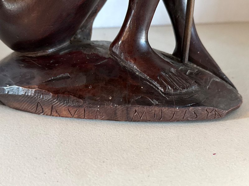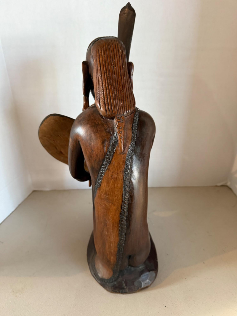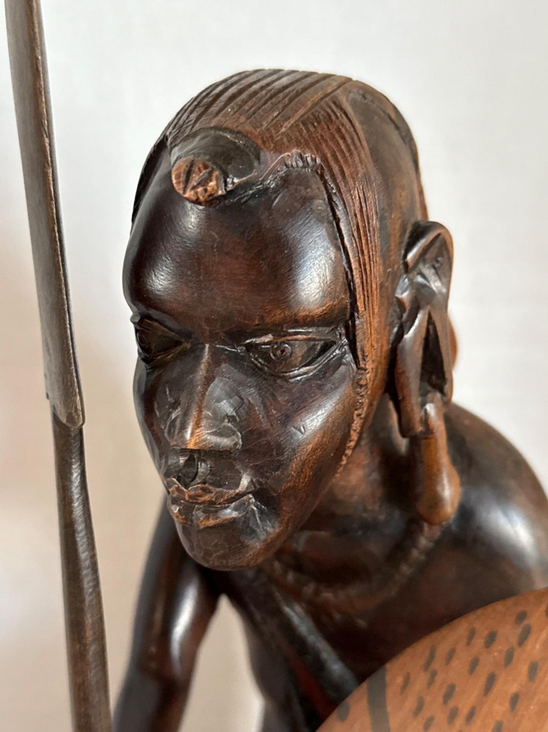 The statue is typically made from carved wood, possibly Jacaranda wood. The figure is shown in a crouching or seated position, holding a long spear and a distinctive oval shield. The shield features a traditional design, often with colors like red, black, or brown, which can indicate the warrior's status or experience.