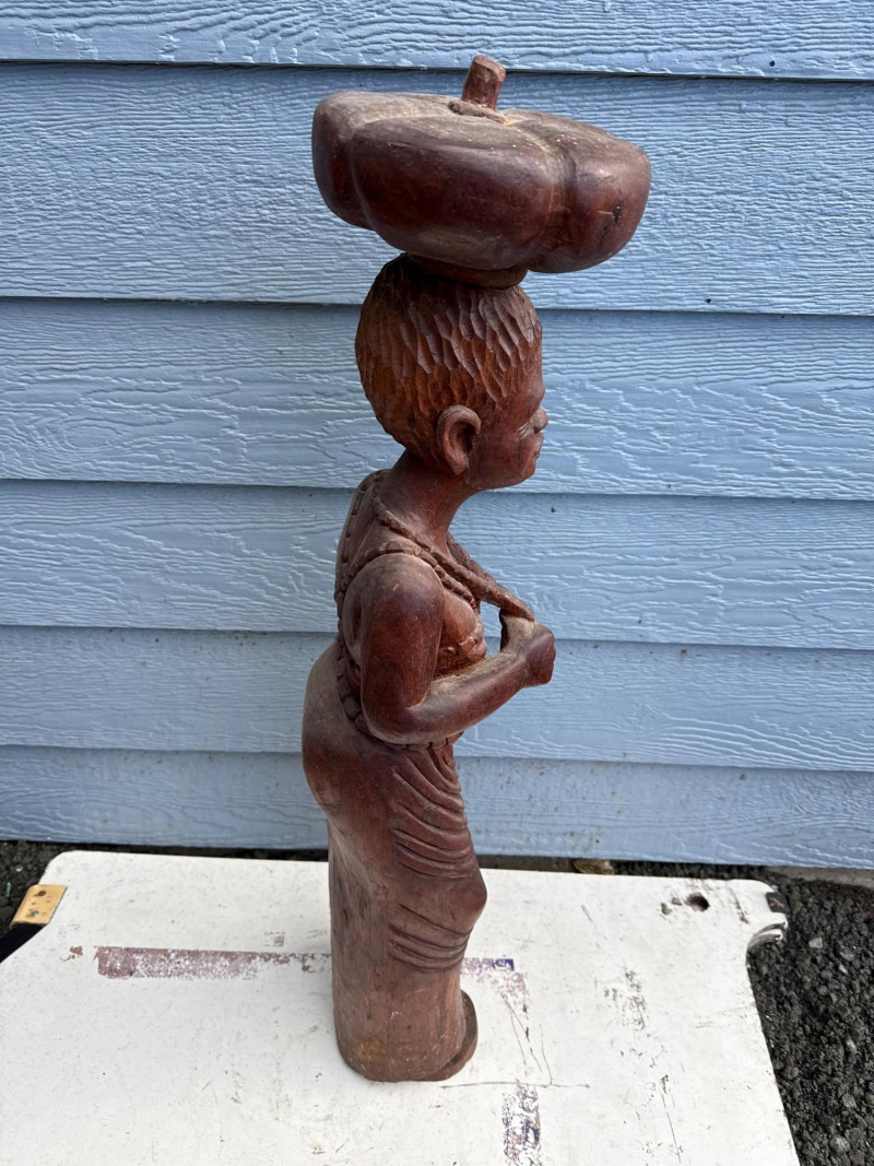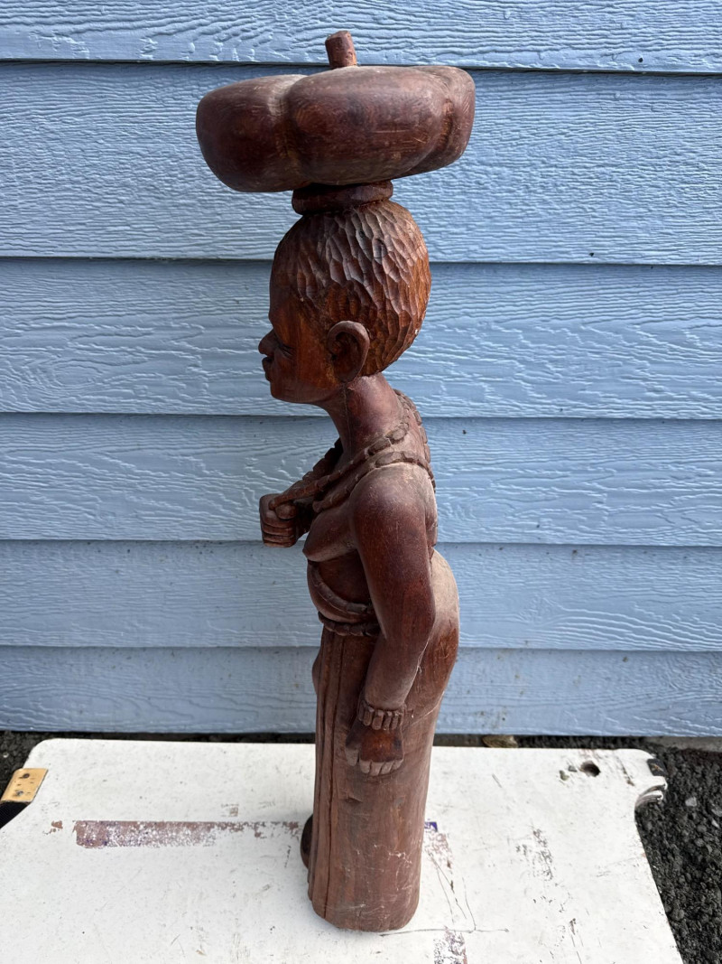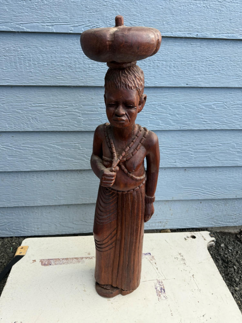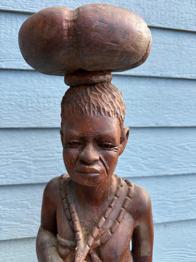 Hand-carved African wooden statue depicting a standing figure balancing a rounded vessel atop the head. The figure wears traditional attire, including a textured wrap-around skirt and beaded necklace, with finely carved facial features and hair texture. This piece reflects tribal artistry and cultural symbolism, often associated with themes of labor, ritual, and community. A striking decorative or collectible item with vintage appeal. Important Details: Material: Carved wood (possibly ebony or mahogany)