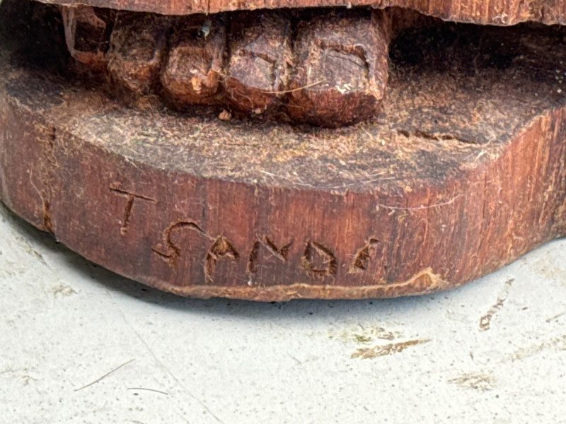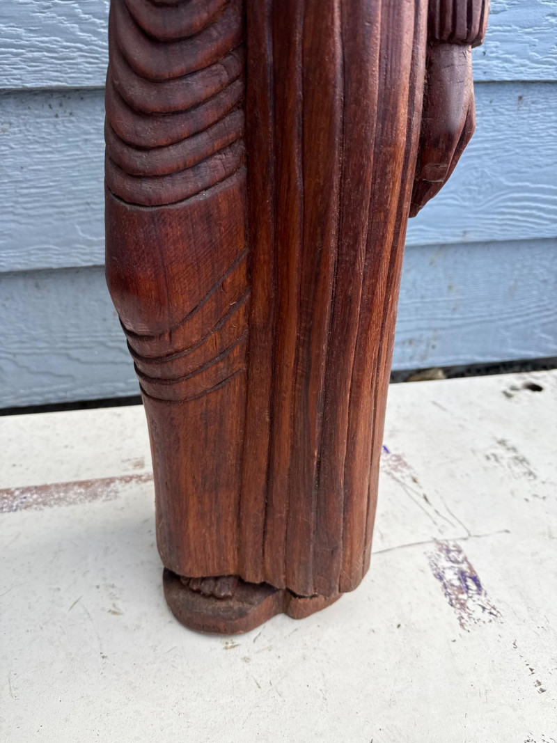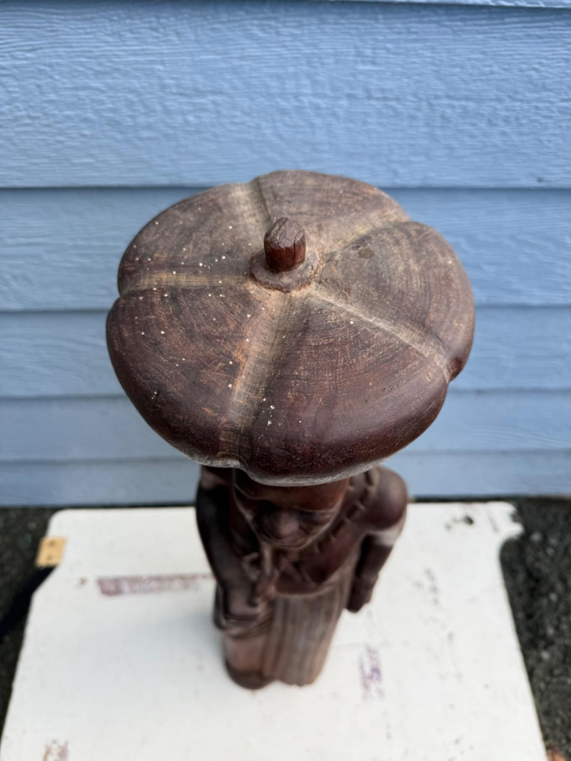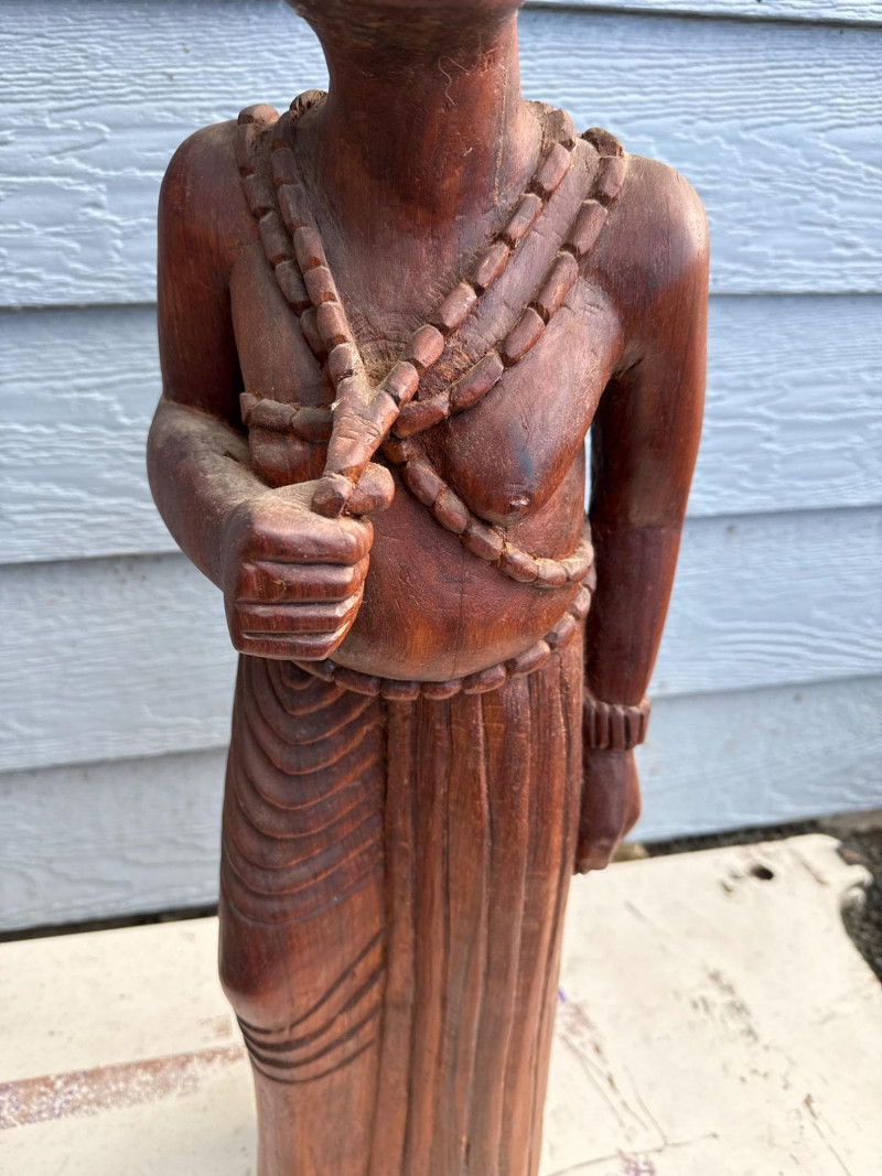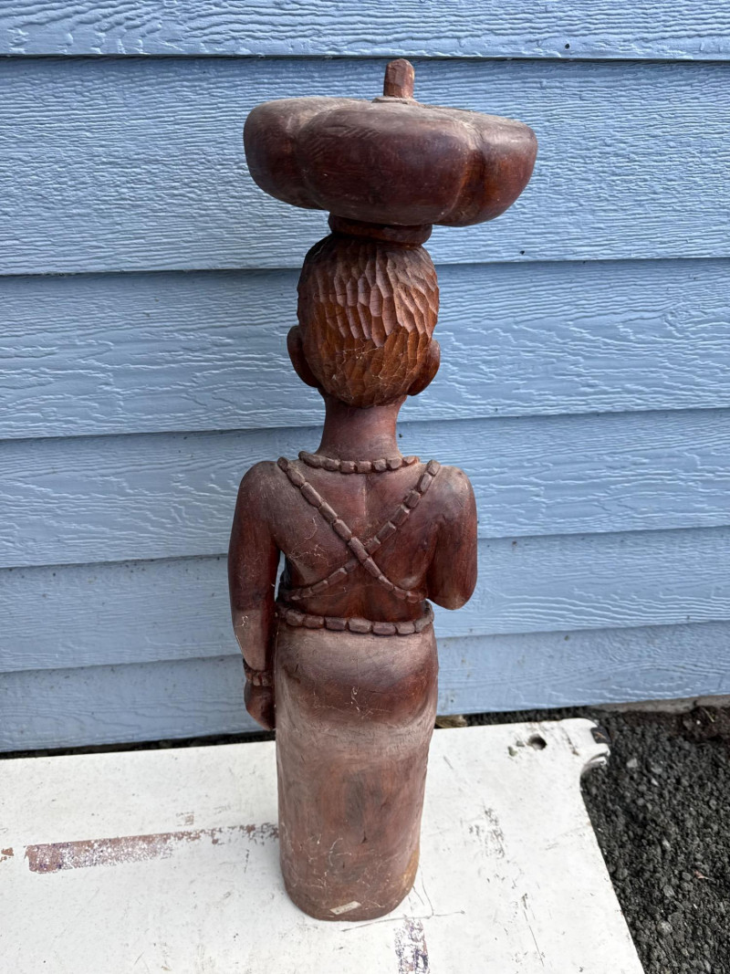 Hand-carved African wooden statue depicting a standing figure balancing a rounded vessel atop the head. The figure wears traditional attire, including a textured wrap-around skirt and beaded necklace, with finely carved facial features and hair texture. This piece reflects tribal artistry and cultural symbolism, often associated with themes of labor, ritual, and community. A striking decorative or collectible item with vintage appeal. Important Details: Material: Carved wood (possibly ebony or mahogany)