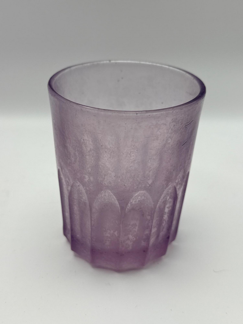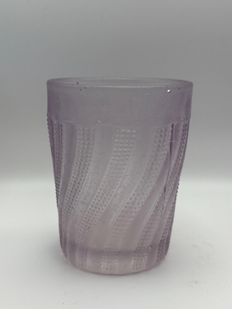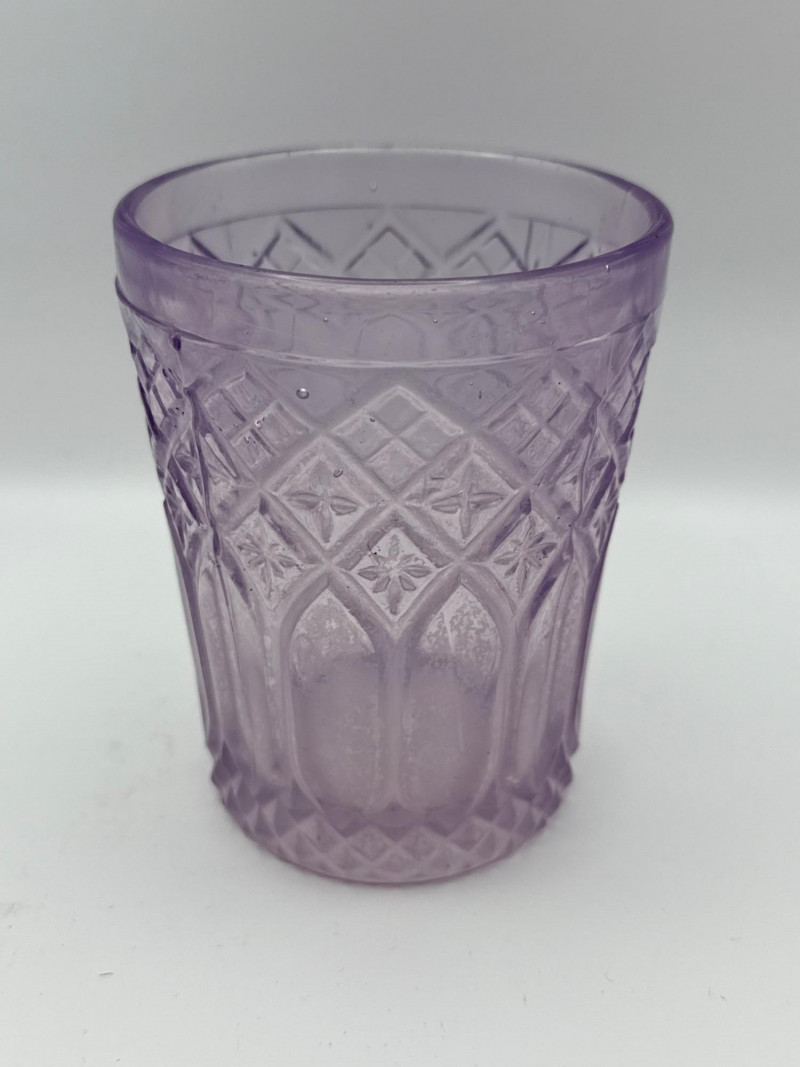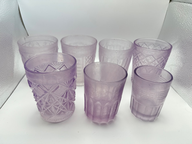 Clear glass turns purple due to a photochemical reaction called solarization, caused by long-term exposure to ultraviolet (UV) light. This happens in older glass that contains manganese dioxide as a clarifying agent, which reacts with UV rays to produce the purple hue. The deeper the purple, the longer the glass was exposed and the more manganese it contains. Material: Solarized manganese glass Age: Pre-1915 Style: Pressed glass tumblers with varied embossed patterns Important Details: Set of 7; varying sizes and designs; a couple have dings; one stamped “Made in Belgium”