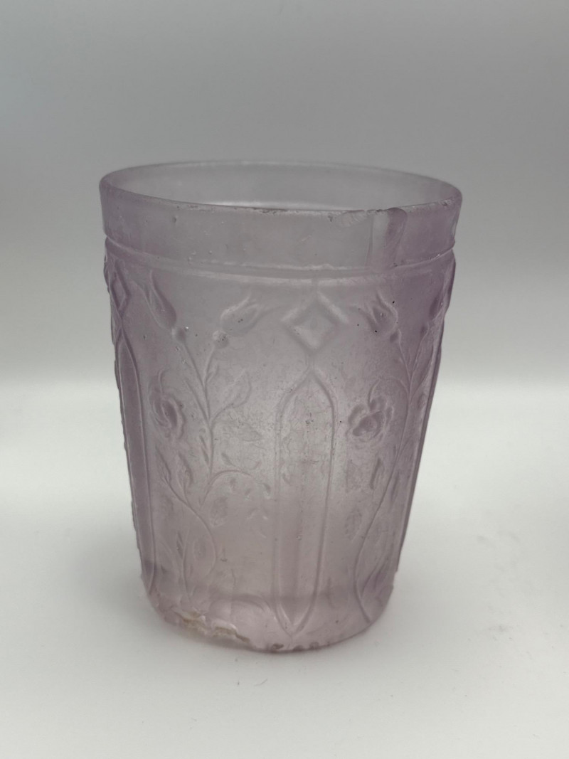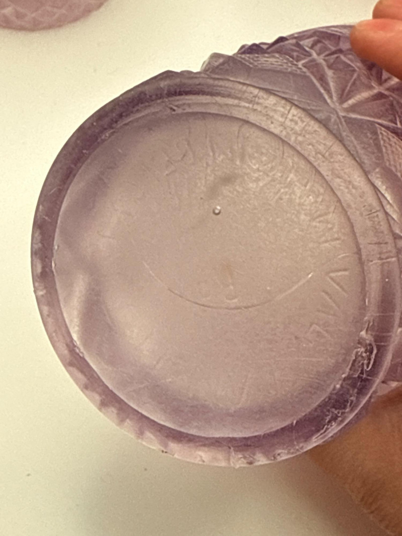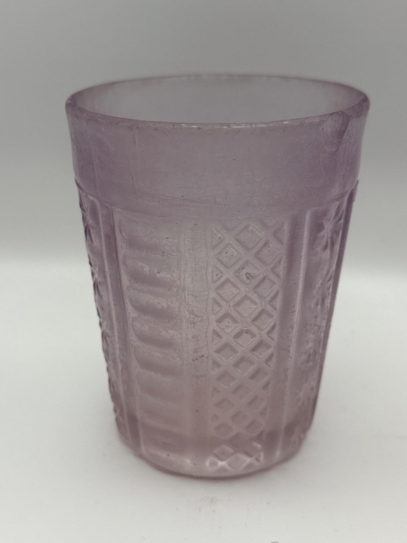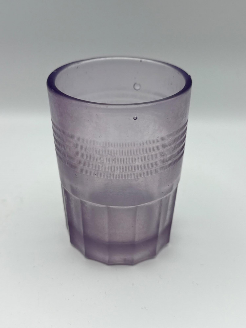 Clear glass turns purple due to a photochemical reaction called solarization, caused by long-term exposure to ultraviolet (UV) light. This happens in older glass that contains manganese dioxide as a clarifying agent, which reacts with UV rays to produce the purple hue. The deeper the purple, the longer the glass was exposed and the more manganese it contains. Material: Solarized manganese glass Age: Pre-1915 Style: Pressed glass tumblers with varied embossed patterns Important Details: Set of 7; varying sizes and designs; a couple have dings; one stamped “Made in Belgium”