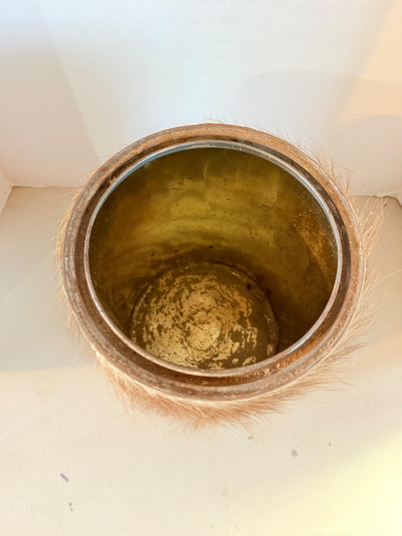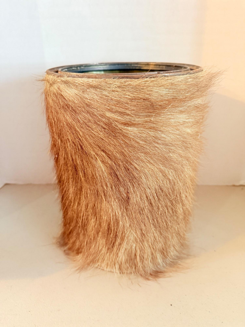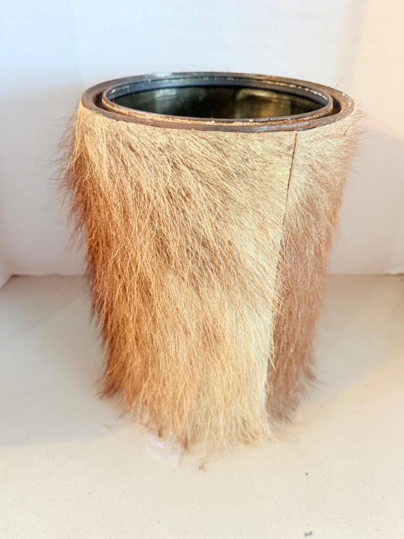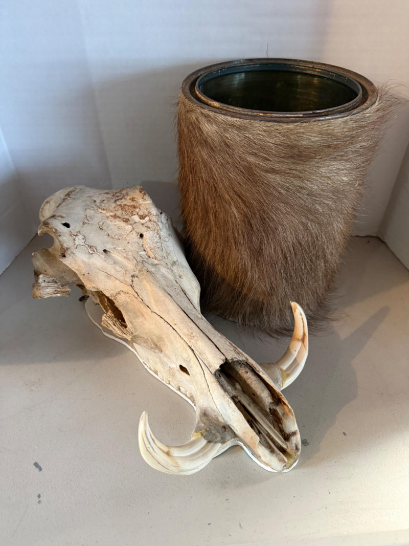 Unusual and eye-catching pairing of a bleached warthog skull with prominent tusks and a cylindrical trash bin wrapped in brown fur. The skull features weathered bone texture and natural cavities, while the bin offers a hollow interior with a metallic rim and fur exterior. Together, they evoke rugged safari aesthetics and primal design—ideal for themed interiors, hunting lodges, or collectors of the wild and weird. Important Details: Material: Skull: Natural warthog bone Bin: Metal interior with faux or natural fur wrap