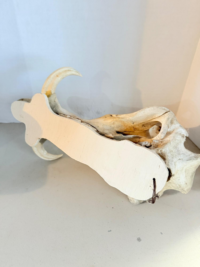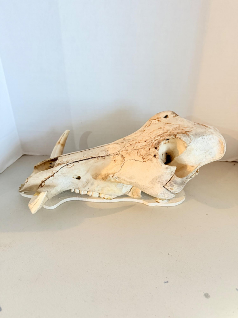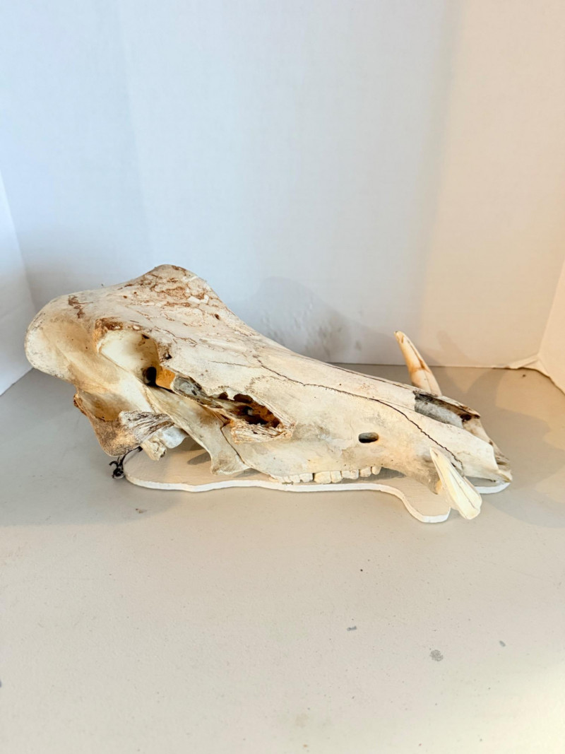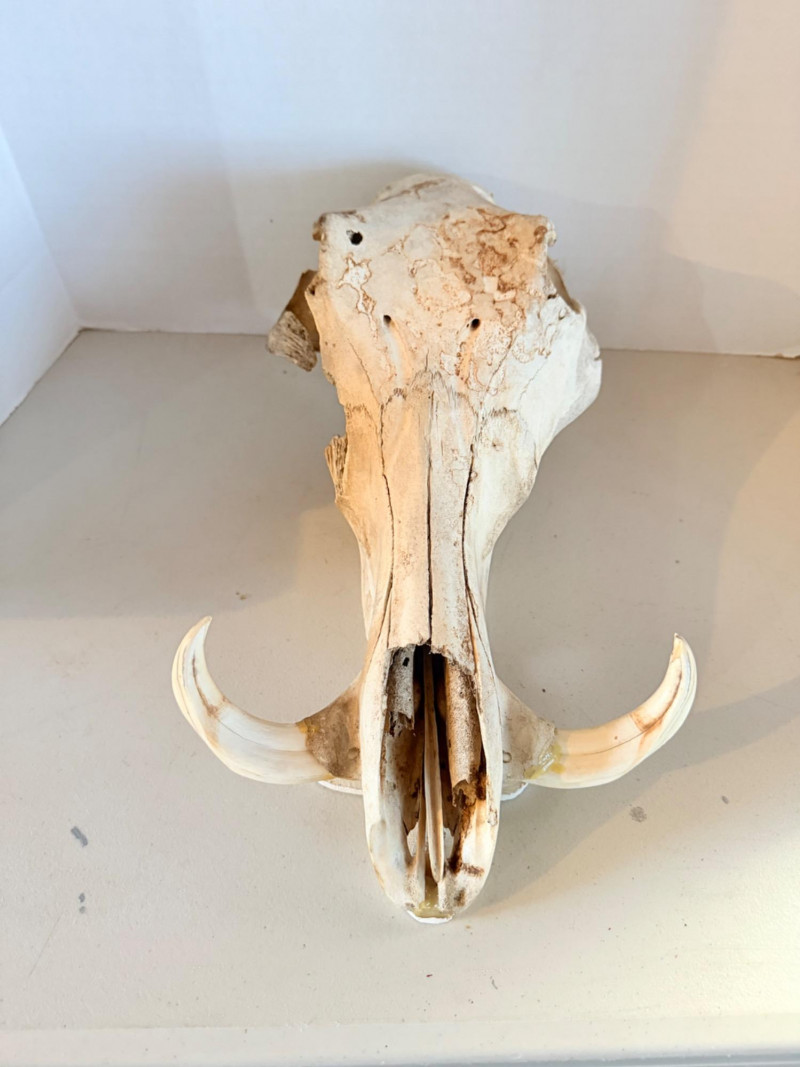 Unusual and eye-catching pairing of a bleached warthog skull with prominent tusks and a cylindrical trash bin wrapped in brown fur. The skull features weathered bone texture and natural cavities, while the bin offers a hollow interior with a metallic rim and fur exterior. Together, they evoke rugged safari aesthetics and primal design—ideal for themed interiors, hunting lodges, or collectors of the wild and weird. Important Details: Material: Skull: Natural warthog bone Bin: Metal interior with faux or natural fur wrap