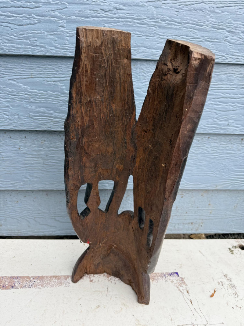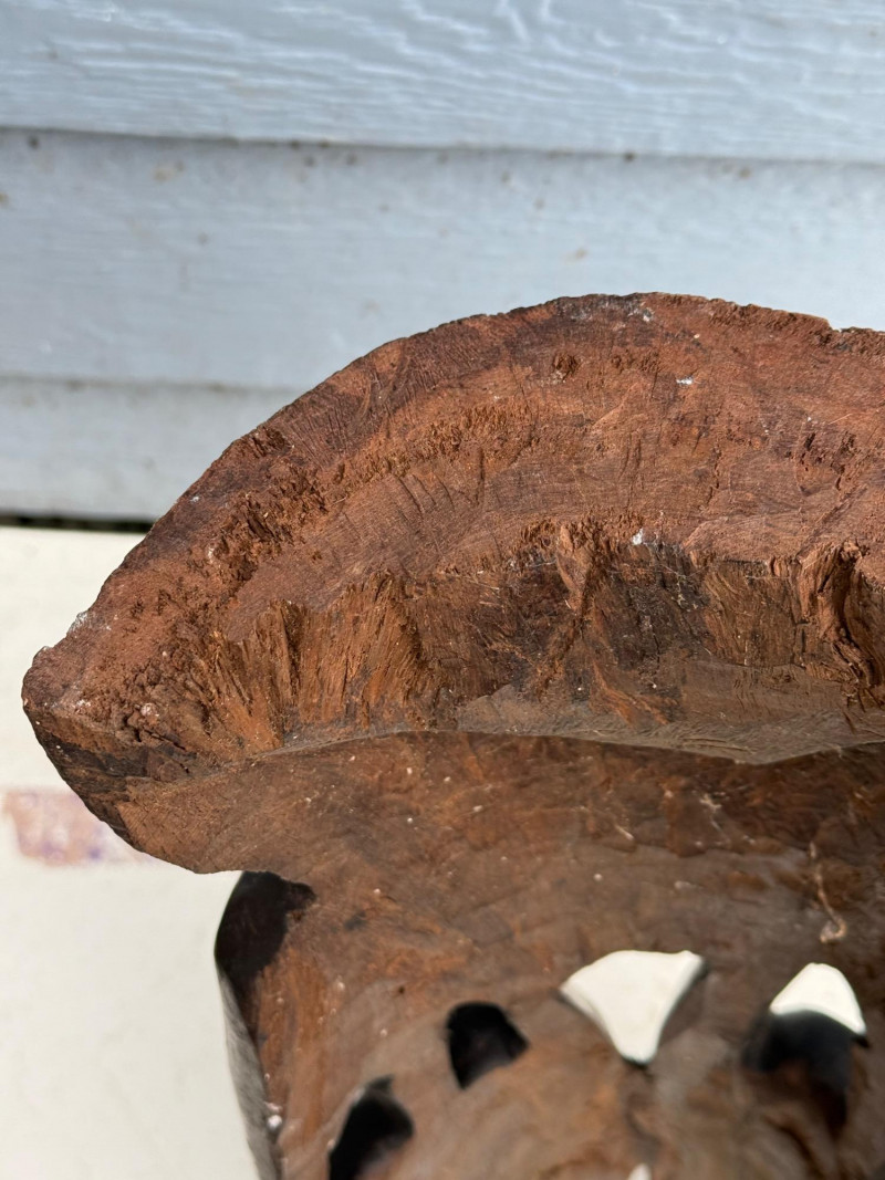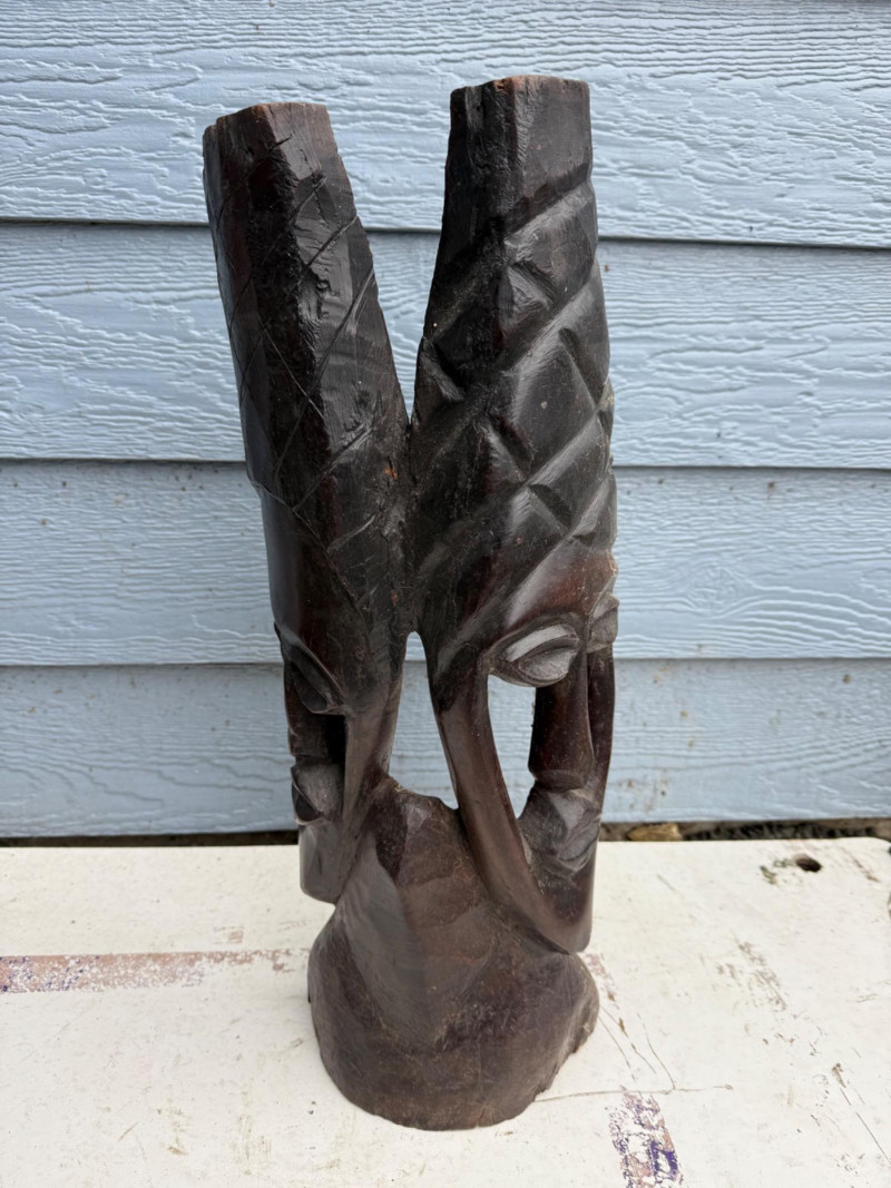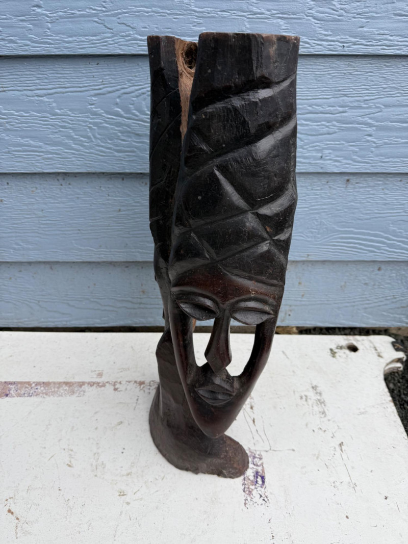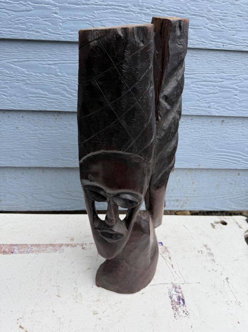Tribal Decor / Ethnographic Art A hand-carved wooden sculpture depicting a stylized human face with elongated features and abstract proportions. The piece is carved from a single block of dark hardwood, with deep-set eyes, a long nose, and a narrow mouth. The top of the head features intricate linear carvings, possibly representing hair, braiding, or a ceremonial headdress. The top edge is uneven, suggesting either intentional artistic finish or breakage. The overall form is vertical and mask-like, with a strong sculptural presence. Material: Solid carved hardwood Color: Deep brown with natural grain and patina Finish: Matte with visible tool marks and age wear Design Features: Elongated facial proportions with stylized symmetry Deeply carved eyes, nose, and mouth Top of head features linear carvings resembling braids or headdress Uneven top edge—possibly unfinished or broken Flat base for upright displayDetails