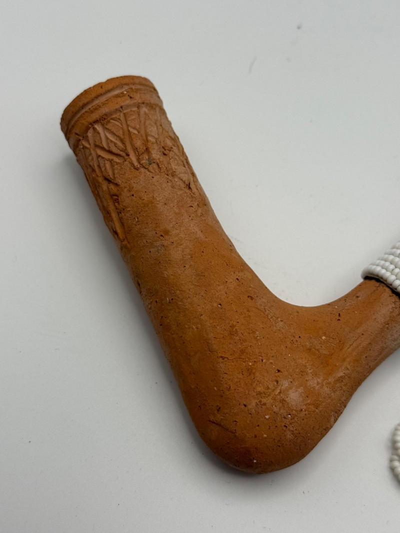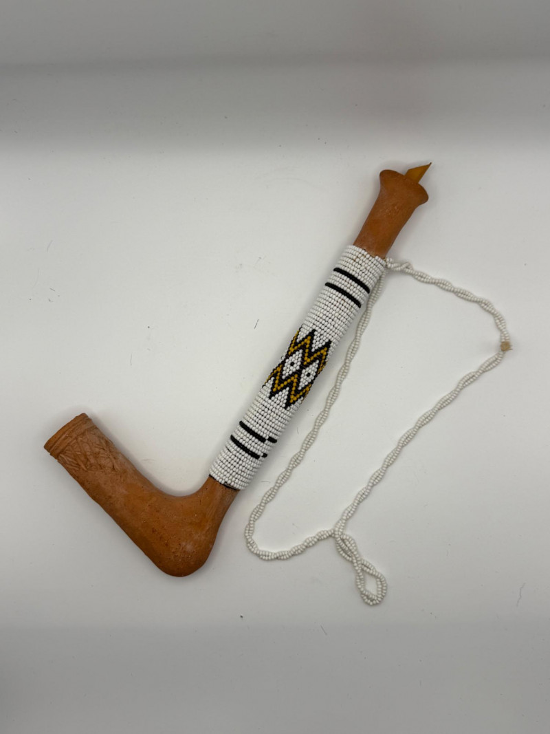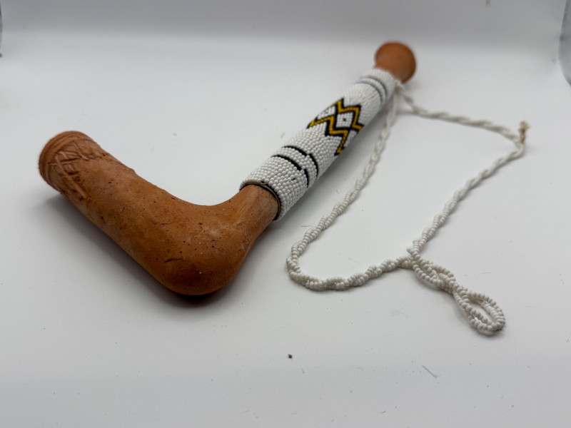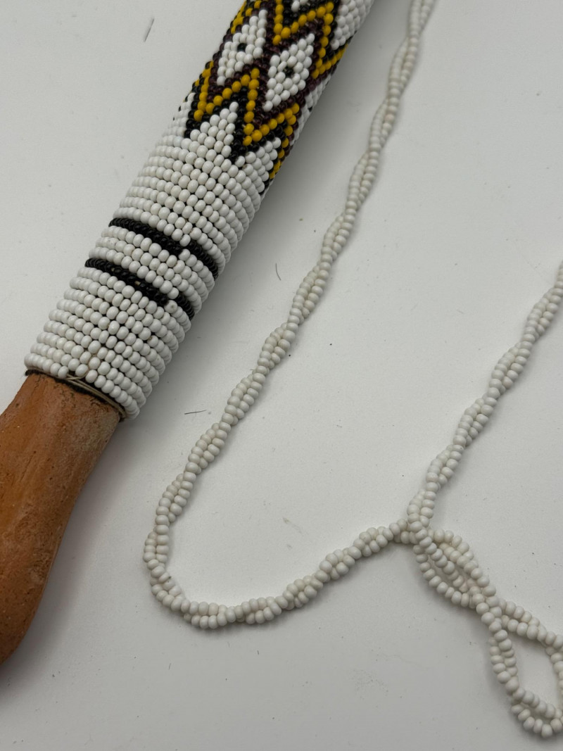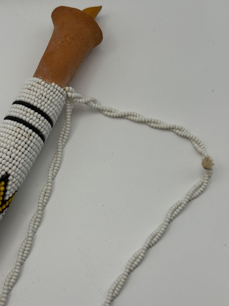 Xhosa Ceremonial Pipe: Beaded Symbol of Status and Tradition This handcrafted pipe reflects the cultural artistry of the Xhosa people of South Africa, where smoking pipes have long held ceremonial and social significance, particularly among elders and community leaders. Pipe Bowl: Made from a reddish-brown material, likely wood or clay, shaped with a traditional rounded bowl for holding tobacco or herbal mixtures. Stem: Elongated and slender, the stem is decorated with intricate beadwork, featuring: White beads with black and yellow zigzag patterns Horizontal black stripes for contrast and rhythm Beaded String: Attached to the pipe, possibly used for carrying, hanging, or symbolic adornment, adding both function and ornamentation. Ethnic Origin: Associated with the Xhosa people, one of South Africa’s major ethnic groups known for their rich oral traditions, beadwork, and ceremonial customs. Symbolism: Pipes like this are often used in rituals, storytelling gatherings, or rites of passage, symbolizing wisdom, status, and ancestral connection. Beadwork Significance: The patterns and colors may convey personal identity, clan affiliation, or spiritual meaning, as beadwork is a vital expressive medium in Xhosa culture. Craftsmanship: Combines functional design with decorative artistry, showcasing traditional techniques passed down through generations. Collectibility: Valued by collectors of African ethnographic art for its authenticity, symbolism, and regional specificity.Materials and Construction