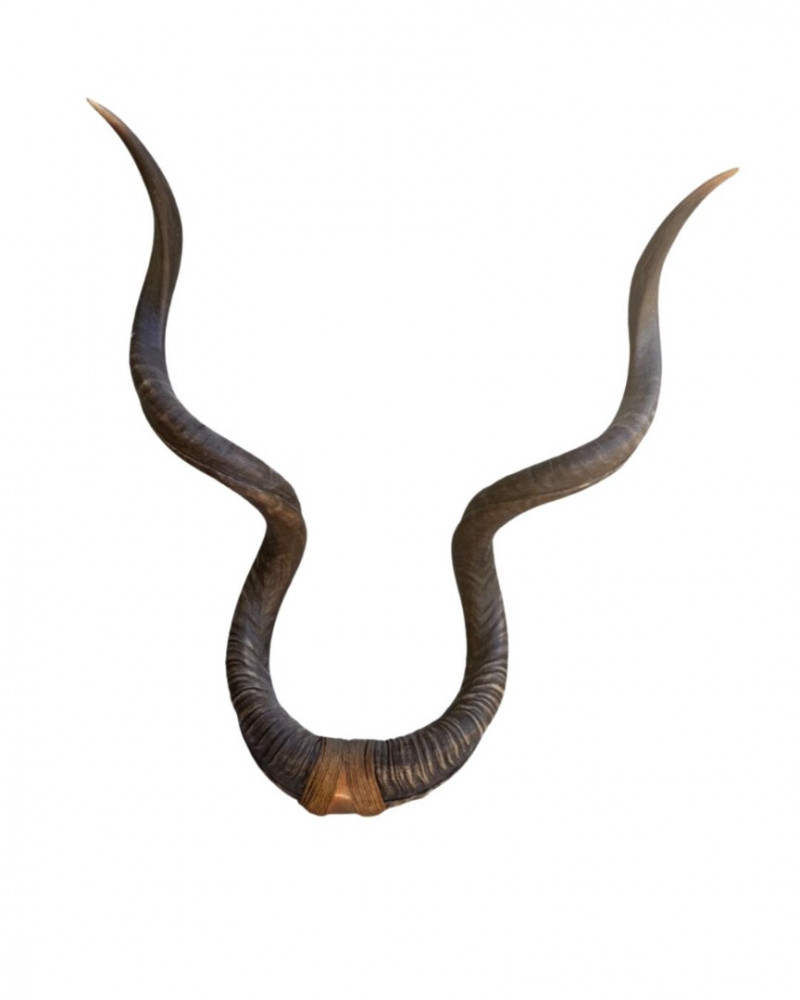 A dramatic pair of African kudu horns, mounted together at the base and presented as a sculptural display. The horns are dark brown with a natural spiral curvature, tapering to pointed tips. Their textured surface showcases ridged growth rings and natural sheen. The base is wrapped in tan leather or twine, providing both structural support and a rustic finish. This piece is ideal for wall mounting or tabletop display in safari-themed interiors or ethnographic collections. Please Note-One antler is coming loose from mount Species: Greater Kudu (Tragelaphus strepsiceros) Material: Natural horn; leather or twine wrap at base Details