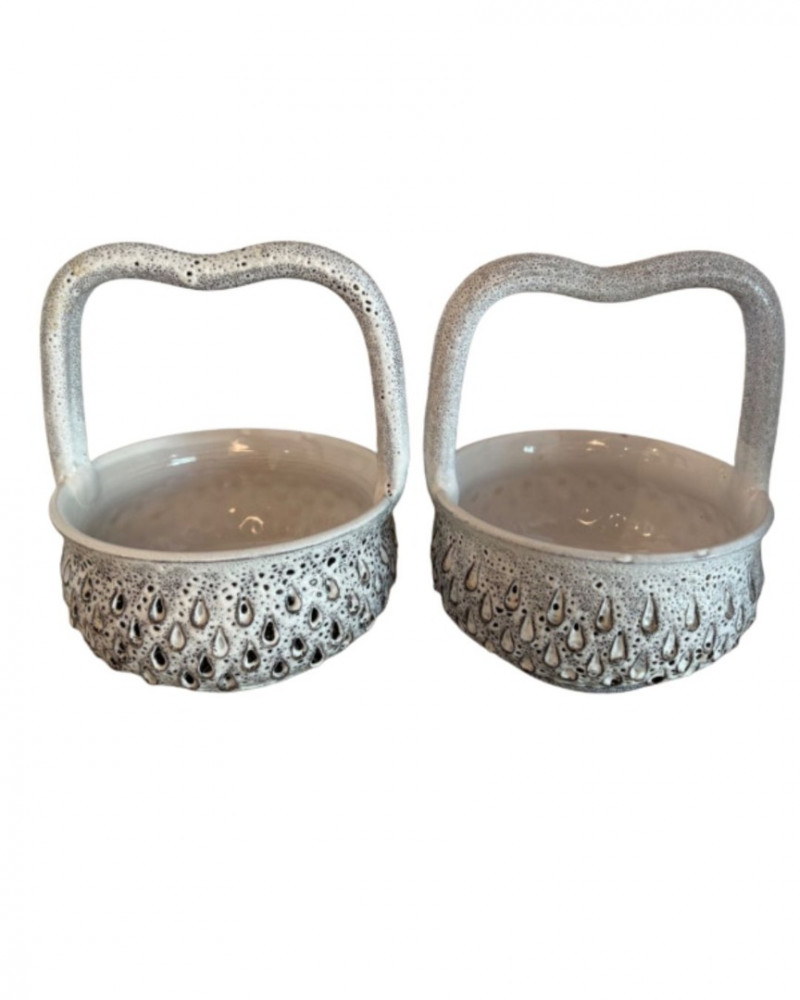 Italian Studio Pottery / Sculptural Serveware A matched pair of white ceramic baskets made in Italy, each featuring a thick, curved handle and a textured surface adorned with raised teardrop and circular patterns. The bodies are symmetrical and sculptural, with a matte-satin glaze that highlights the relief work. The handles are integrated into the rim and mirror the body’s texture, creating a cohesive and tactile design. Origin: Made in Italy Material: Glazed ceramic Color: White with matte-satin finish Surface: Textured with raised teardrop and circular motifsDetails