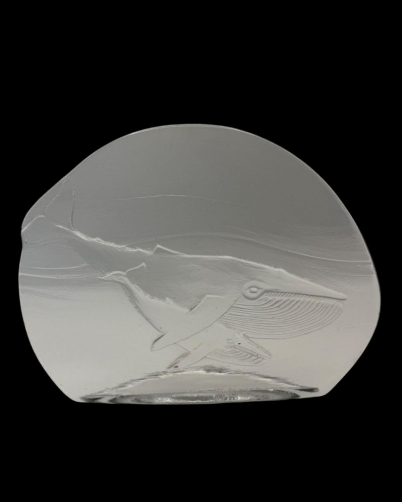 A freestanding clear glass sculpture designed by Don Shepherd for Blenko Glass Company, featuring an etched depiction of a humpback whale in motion. The whale is rendered in a dynamic underwater pose, with detailed flippers, tail flukes, and baleen plates. The glass form is smoothly curved and polished, allowing the etched marine scene to appear suspended within. This piece reflects Shepherd’s architectural design sensibility and Blenko’s legacy of handcrafted American glass. Designer: Don Shepherd (Blenko, 1974–1988) Maker: Blenko Glass Company Material: Clear glass with etched detailing Color: Transparent with frosted etching Design Features: Humpback whale in swimming pose Detailed flippers, tail, and baleen Smooth, curved glass form with polished edges Freestanding design with flat baseDetails