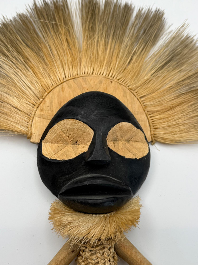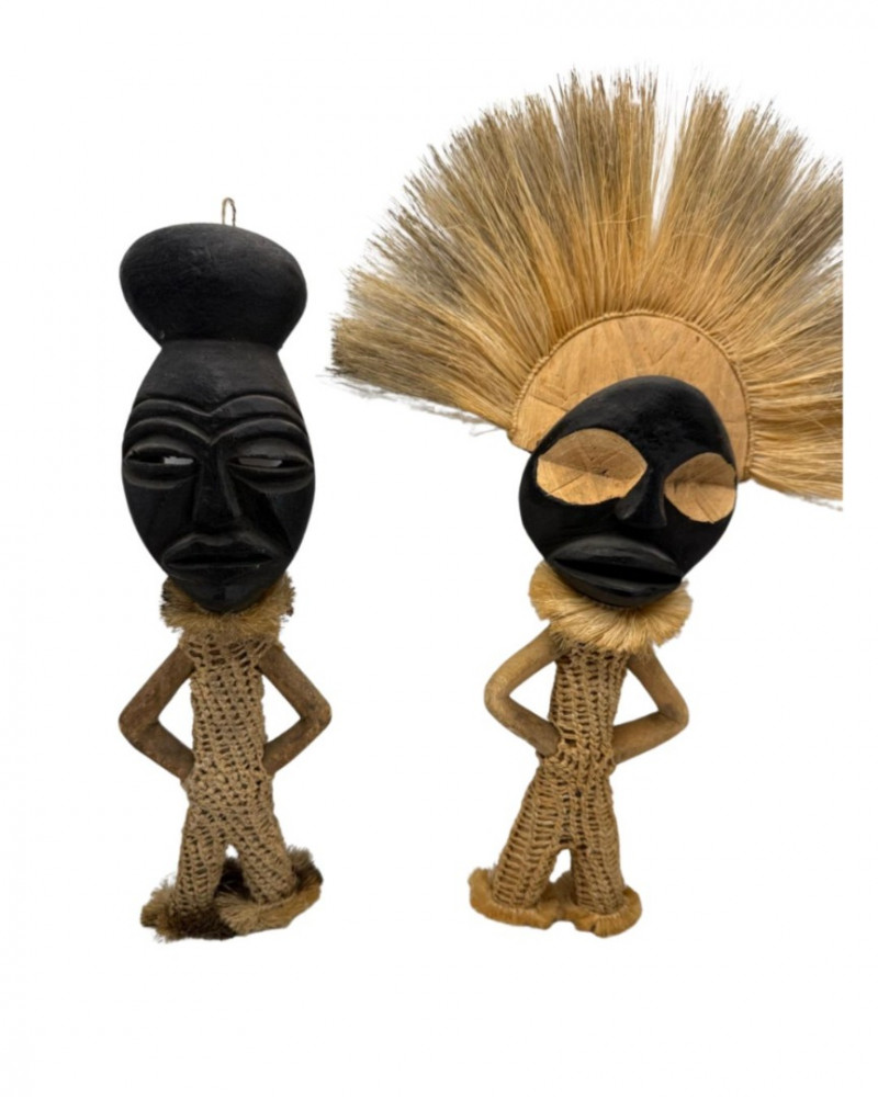 Pair of vintage African tribal figures featuring carved black faces and natural fiber bodies. One wears a rounded headpiece, the other a dramatic fan-shaped straw headdress. Both figures stand with hands on hips in traditional posture. These pieces were collected from Kenya and reflect regional craftsmanship and ceremonial styling. Material: Carved wood, straw, and woven fiber Age: Mid to late 20th century Style: East African tribal with ceremonial headdress and posture Important Details: Set of 2; sourced from Kenya; approx. 12" H each; excellent condition