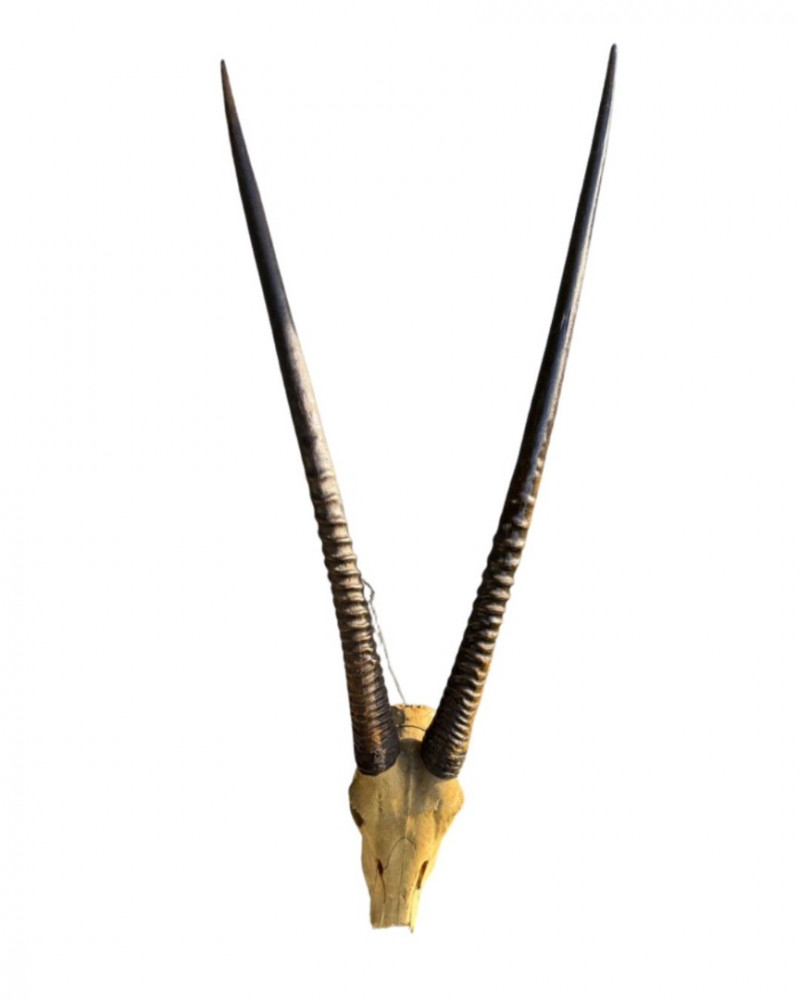 A dramatic skull of an African antelope—likely gemsbok or sable—featuring two long, straight horns with subtle spiral ridging. The horns rise symmetrically from the skull, tapering to sharp points and showcasing natural growth rings and texture. The skull is light-toned bone with prominent anatomical features including eye sockets, nasal cavity, and jawline. A simple hook is affixed to the back, allowing for easy wall display without a formal mount. Ideal for rustic or safari-themed interiors. Species: Likely African antelope (Gemsbok, Sable, or similar) Material: Natural bone and horn Color: Horns: Deep brown to black Skull: Pale ivory bone Design Features: Spiral horns with ridged texture and pointed tips Anatomically complete skull with clean bone surface Hanging hook affixed to back for wall display No base or mount; designed for vertical presentationDetails