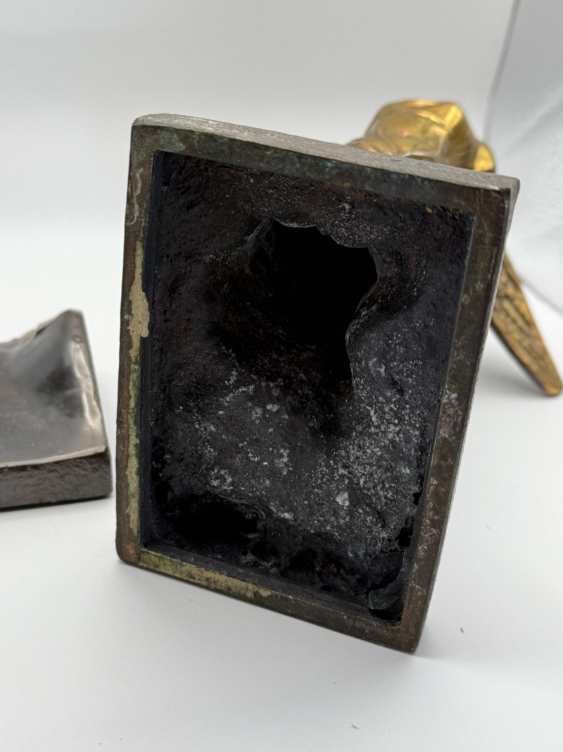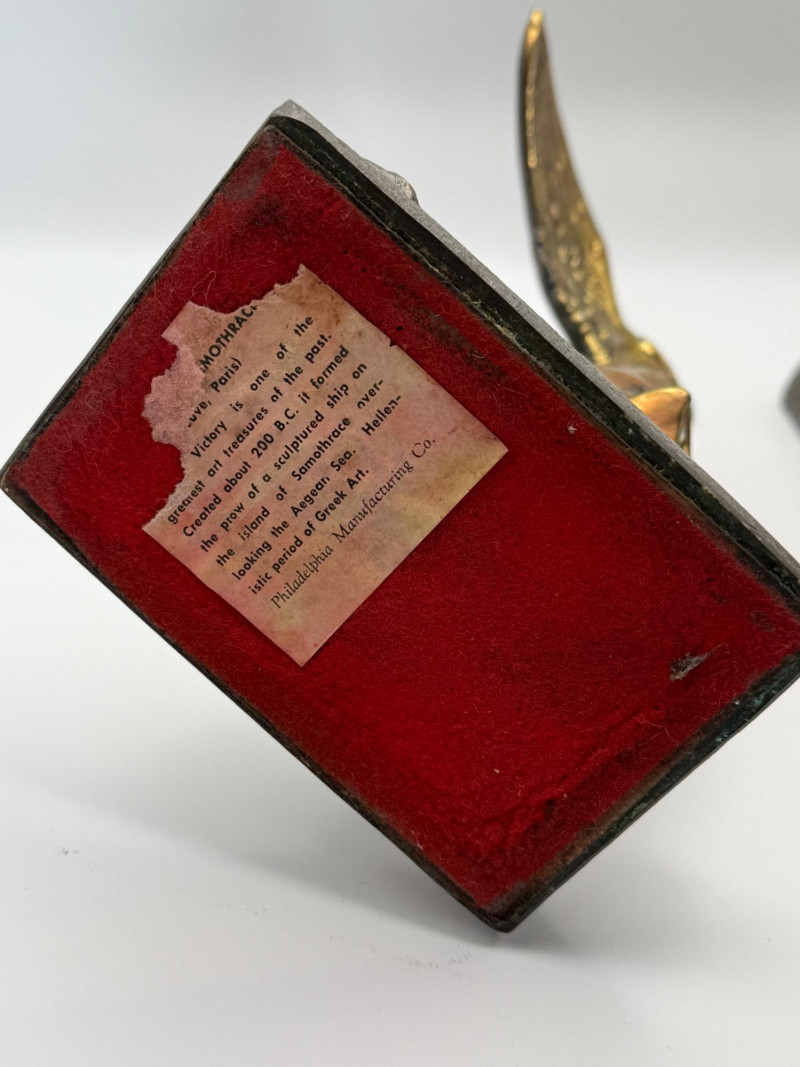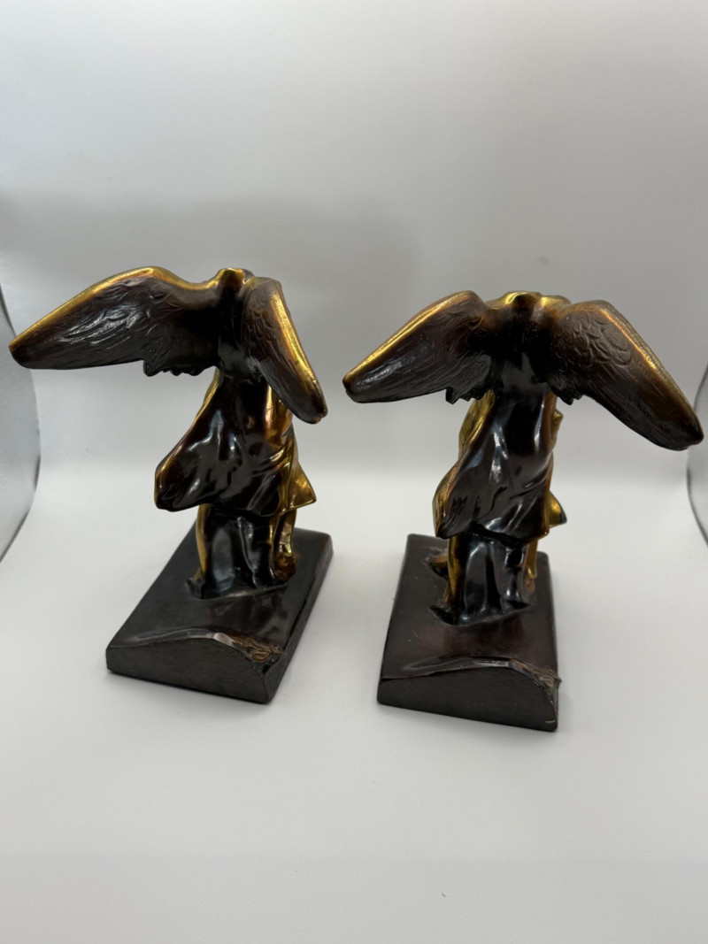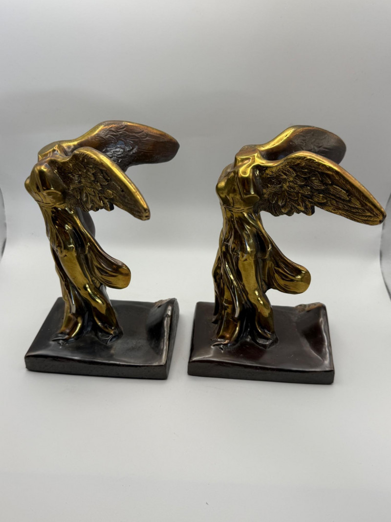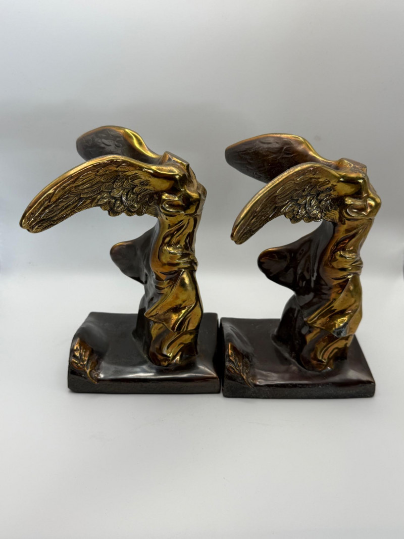 Winged Victory of Samothrace Bookends: Bronze-Toned Replicas of Hellenistic Grace This pair of sculptural bookends features miniature reproductions of the Winged Victory of Samothrace, also known as Nike of Samothrace, a celebrated Hellenistic statue dating to the 2nd century BCE. The original, housed in the Louvre, is renowned for its dynamic form and expressive drapery. Material: Cast in a bronze-colored composite or metal, giving the pieces a classical patina and weight suitable for functional display. Form: Each figure is headless and armless, consistent with the original statue’s fragmentary condition. The wings are fully extended, and the garments appear wind-swept, conveying motion and triumph. Base: Mounted on rectangular plinths, allowing the sculptures to serve as stable bookends while preserving their sculptural integrity. Origin of Design: The Nike of Samothrace was created to commemorate a naval victory and is considered a masterpiece of Hellenistic sculpture for its dramatic pose and mastery of form. Symbolism: Nike, the Greek goddess of victory, represents triumph, movement, and divine favor, making these bookends not only decorative but symbolically resonant. Function: Ideal for classical-themed interiors, libraries, or collectors of Greco-Roman art, these bookends blend aesthetic refinement with practical use.Design and Features