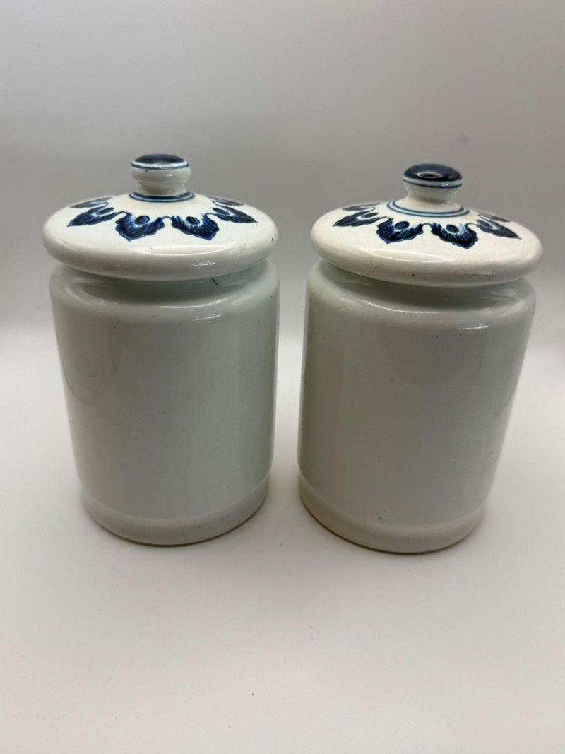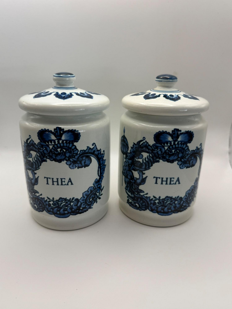 A matched pair of vintage Delft ceramic tea jars, each labeled “THEA”—the Latin and Greek word for tea—within a central decorative cartouche. These jars are adorned with classic cobalt blue floral and ornamental scrollwork, hand-applied in the traditional Dutch style. Each jar includes a matching lid with coordinating blue designs, and both feature a cylindrical form with slightly flared rims. Produced in the iconic Delftware tradition, these pieces reflect the elegance and utility of historical European kitchen ceramics. Origin: Delft, Netherlands Material: Glazed ceramic Color Scheme: White base with cobalt blue decoration Design Features: “THEA” printed in capital letters within a central frame Ornate floral and scroll motifs in traditional Delft blue Matching ceramic lids with coordinating patterns Cylindrical body with slightly flared rimDetails